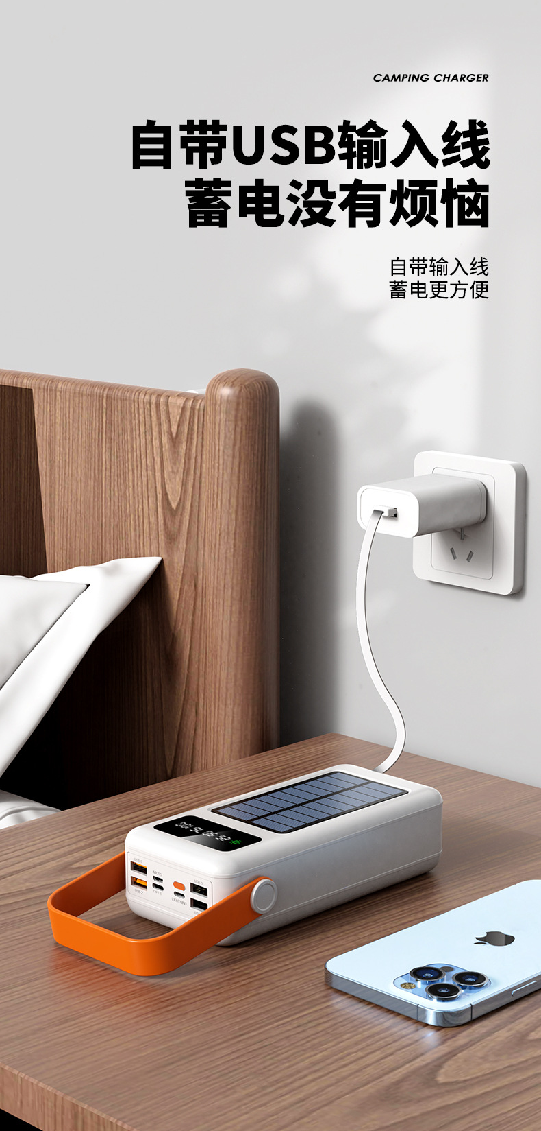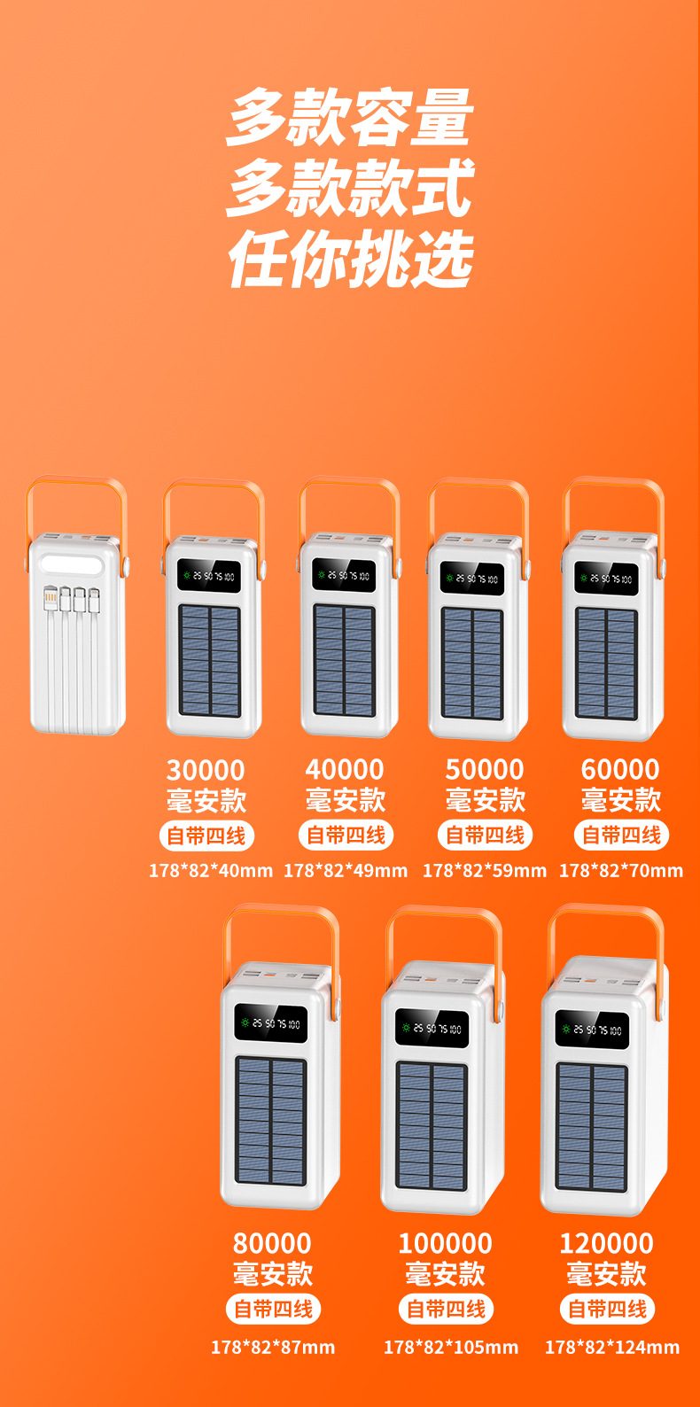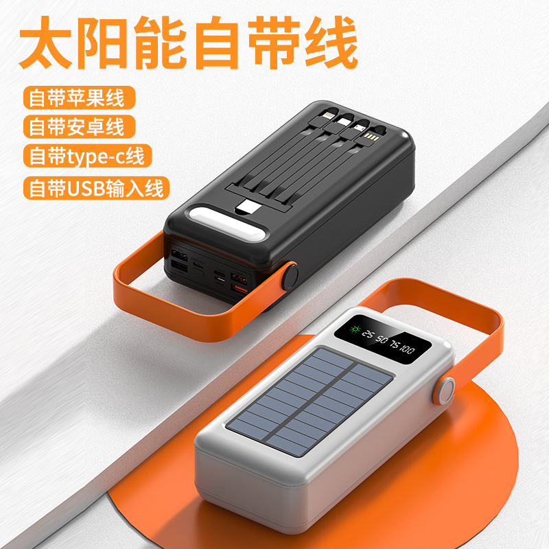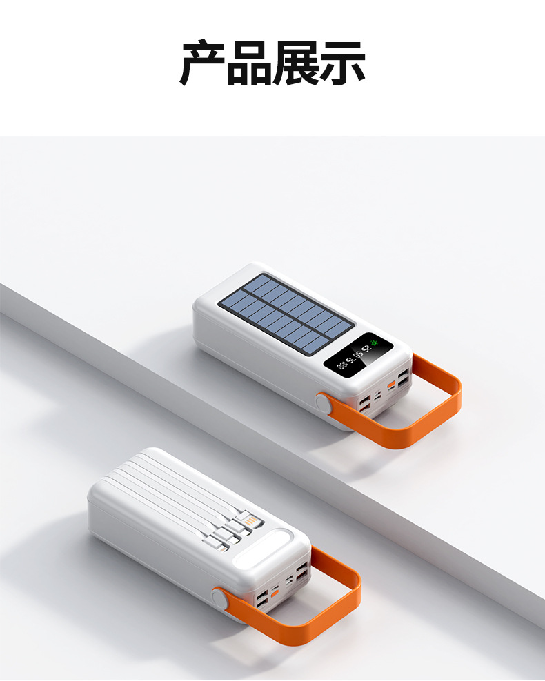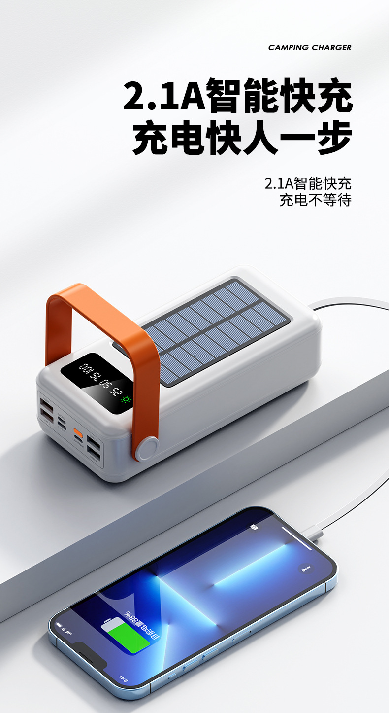 跨境户外大容量自带线太阳能充电宝80000毫安带LED灯移动电源照明