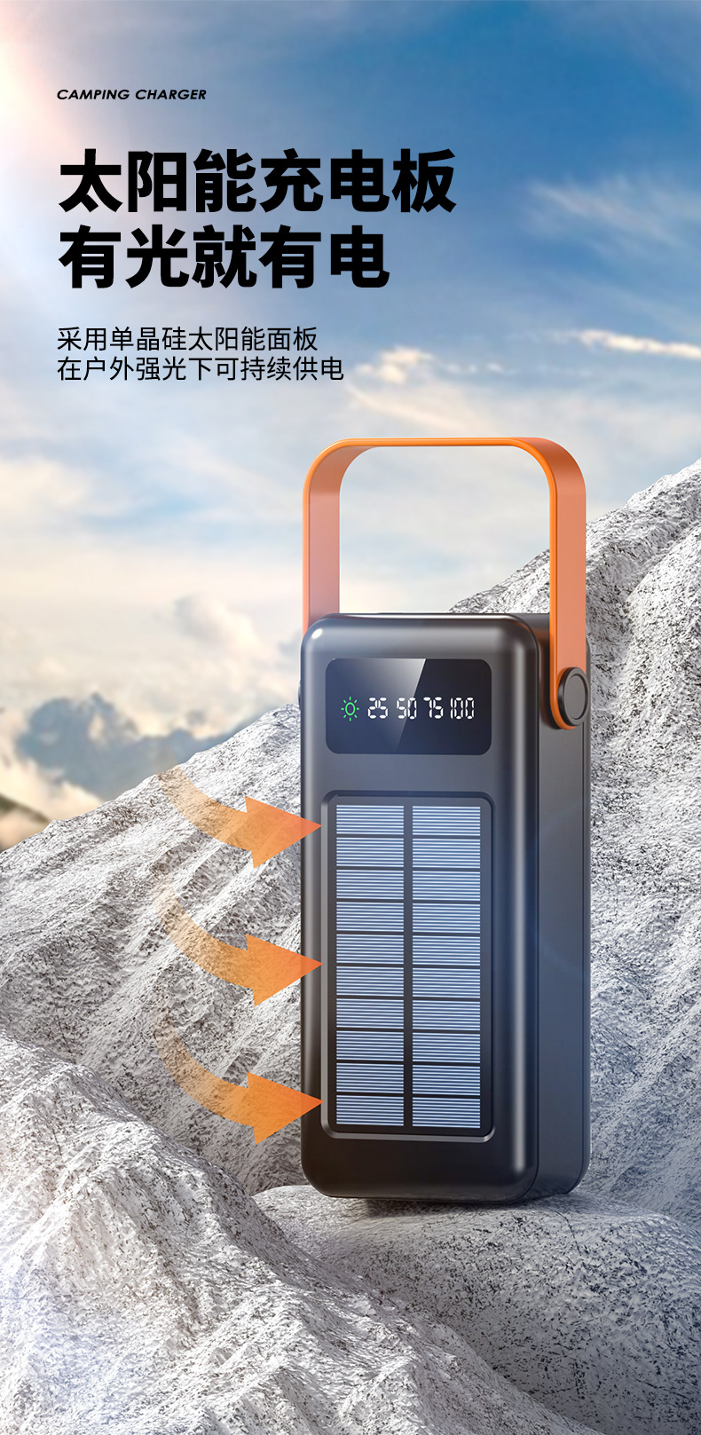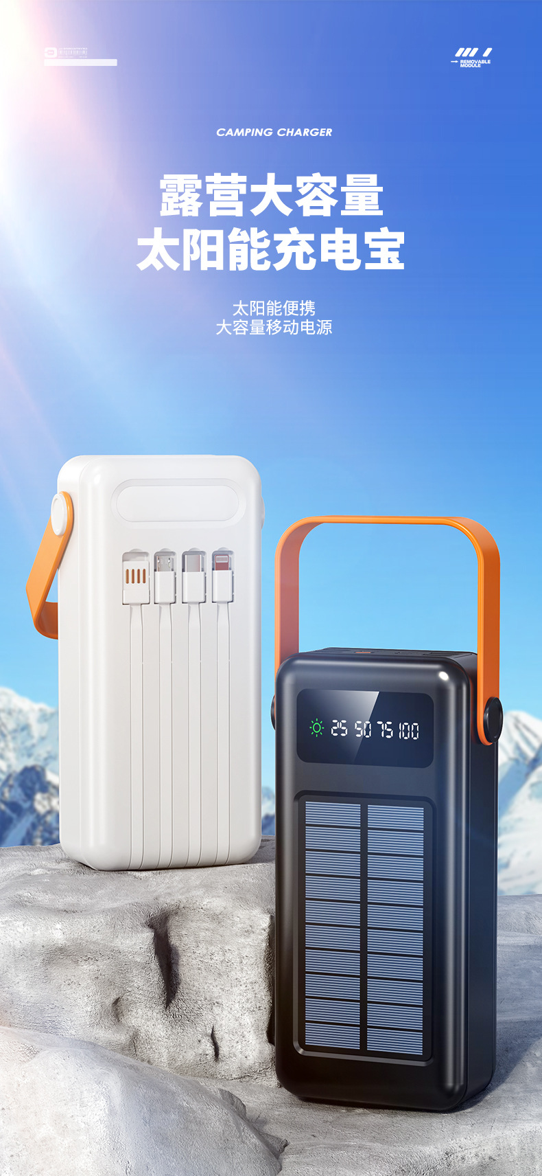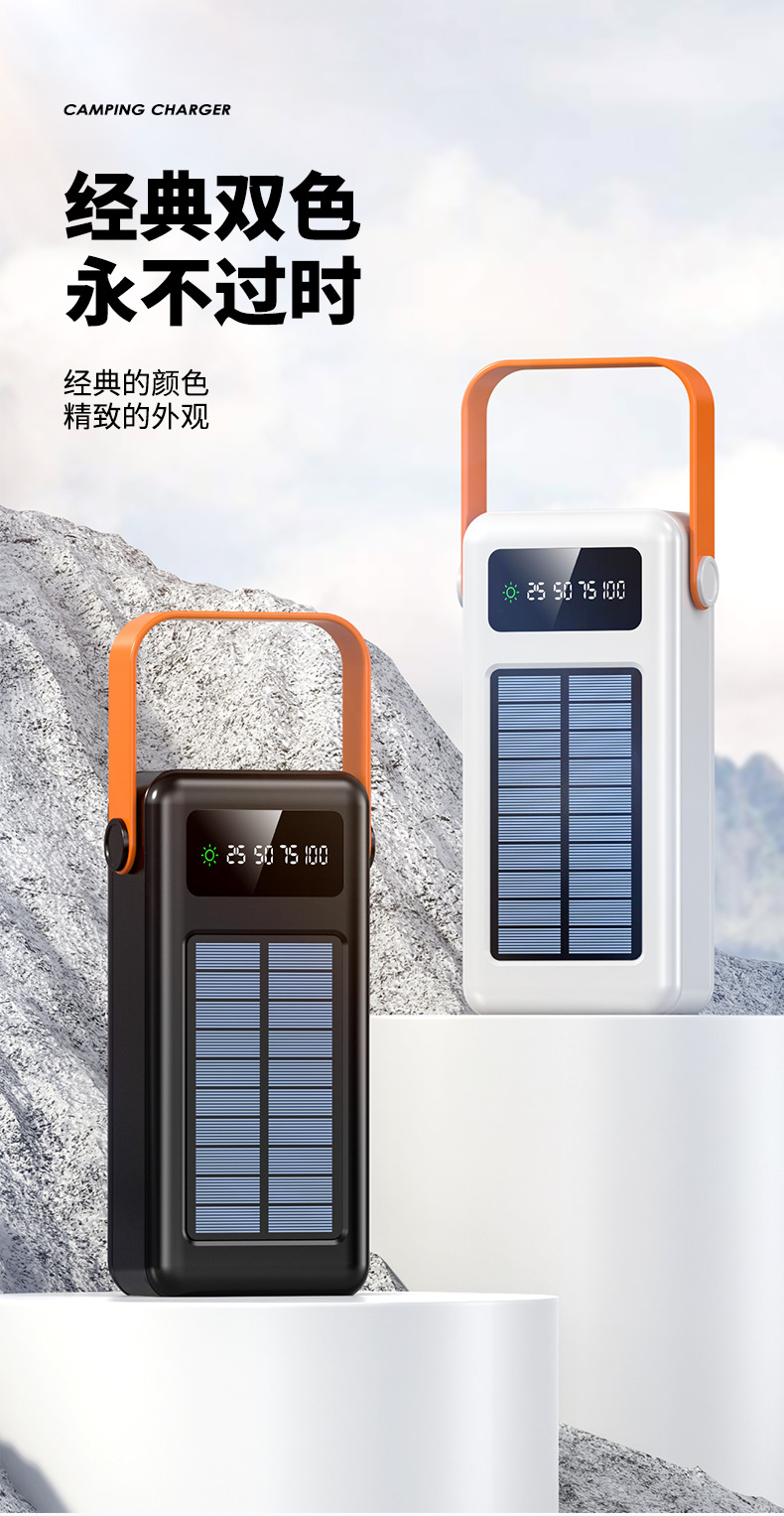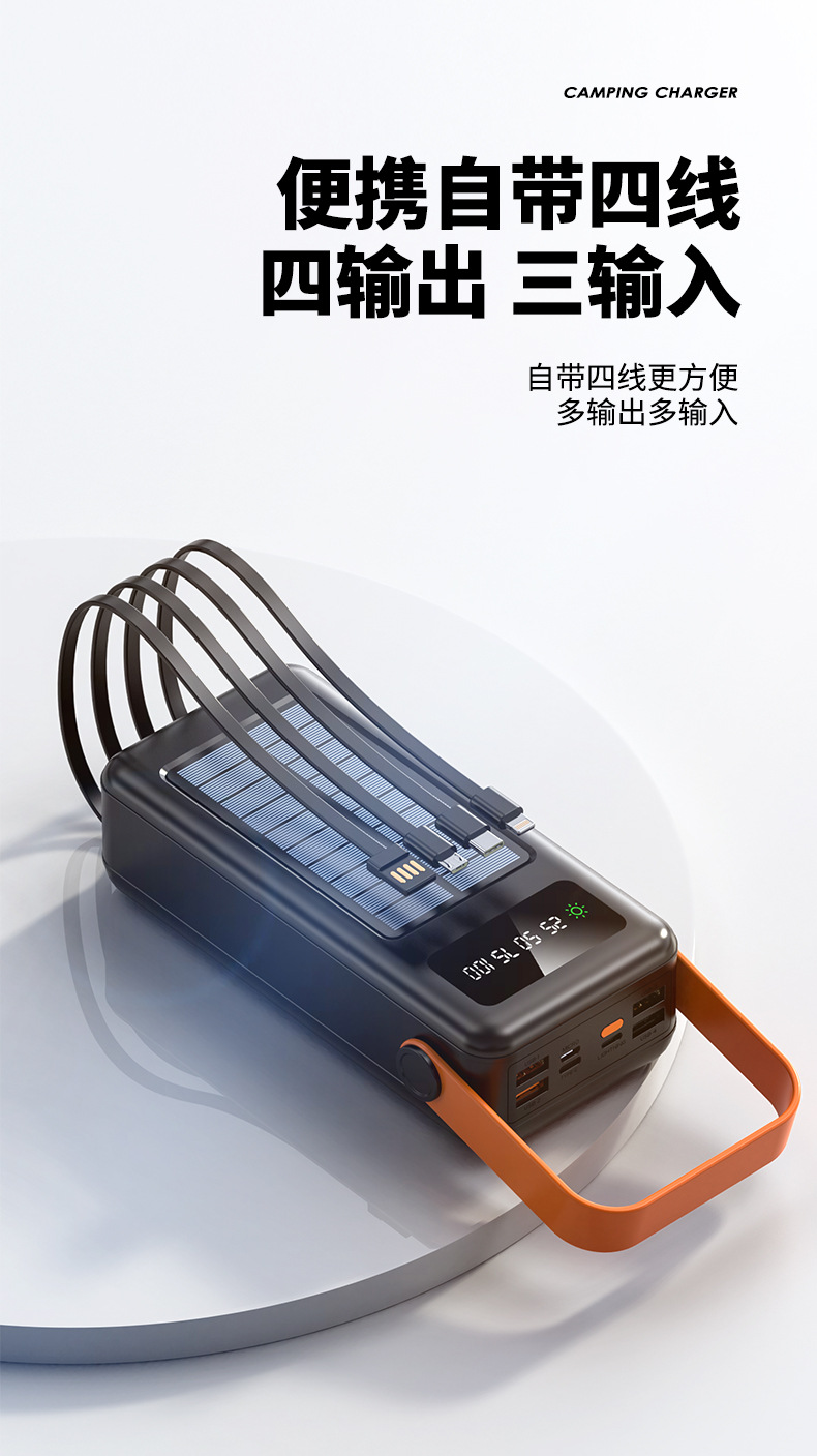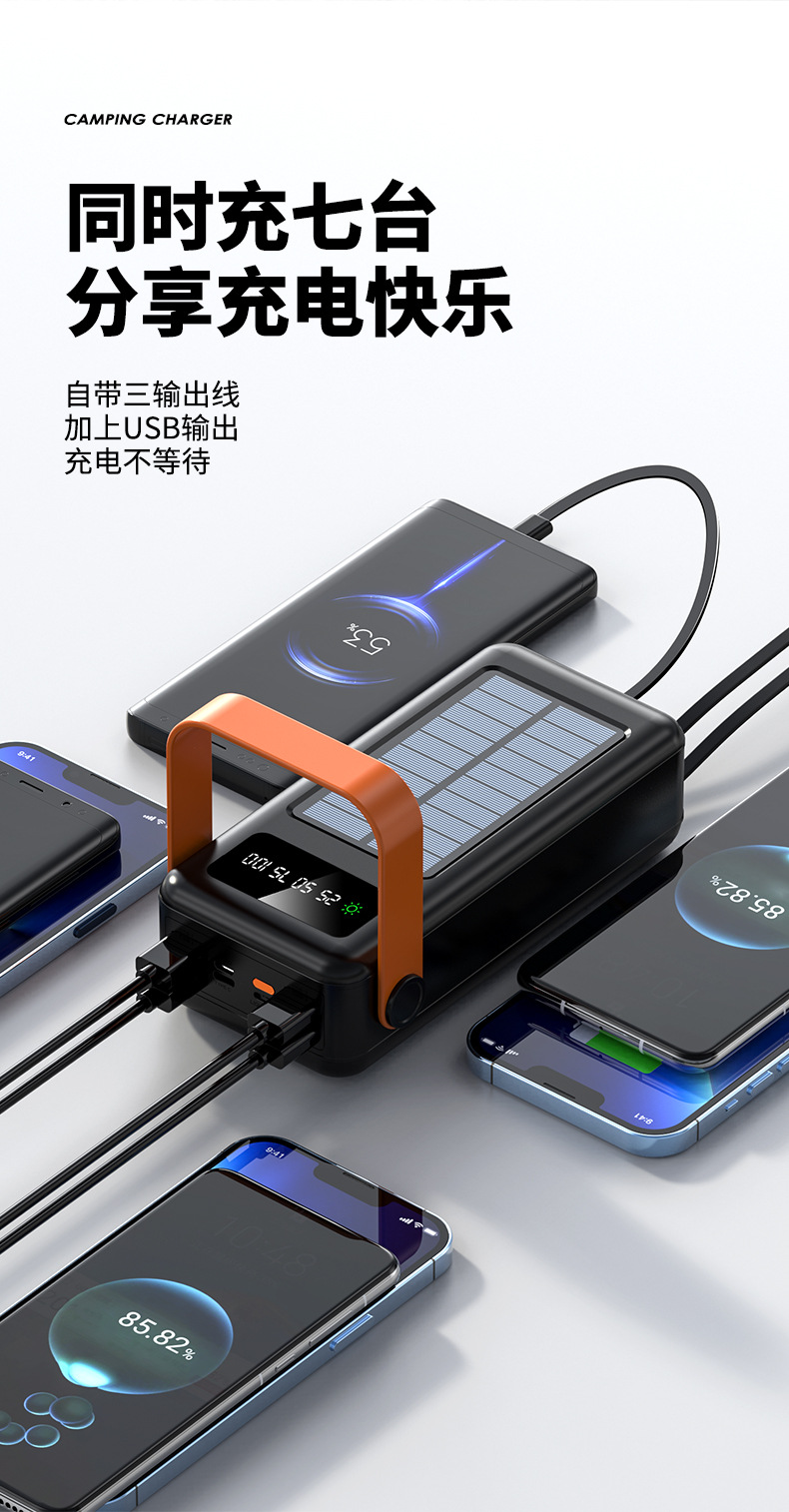 跨境户外大容量自带线太阳能充电宝80000毫安带LED灯移动电源照明