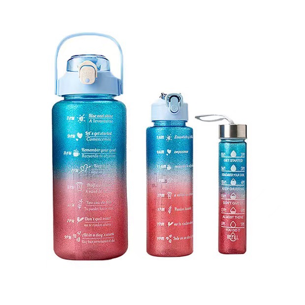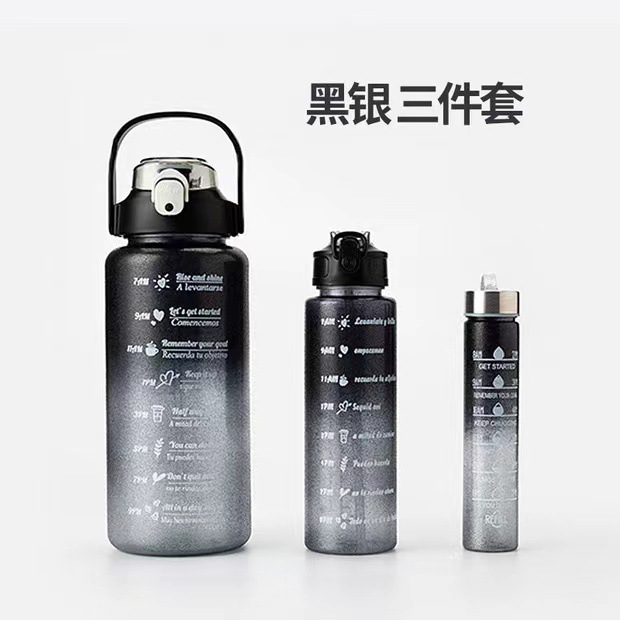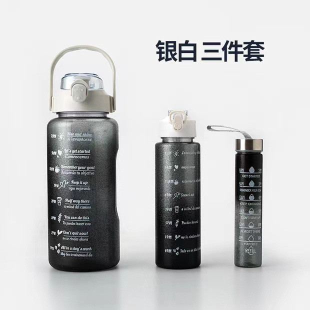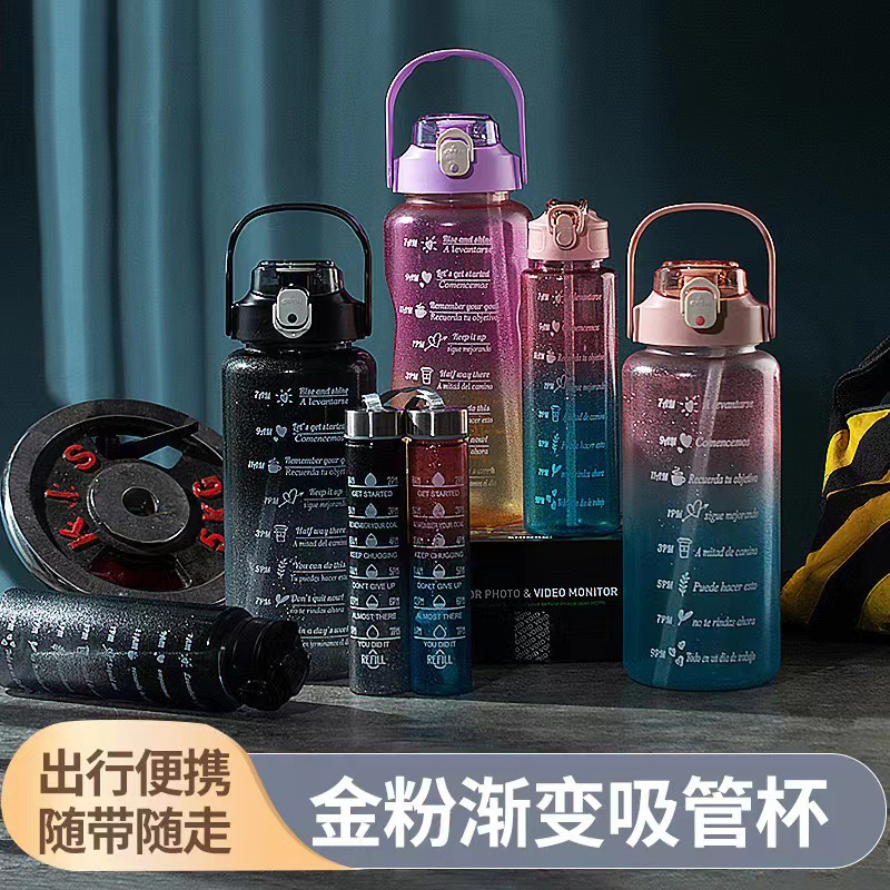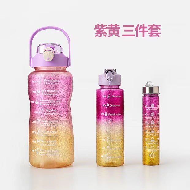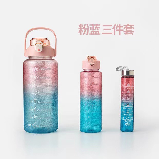 大水壶三件套网红杯子2000ml大容量运动水壶金粉渐变塑料水瓶