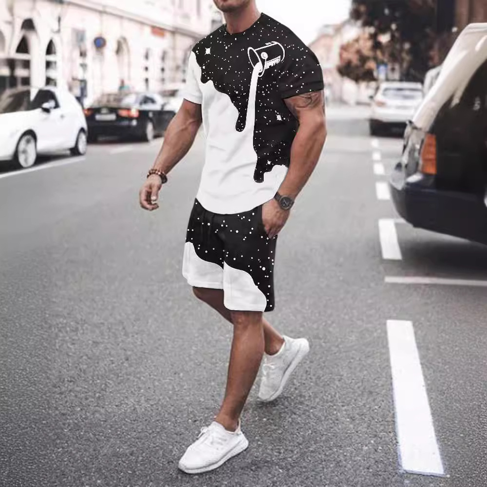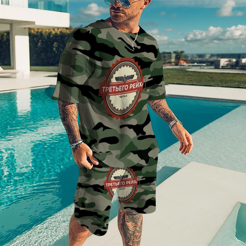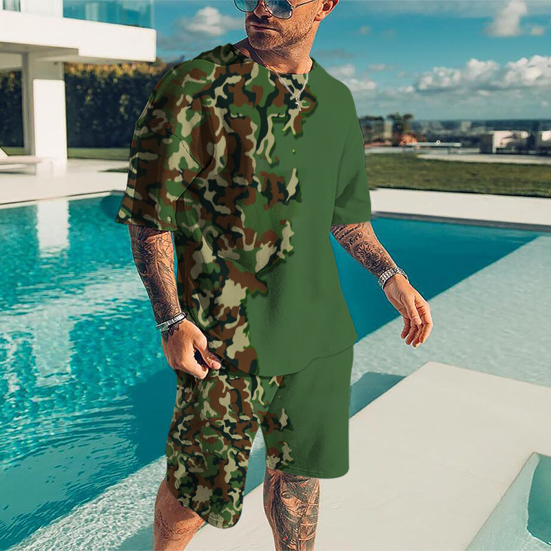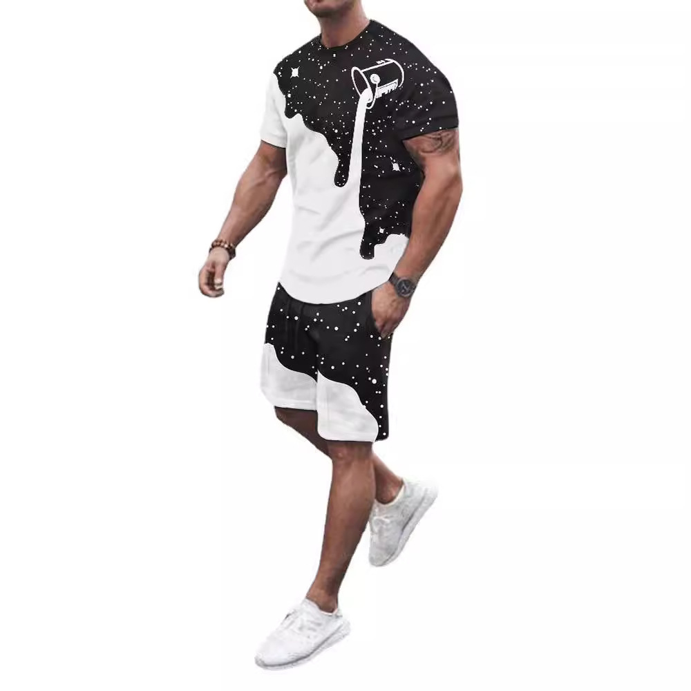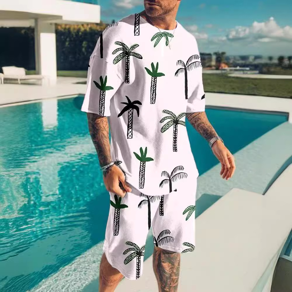 2024跨境外贸新款3D数码印花男T恤运动套装休闲短袖短裤套装沙滩