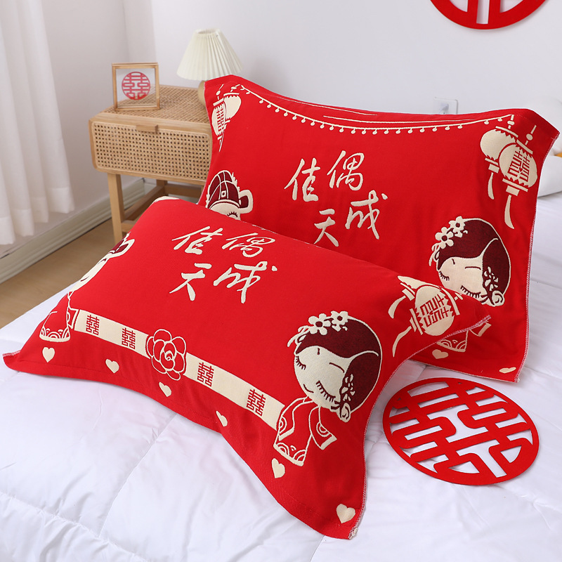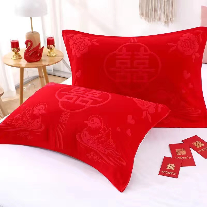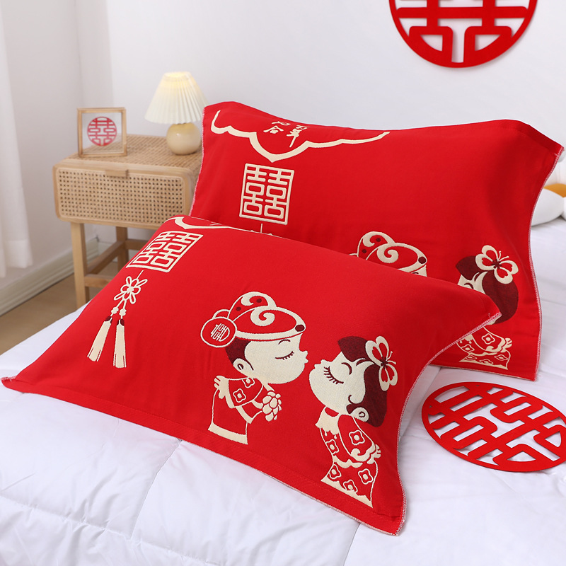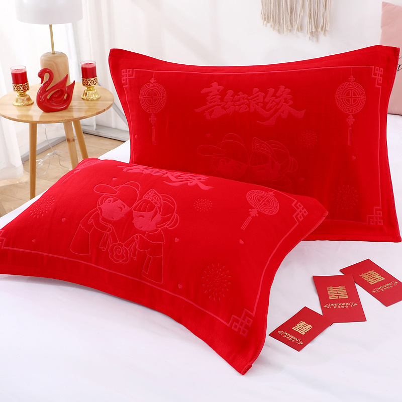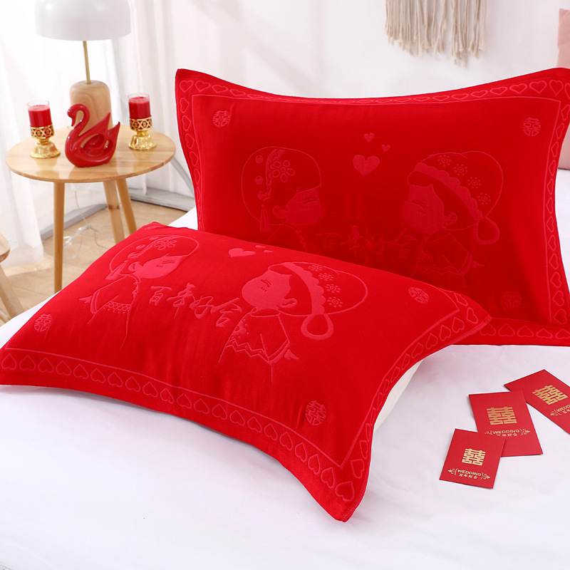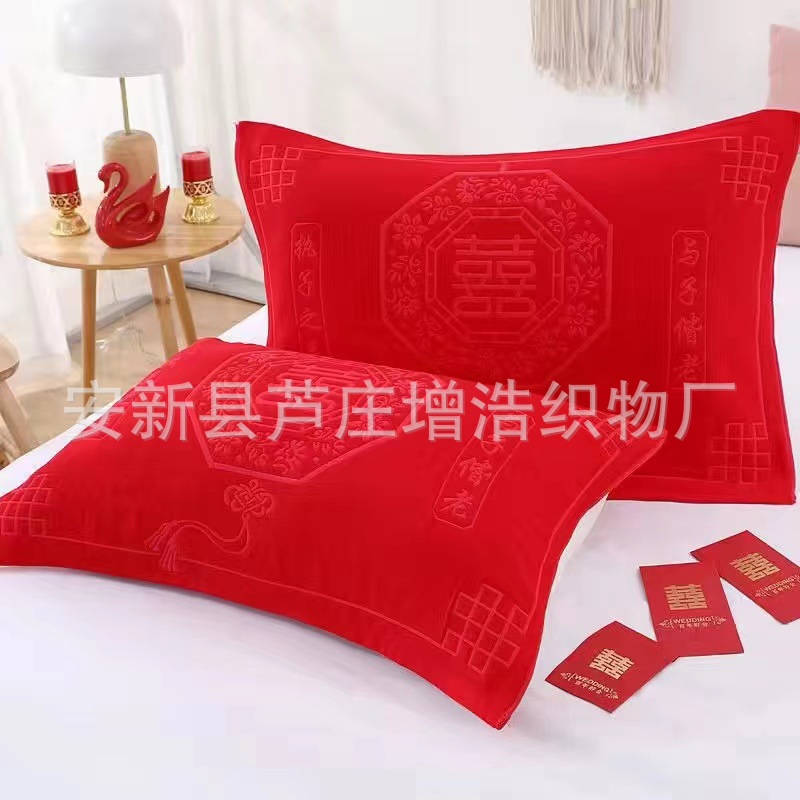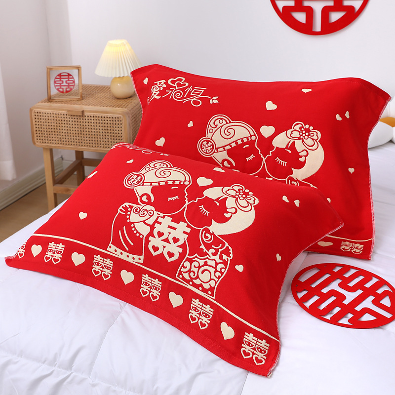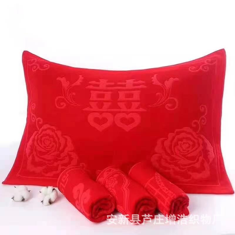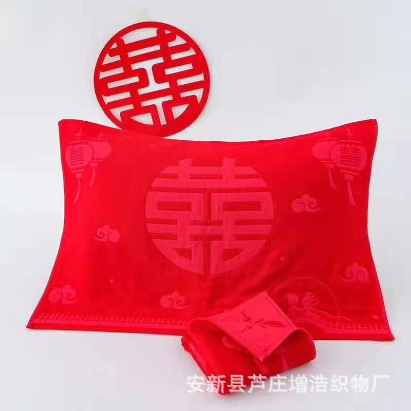 大红婚庆枕巾53*80大款厚纱布婚庆情侣枕巾喜字回礼枕巾批发