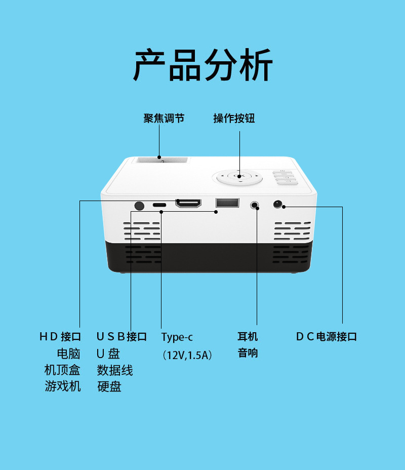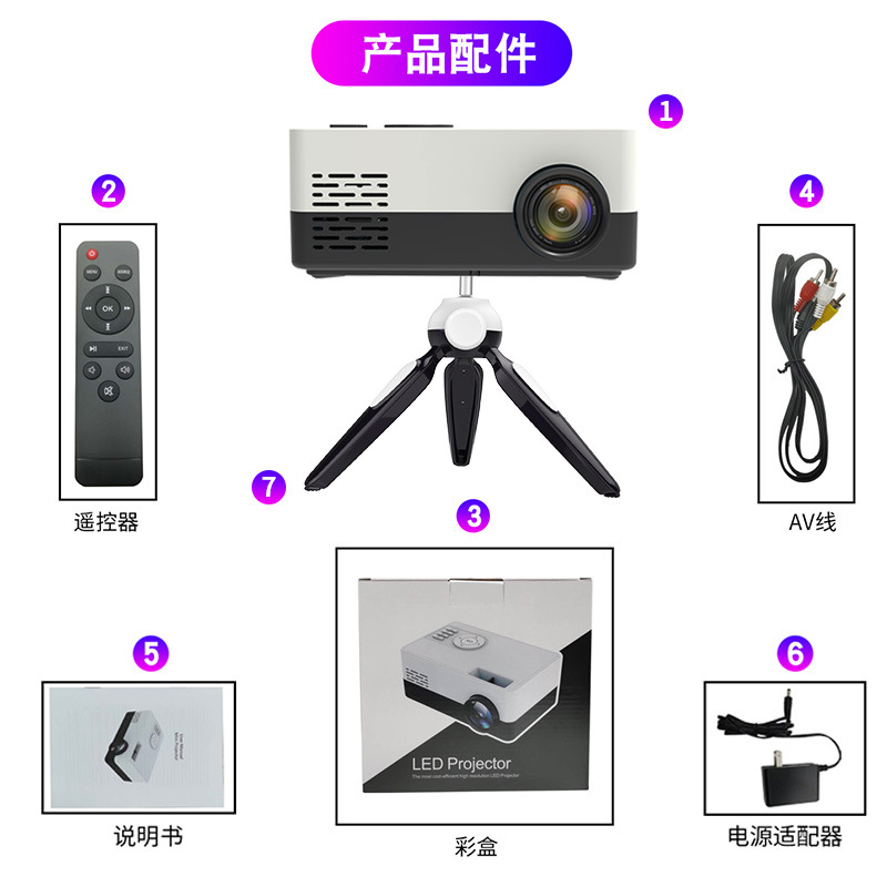 装箱配件:说明书X1 电源适配器X1 A线X1 遥控器X1 投影支架:x1