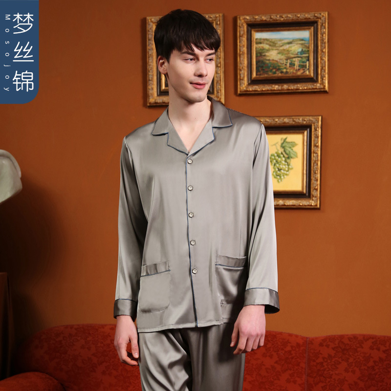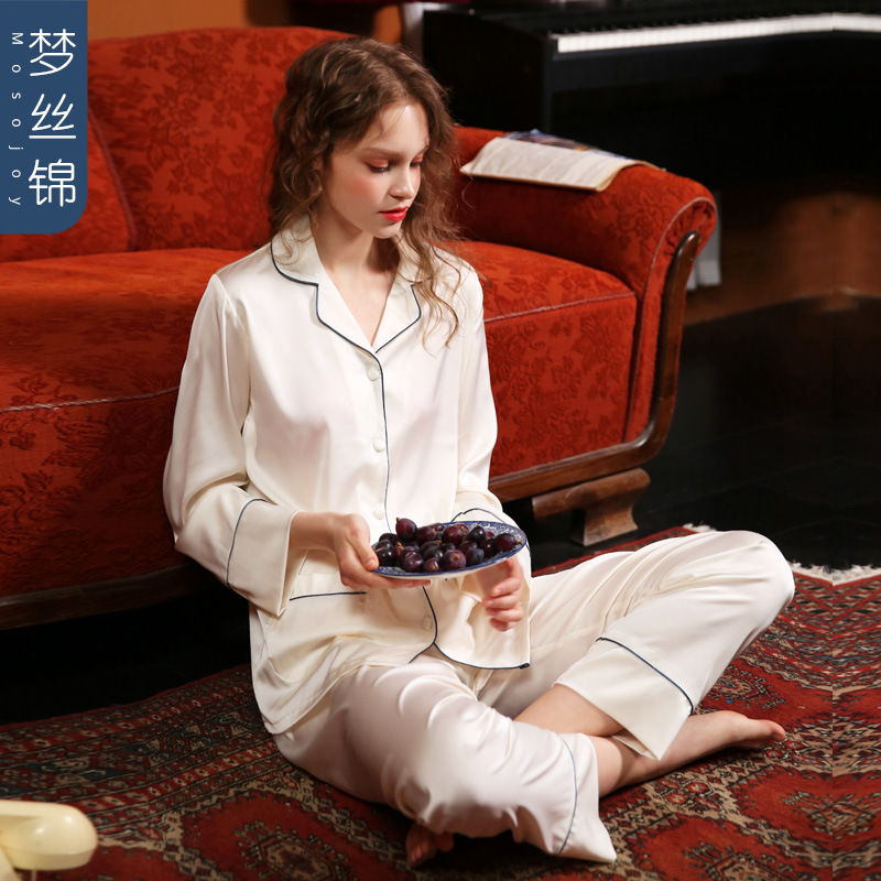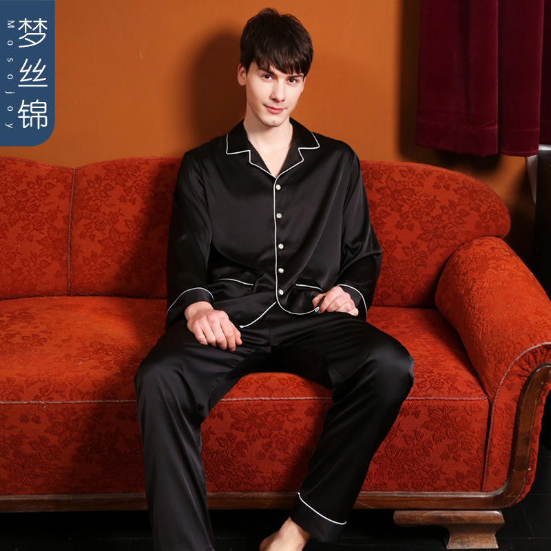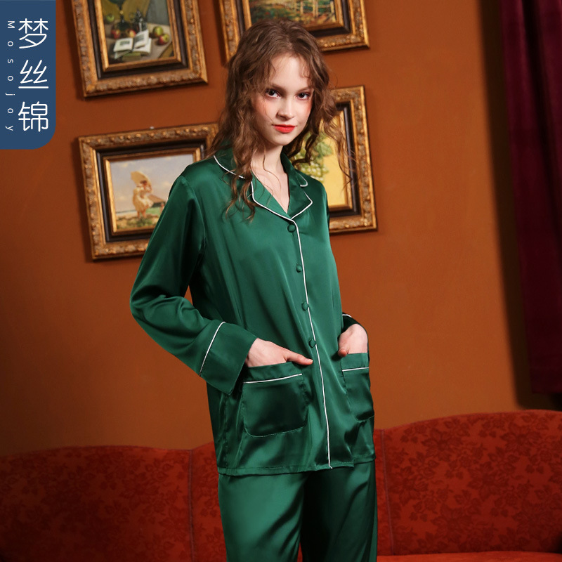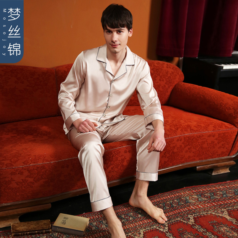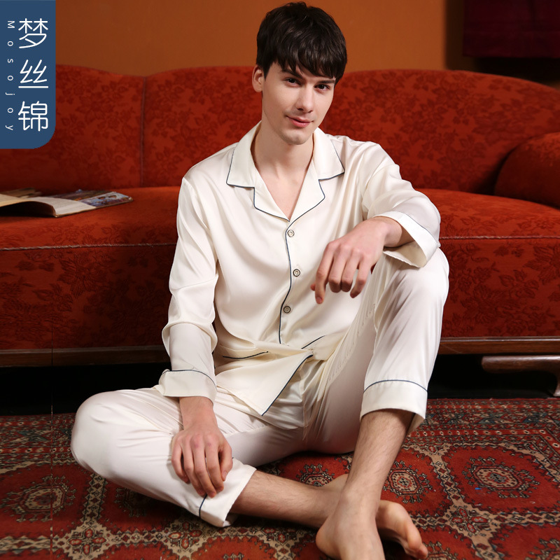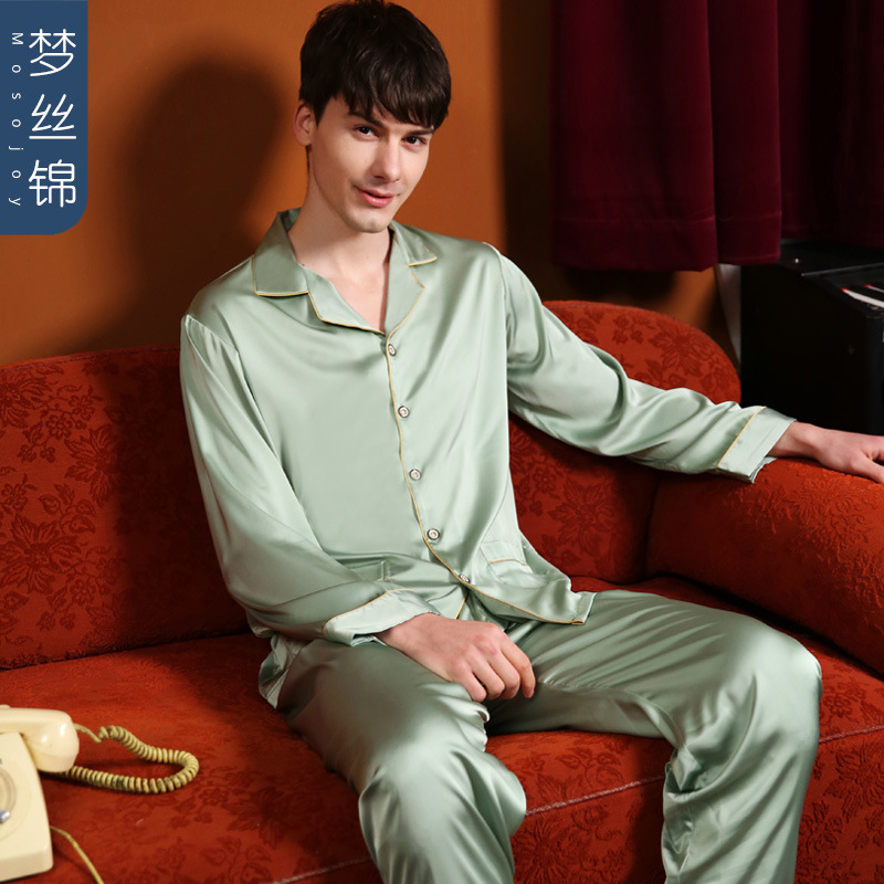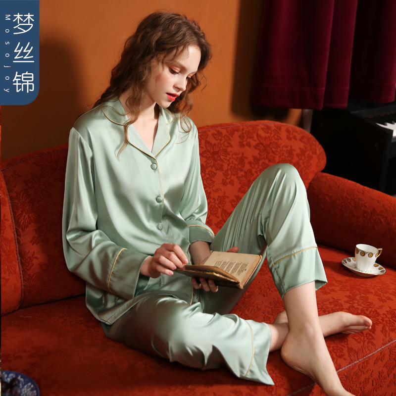 情侣新款睡衣女士仿真丝绸薄男士翻领长袖长裤春秋夏季家居服冰丝