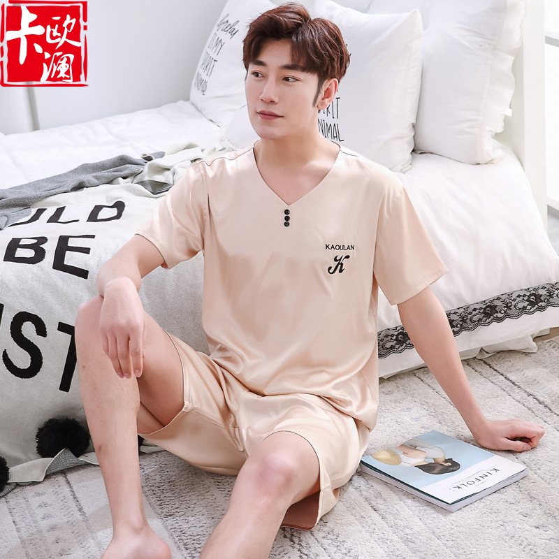 情侣睡衣女夏季冰丝短袖短袖套装春秋外穿男士大码仿真丝绸家居服