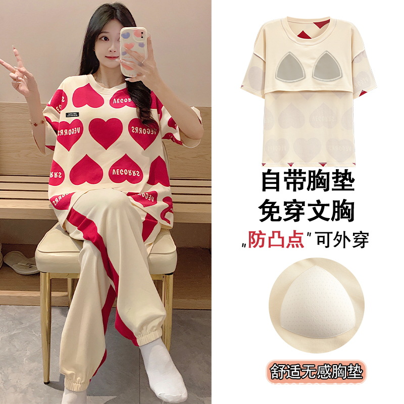 短袖长裤睡衣女士夏季棉质带胸垫薄款半袖休闲可出门家居服夏套装