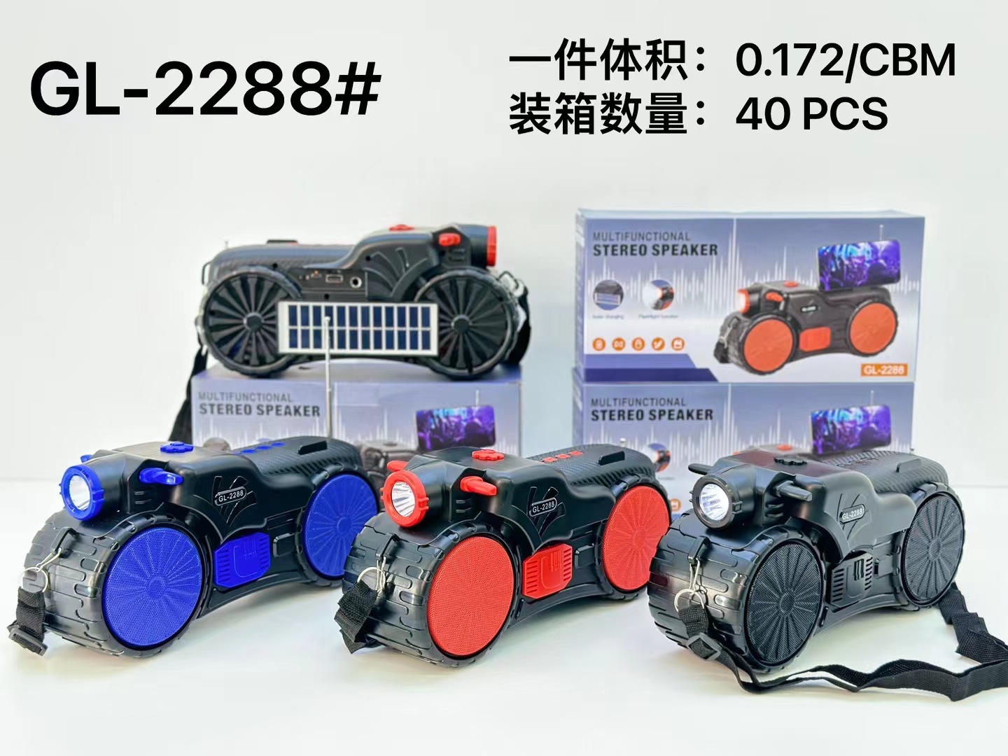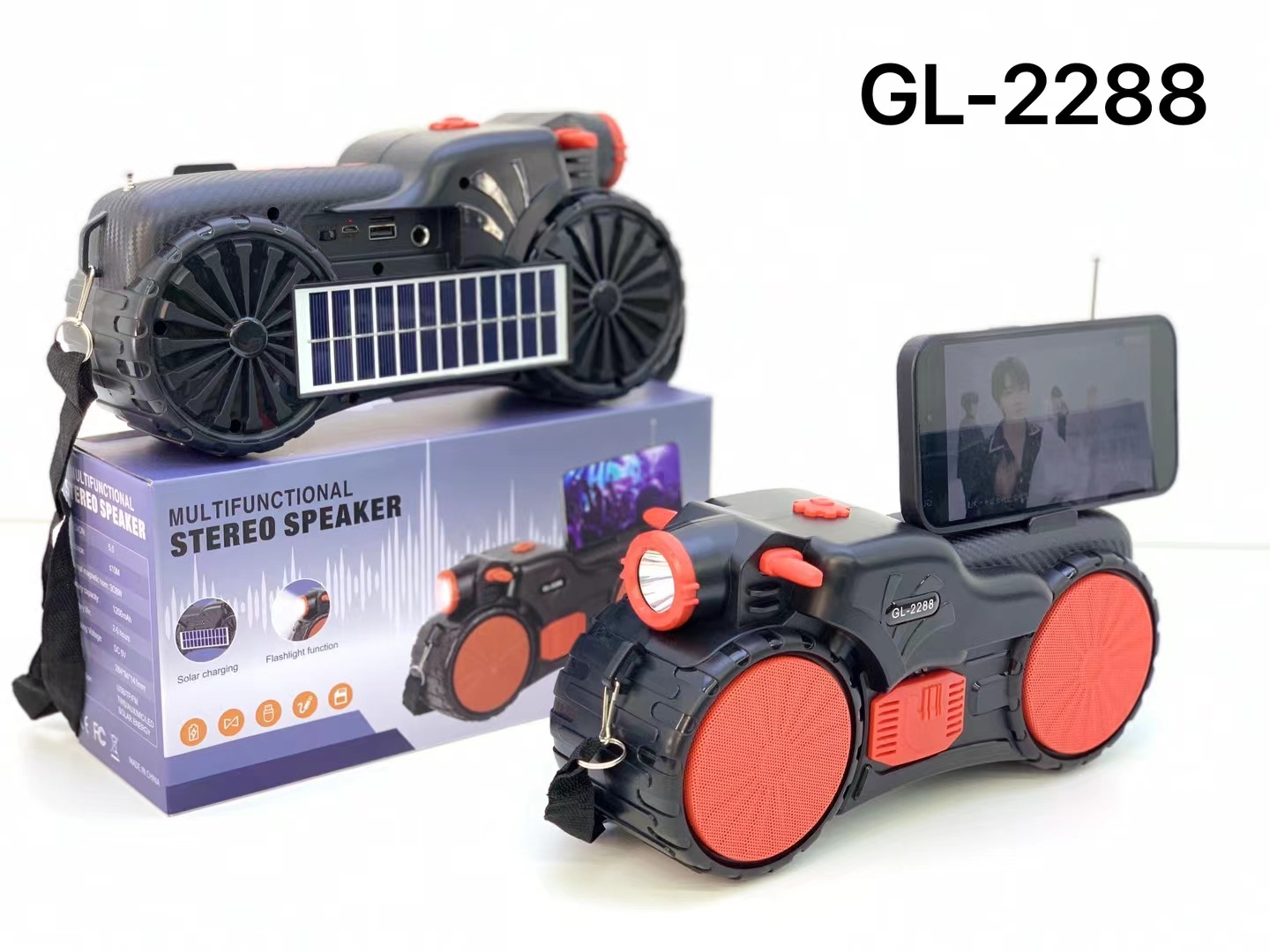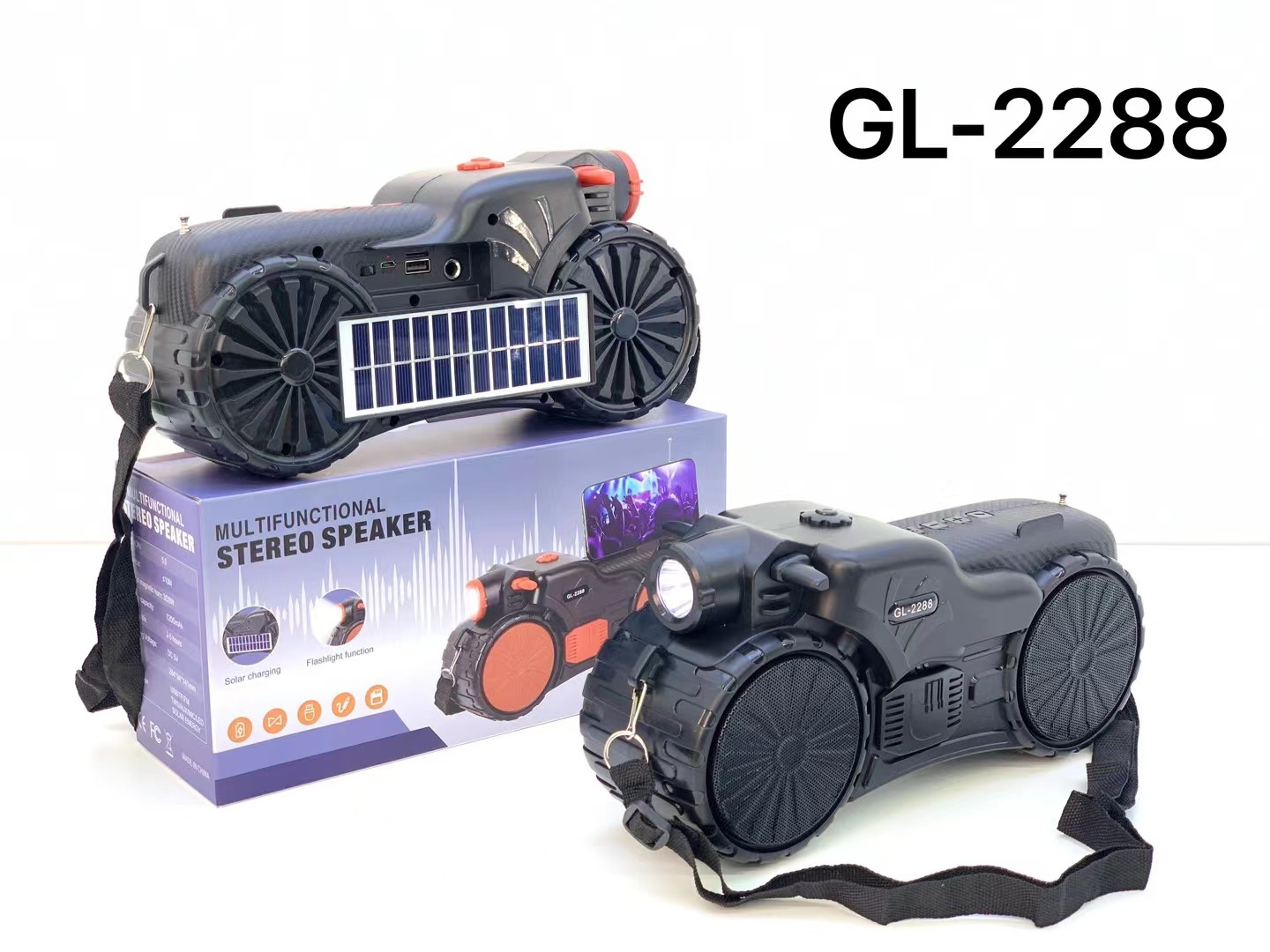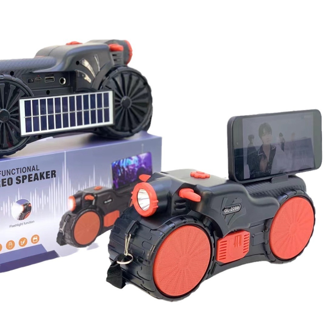 GL2288新款非洲热卖太阳能手电筒蓝牙音箱双喇叭低音炮收音机音响