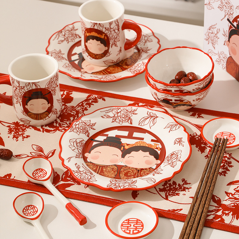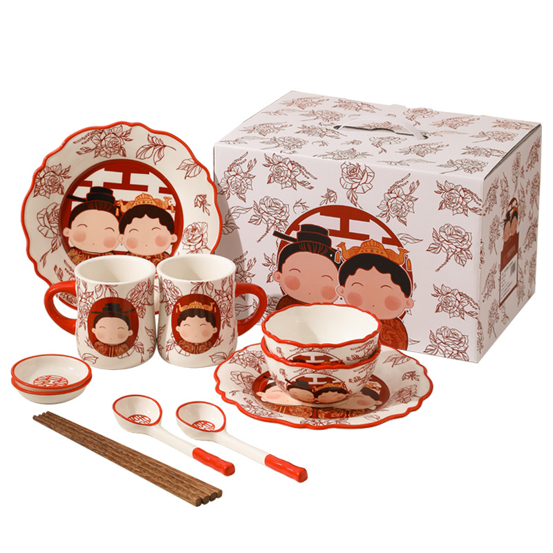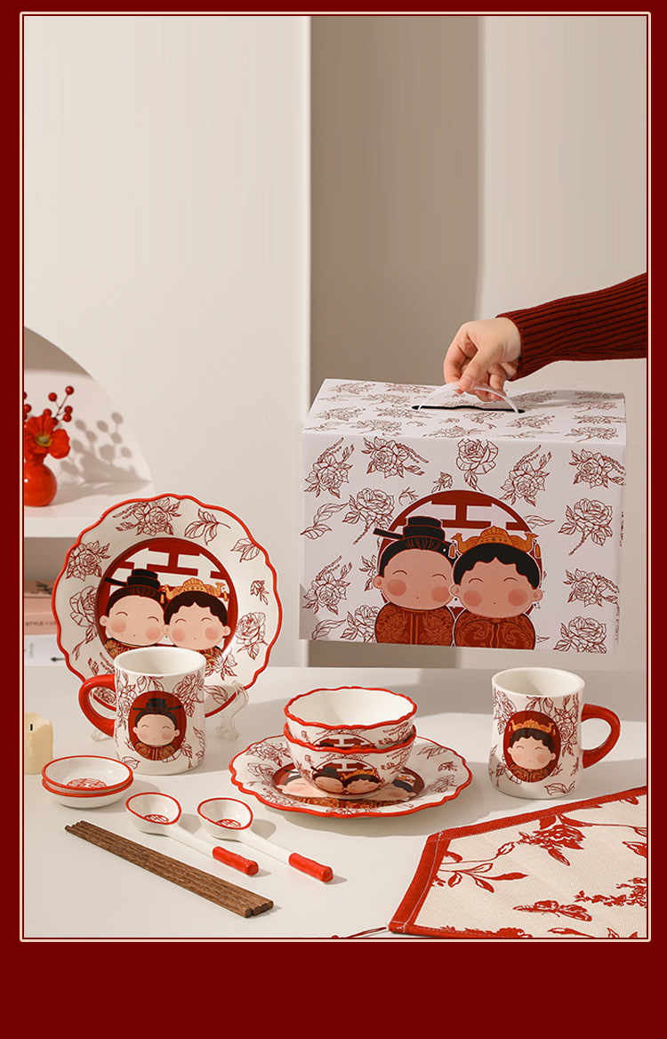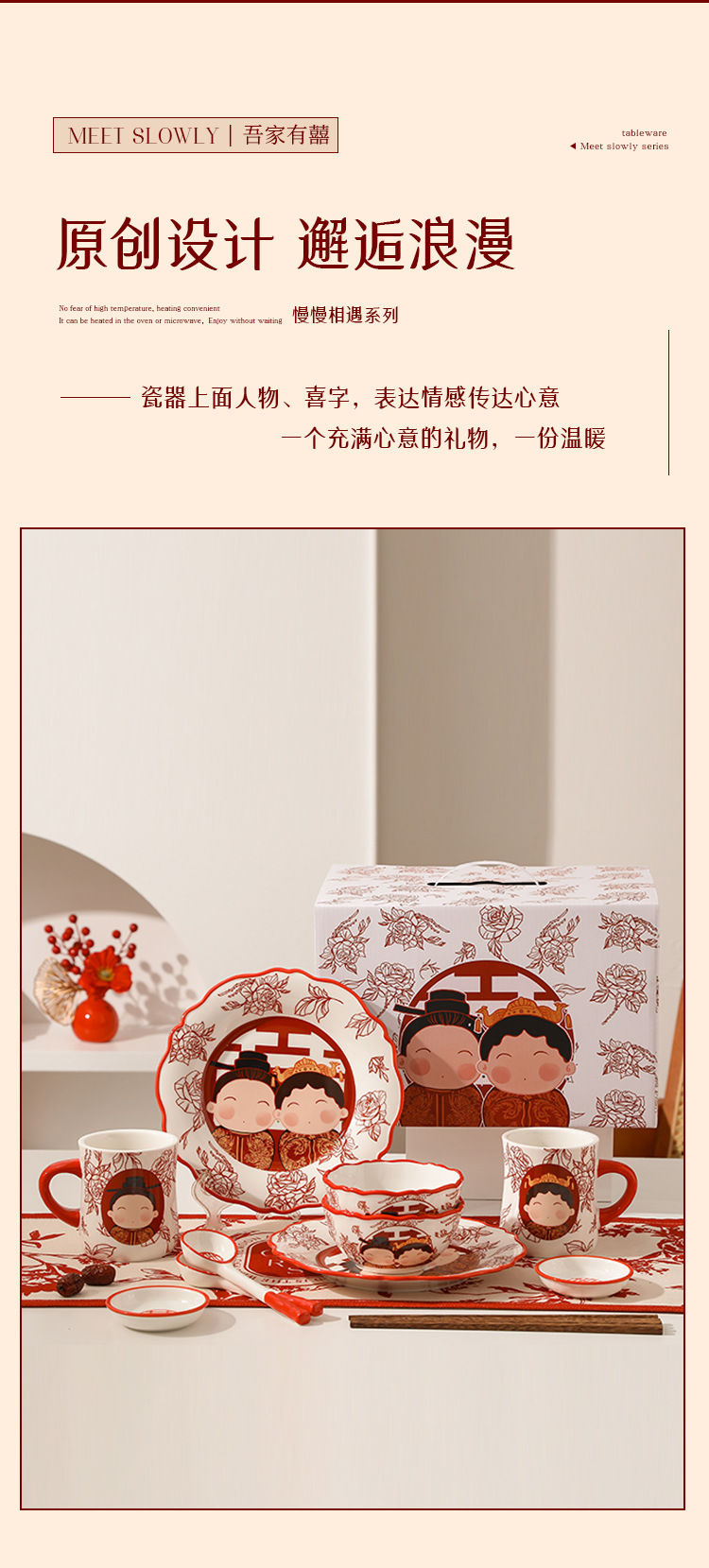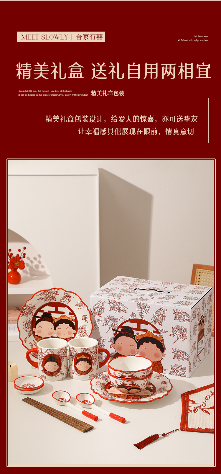吾家有喜陶瓷餐具二人食礼品套装新中式情侣碗盘勺水杯婚庆伴手礼