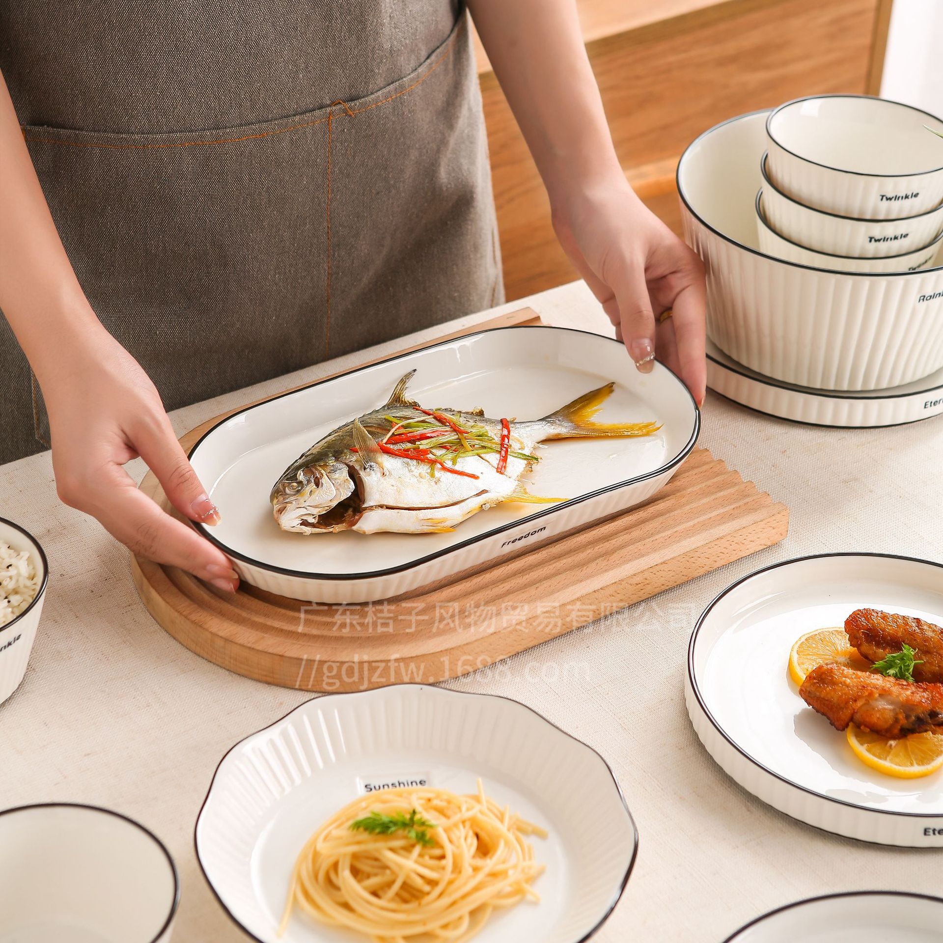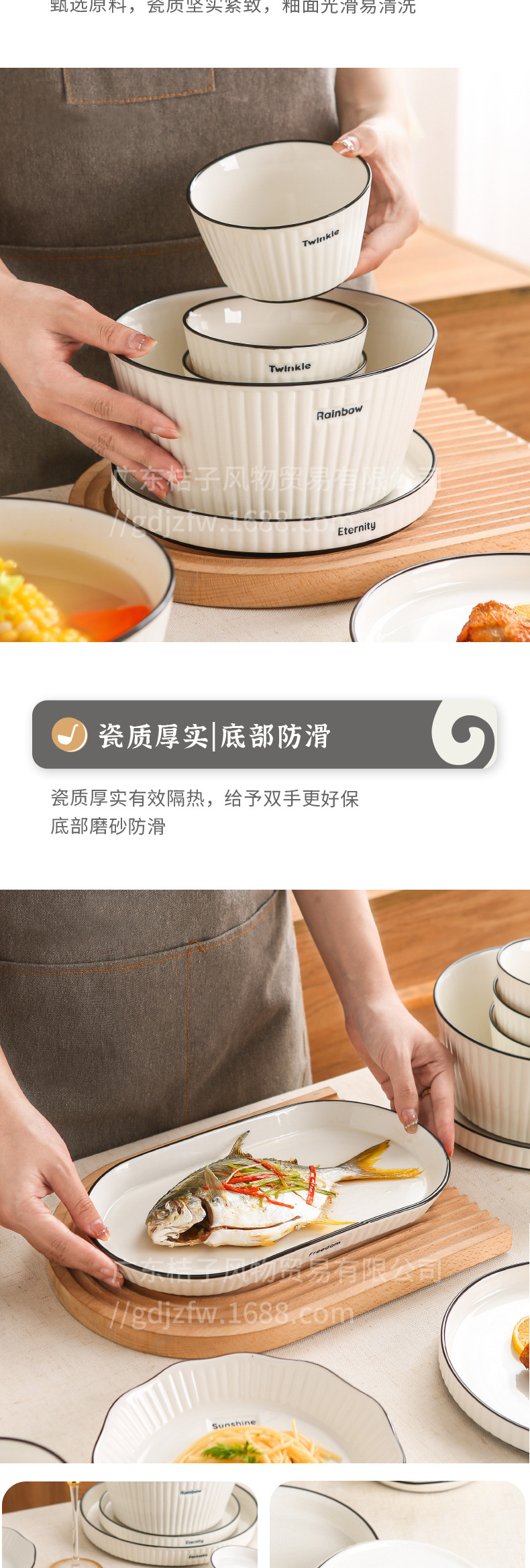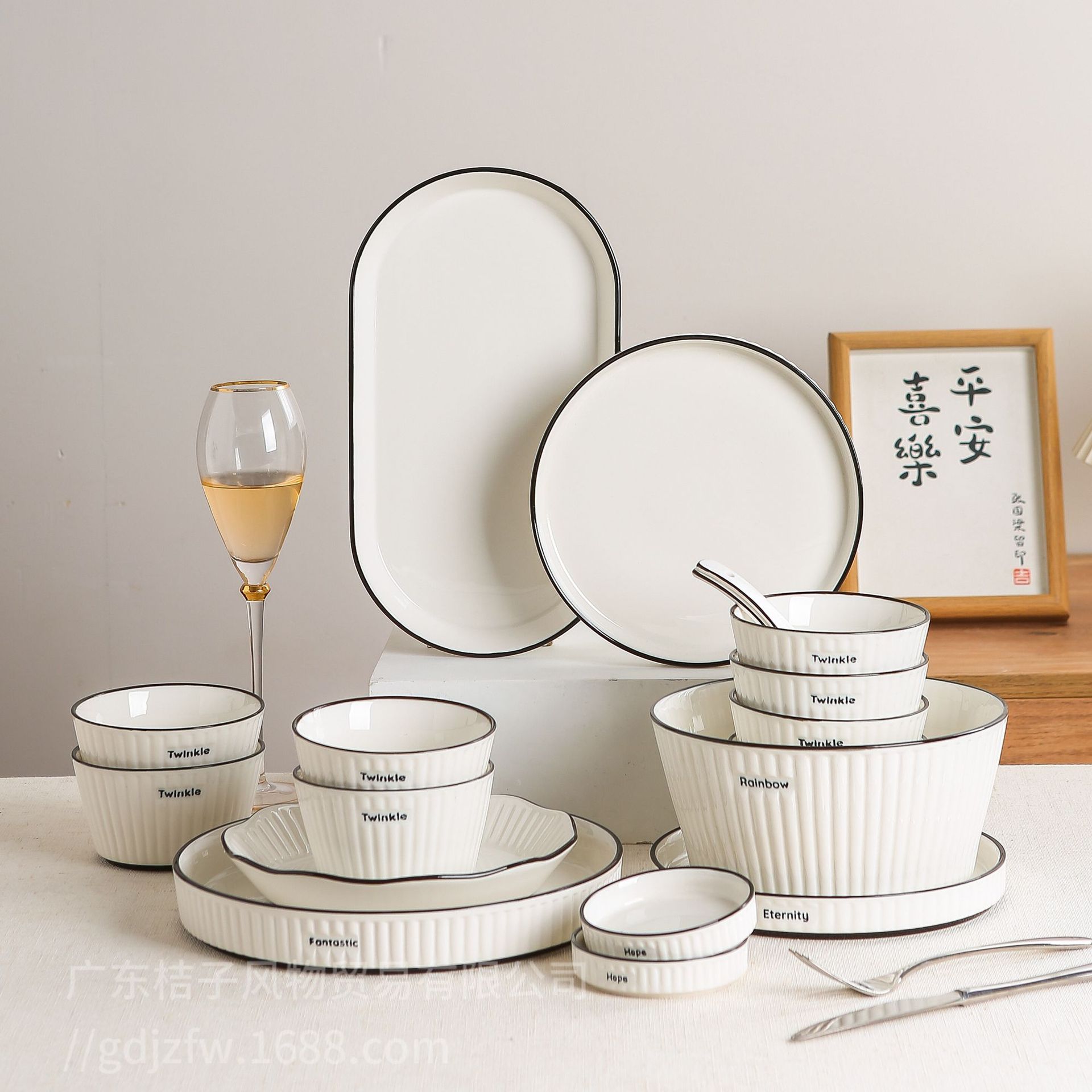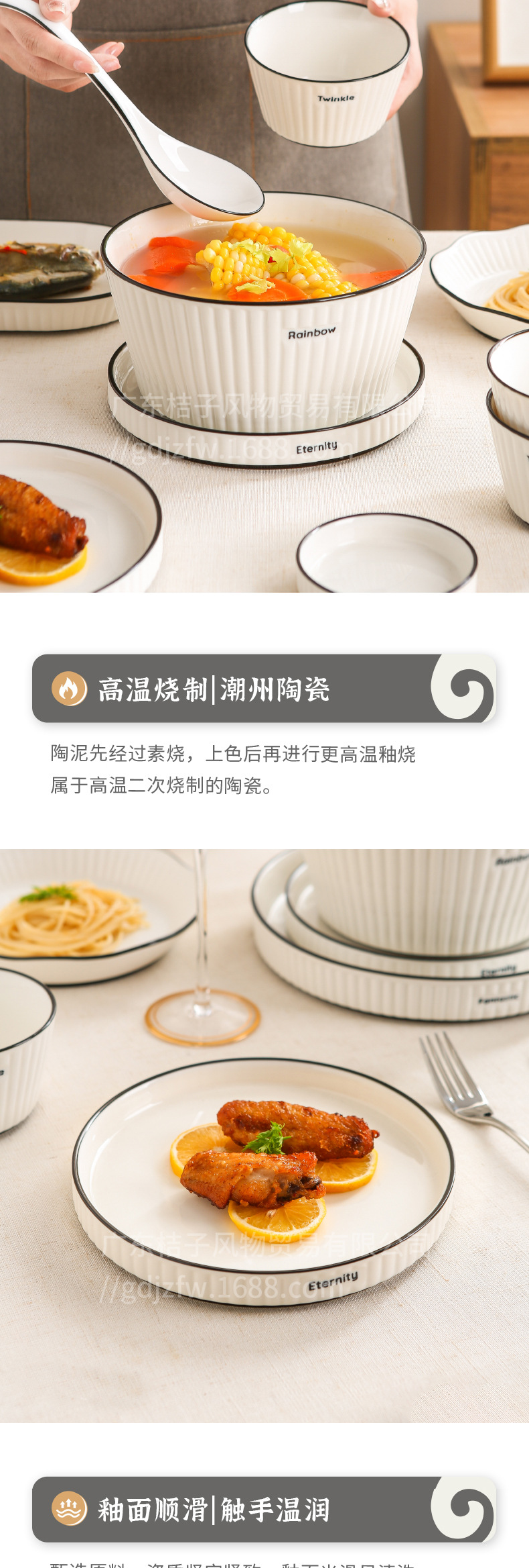 黑线竖纹陶瓷碗盘餐具简约ins风饭碗汤碗盘子釉下彩碗碟套装礼品