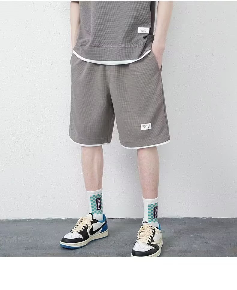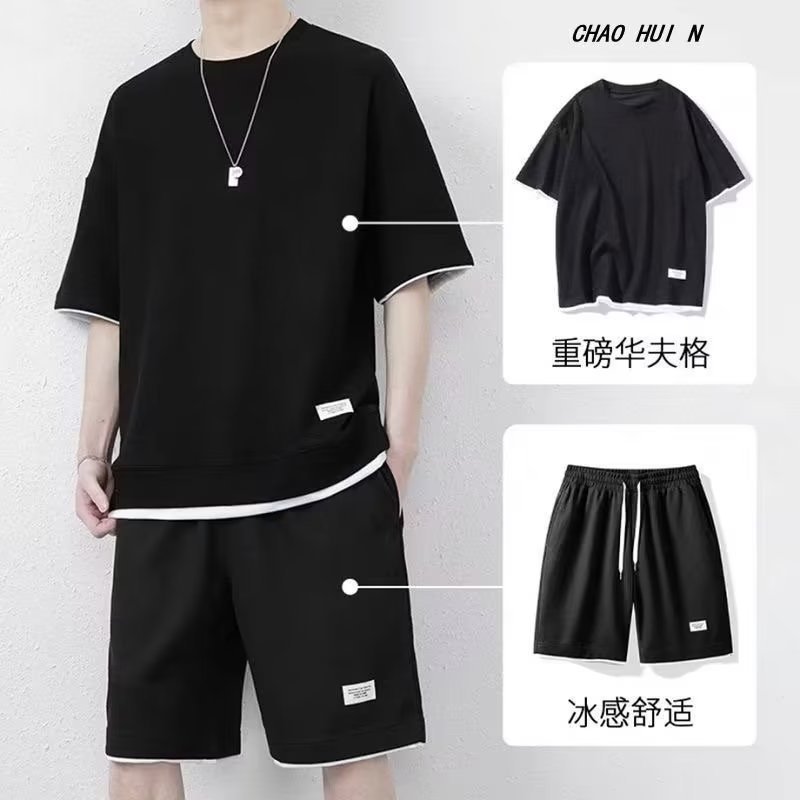 华夫格休闲套装男夏季冰丝短袖t恤男装一套搭配帅气潮牌运动衣服