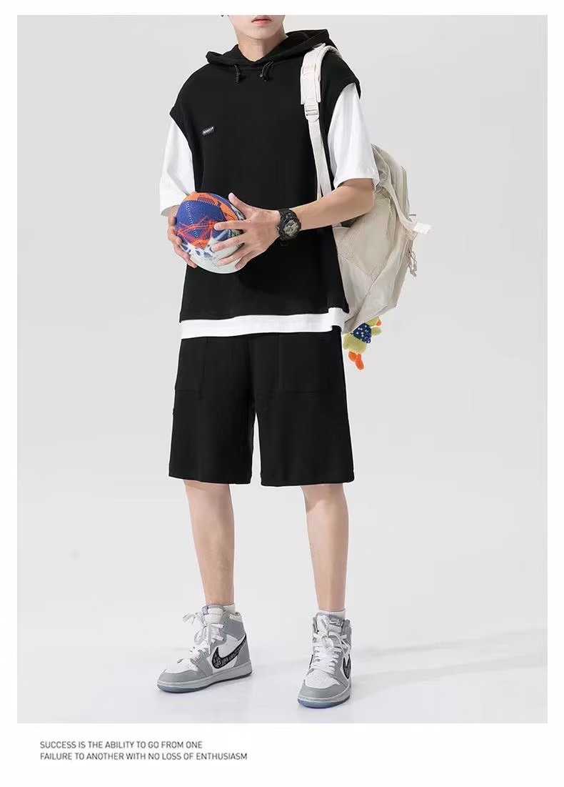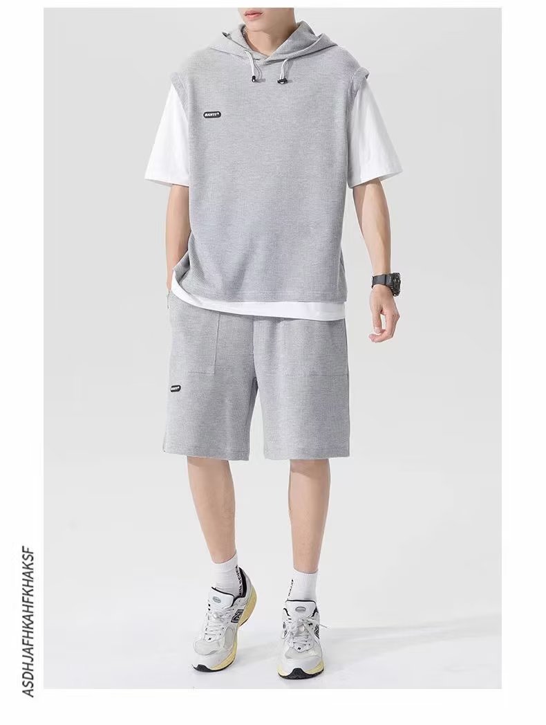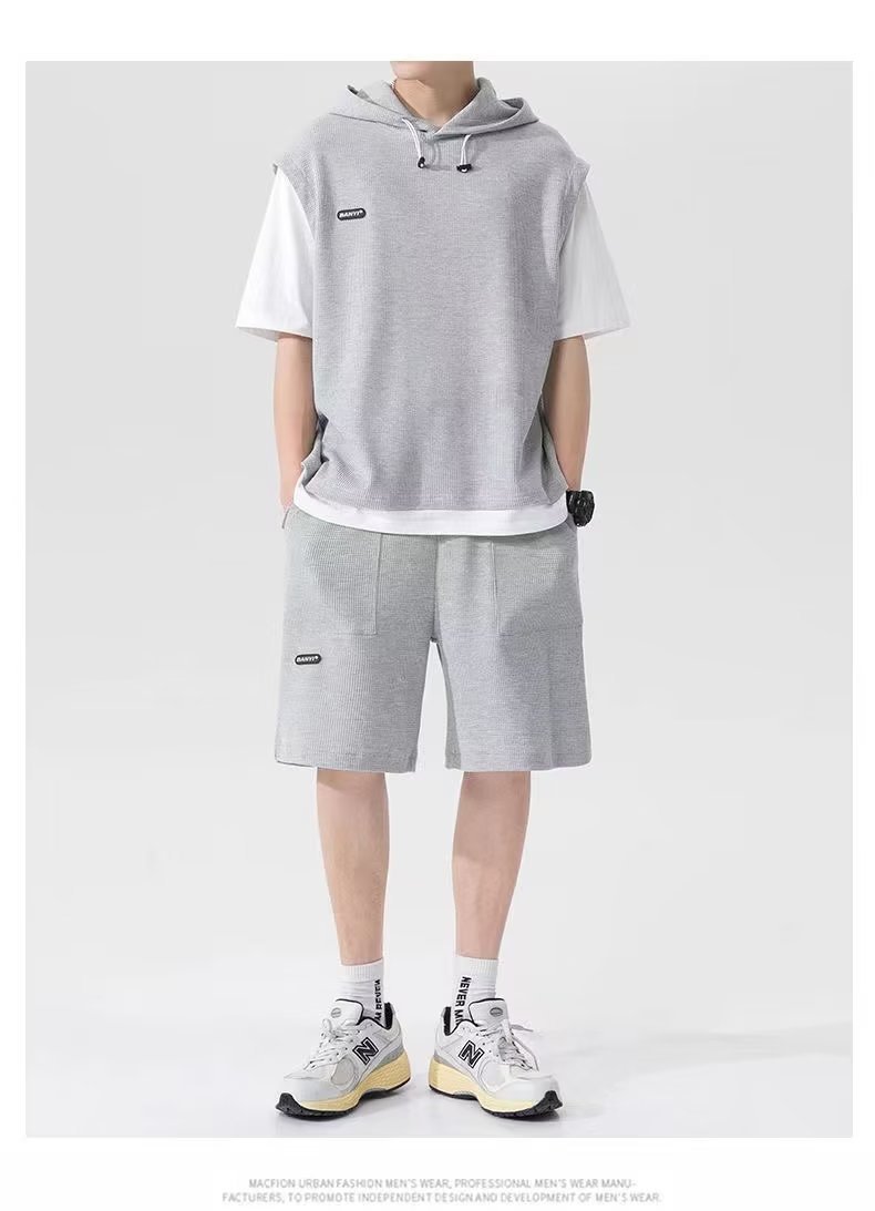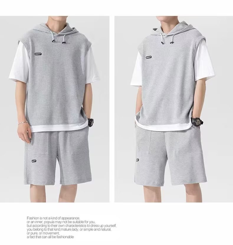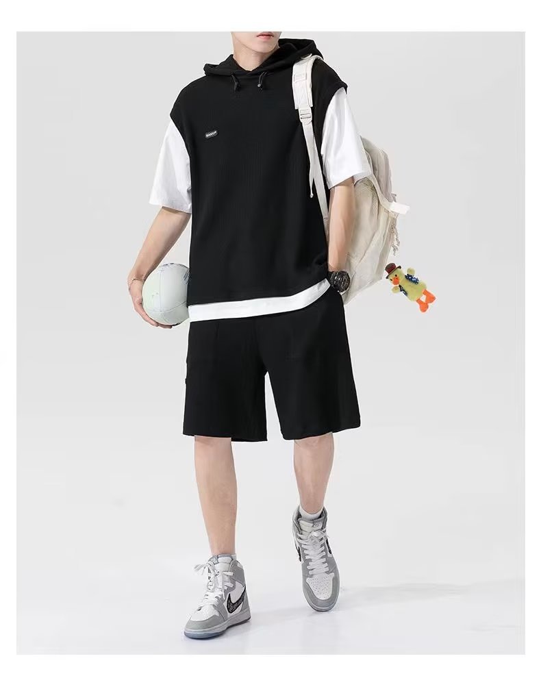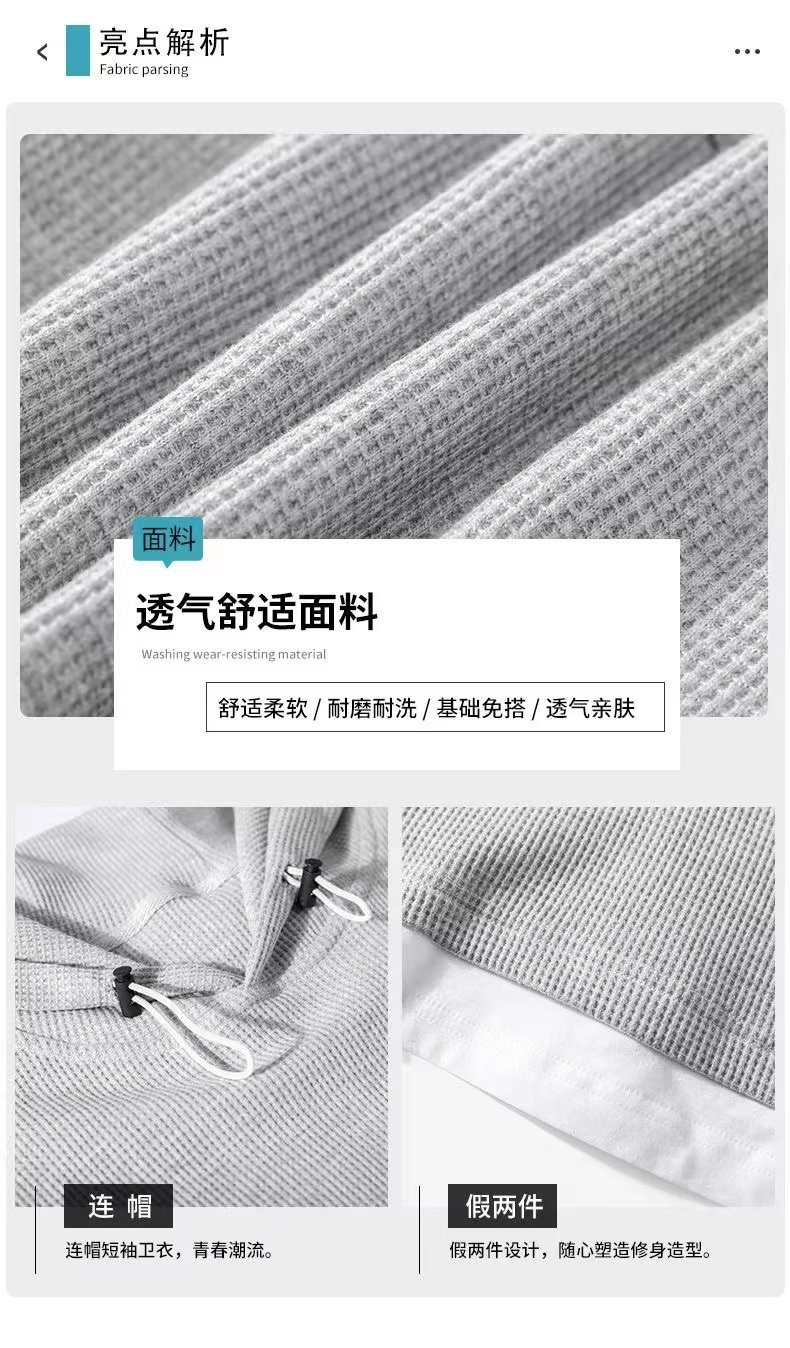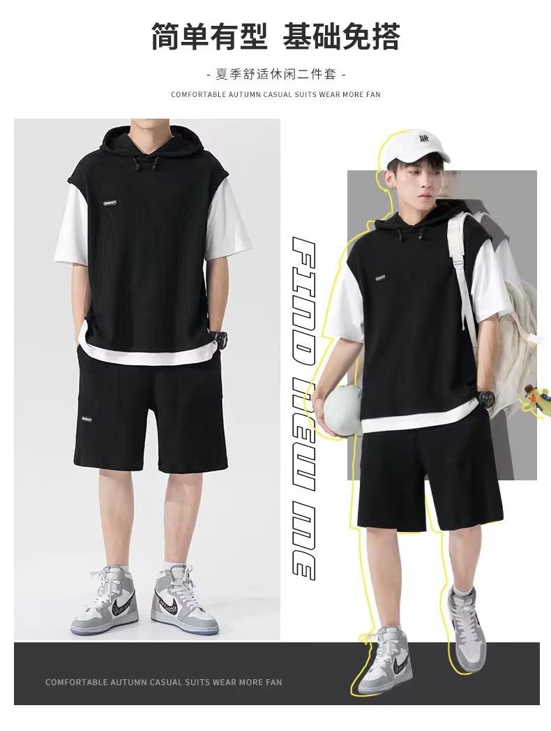 假两件华夫格短袖运动套装男春夏季连帽t恤短裤两件一套帅气男装