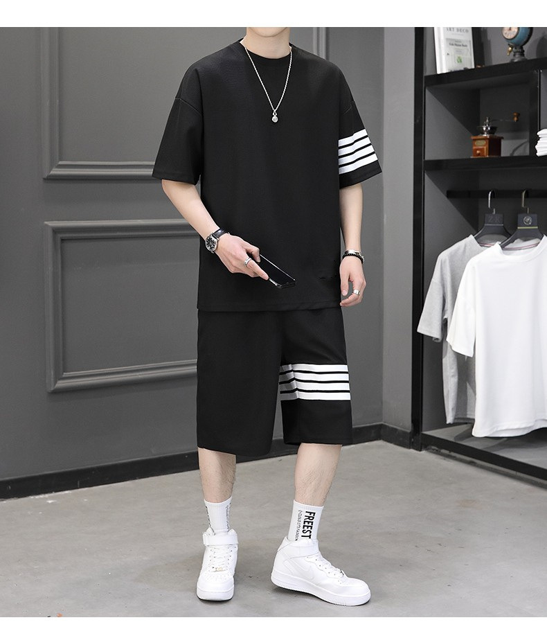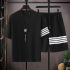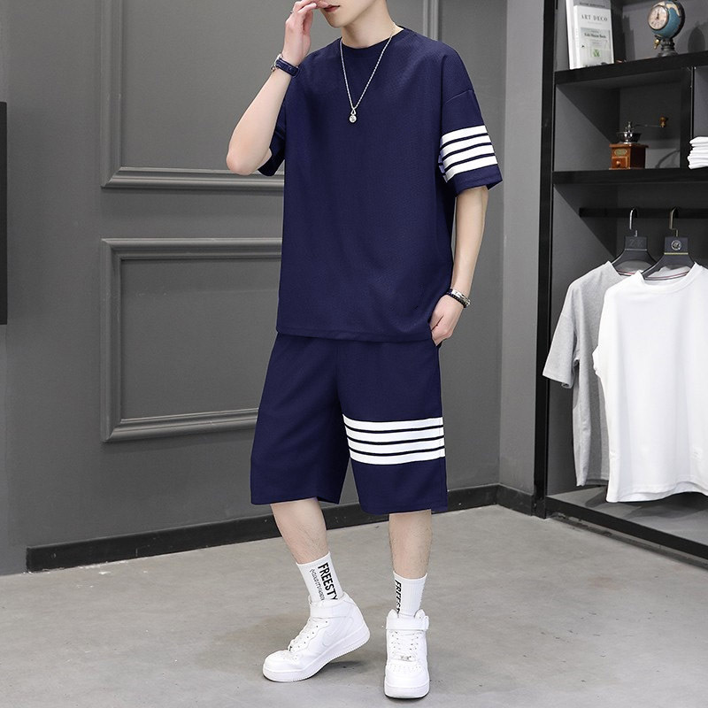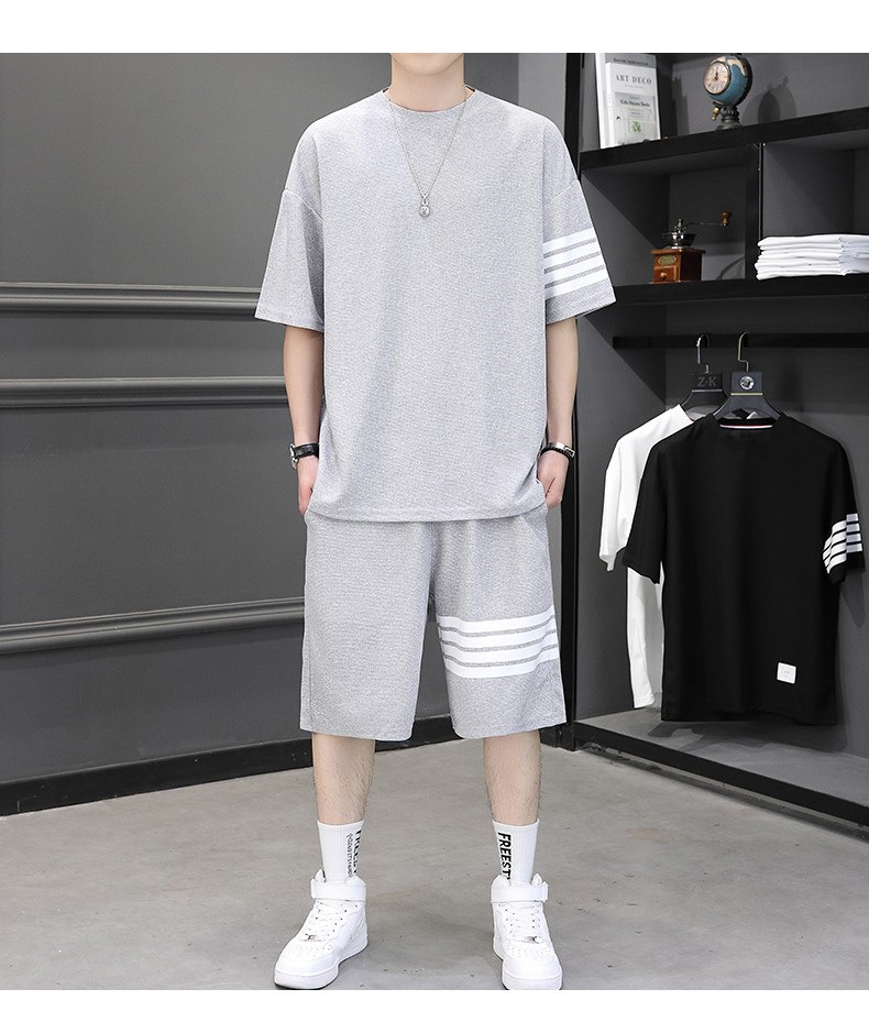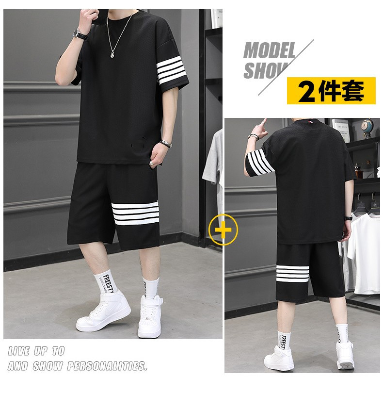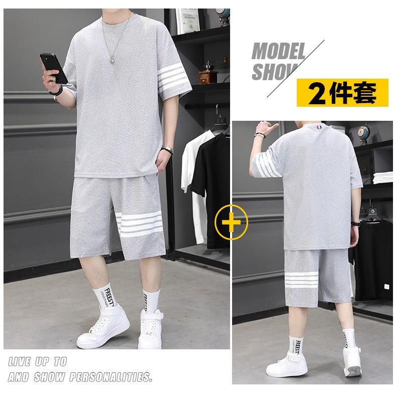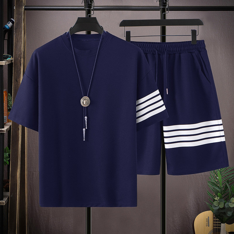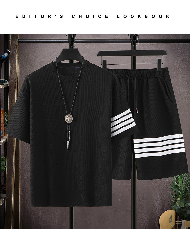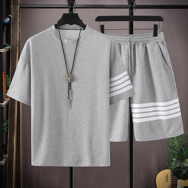华夫格短袖短裤套装男夏季薄款两件装短袖T恤休闲运动套装两件套
