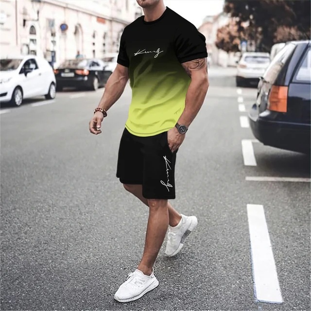 跨境新款风格3D打印essentials短袖t恤2件套夏季男士休闲运动套装