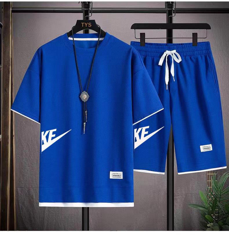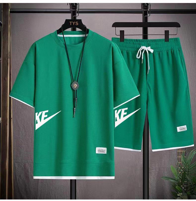 帅气华夫格短袖t恤男夏季假两件潮牌青少年学生休闲运动男装套装