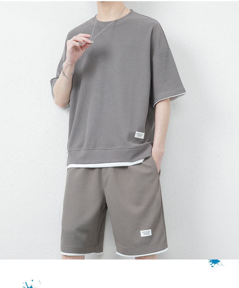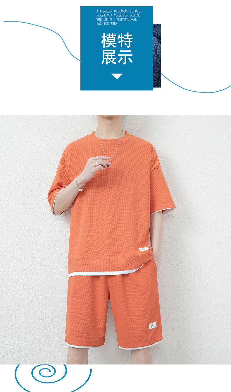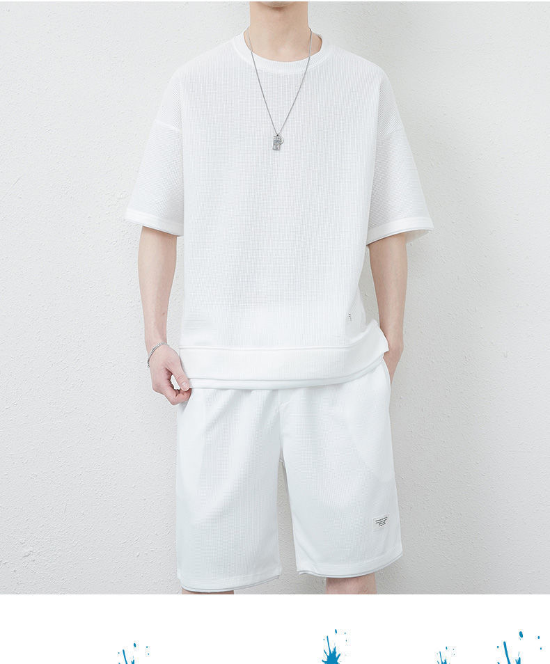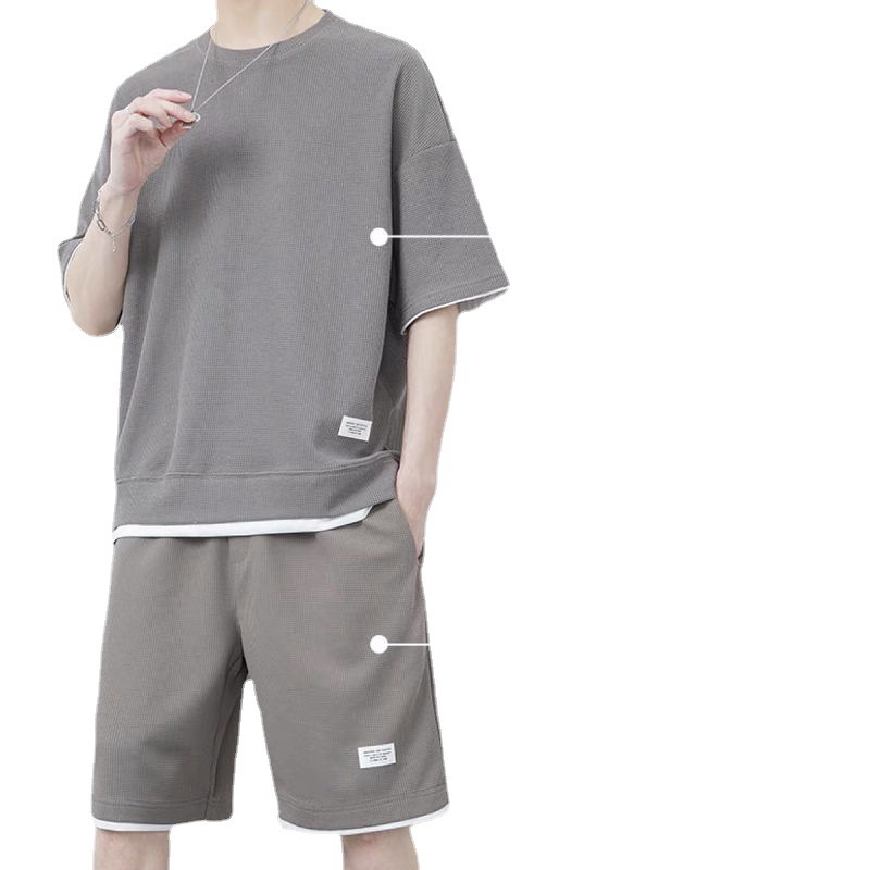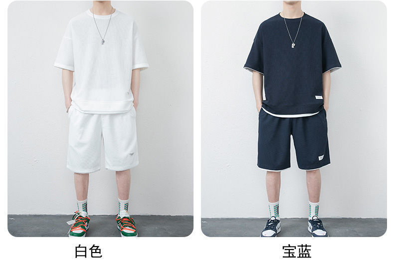 华夫格休闲套装男夏季冰丝短袖t恤男装一套搭配帅气大码运动套装