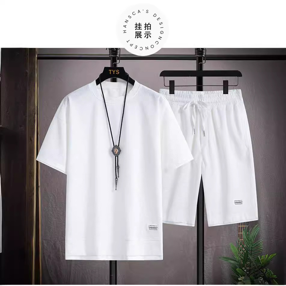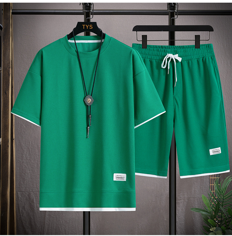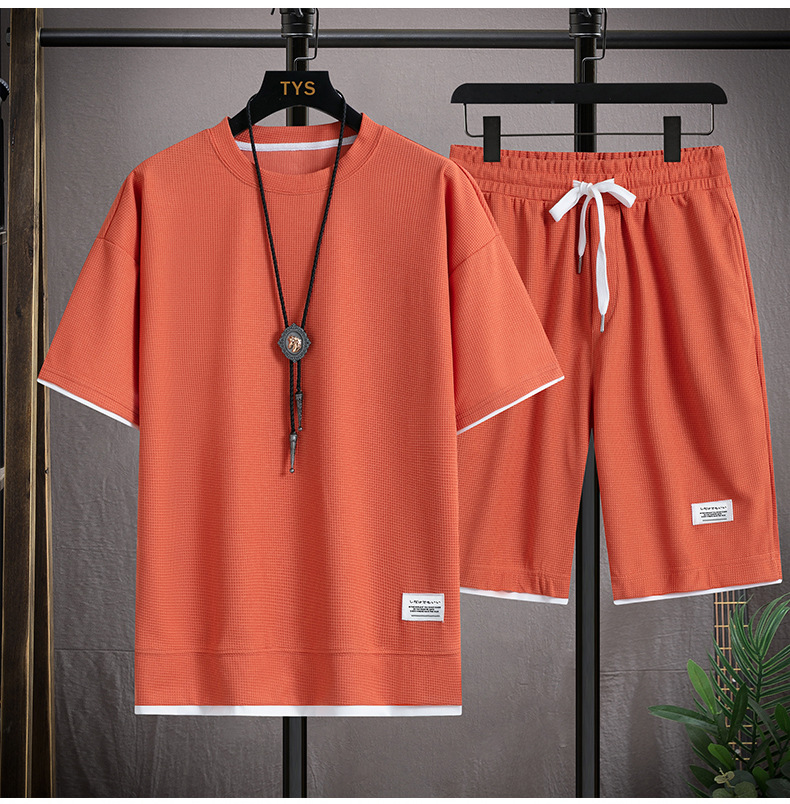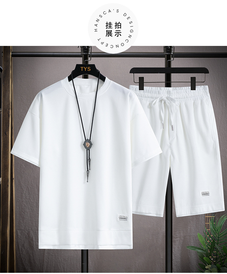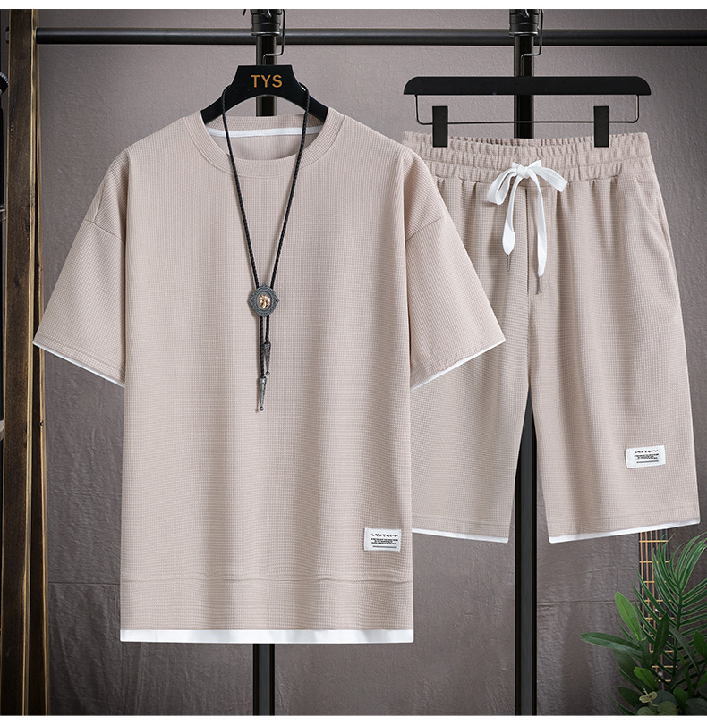 假两件帅气华夫格短袖t恤男夏季潮牌青少年学生休闲运动男装套装