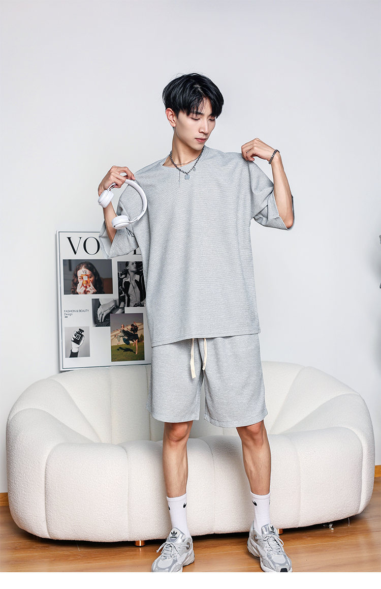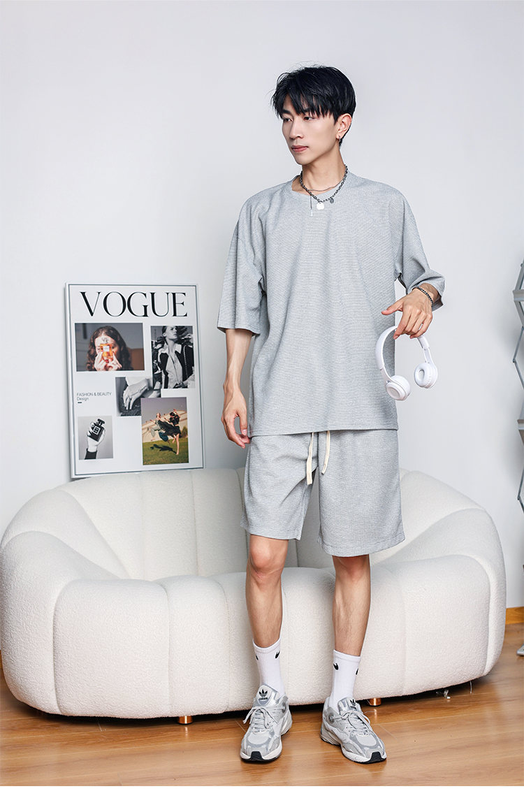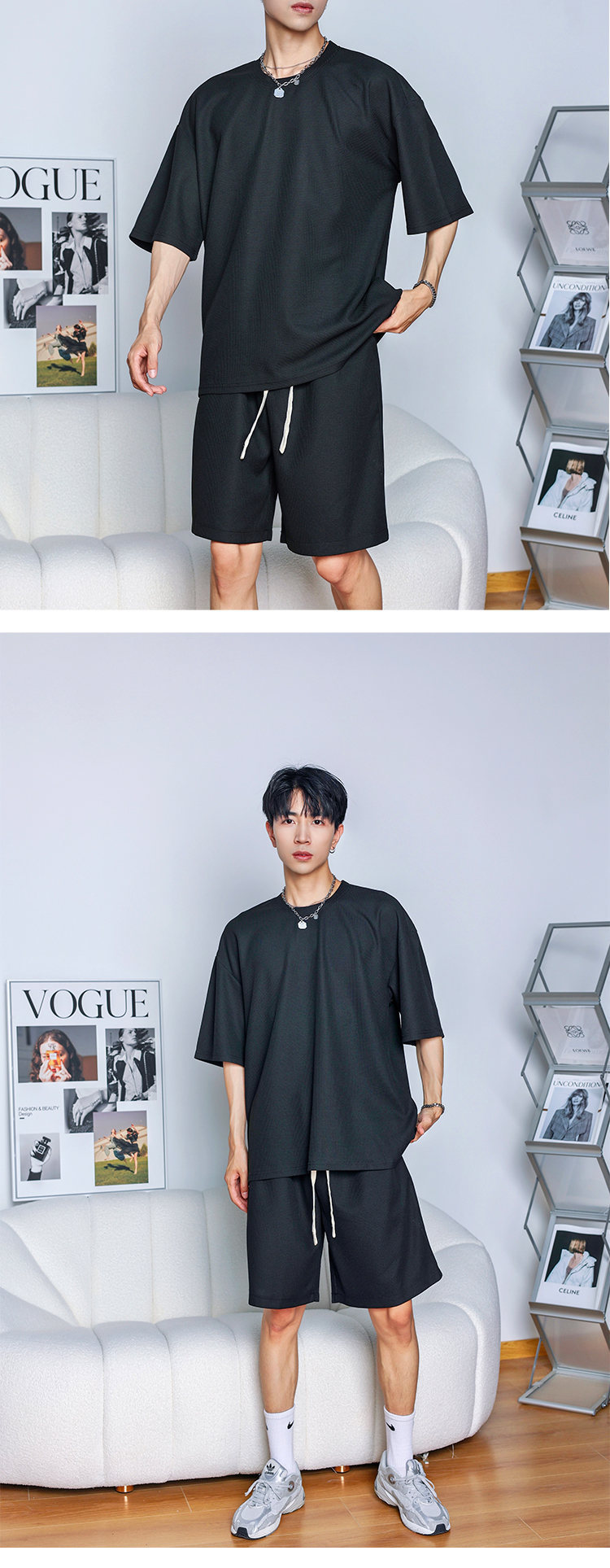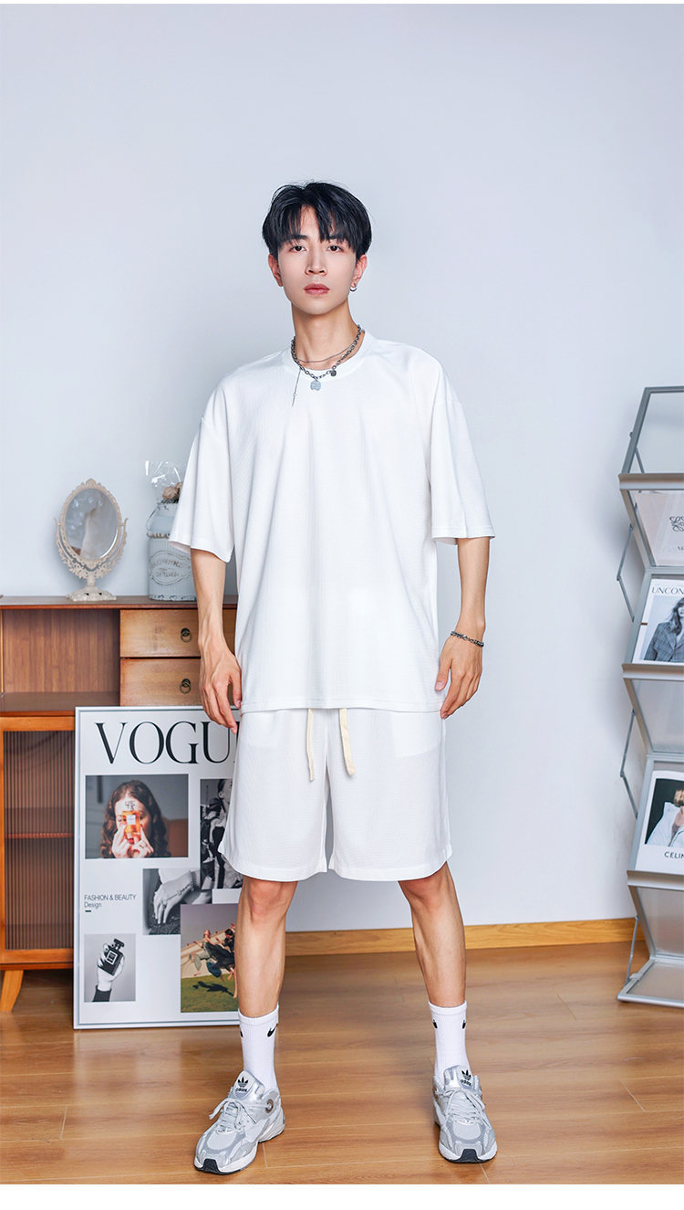 华夫格短袖套装男 夏季欧美式高克重纯色光板半袖T恤衫两件套男装