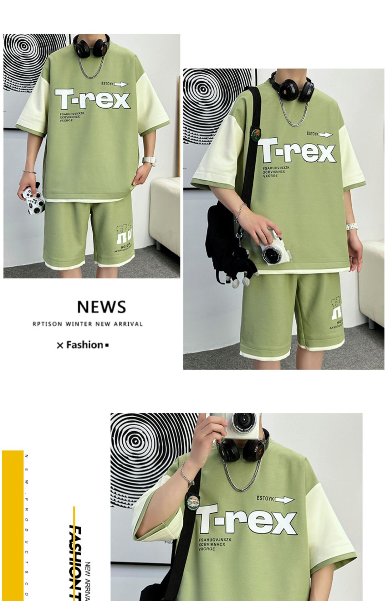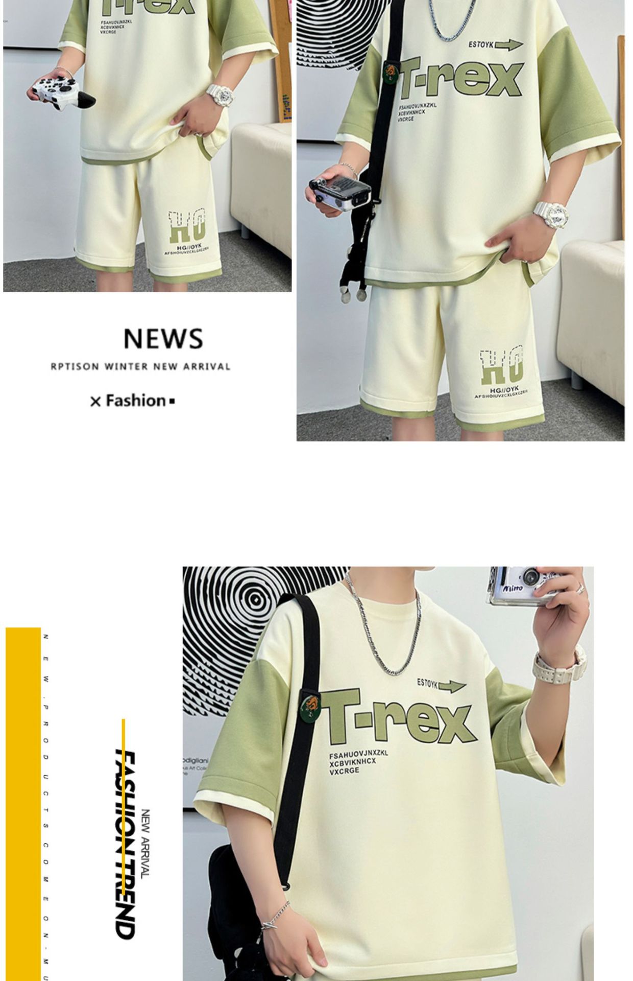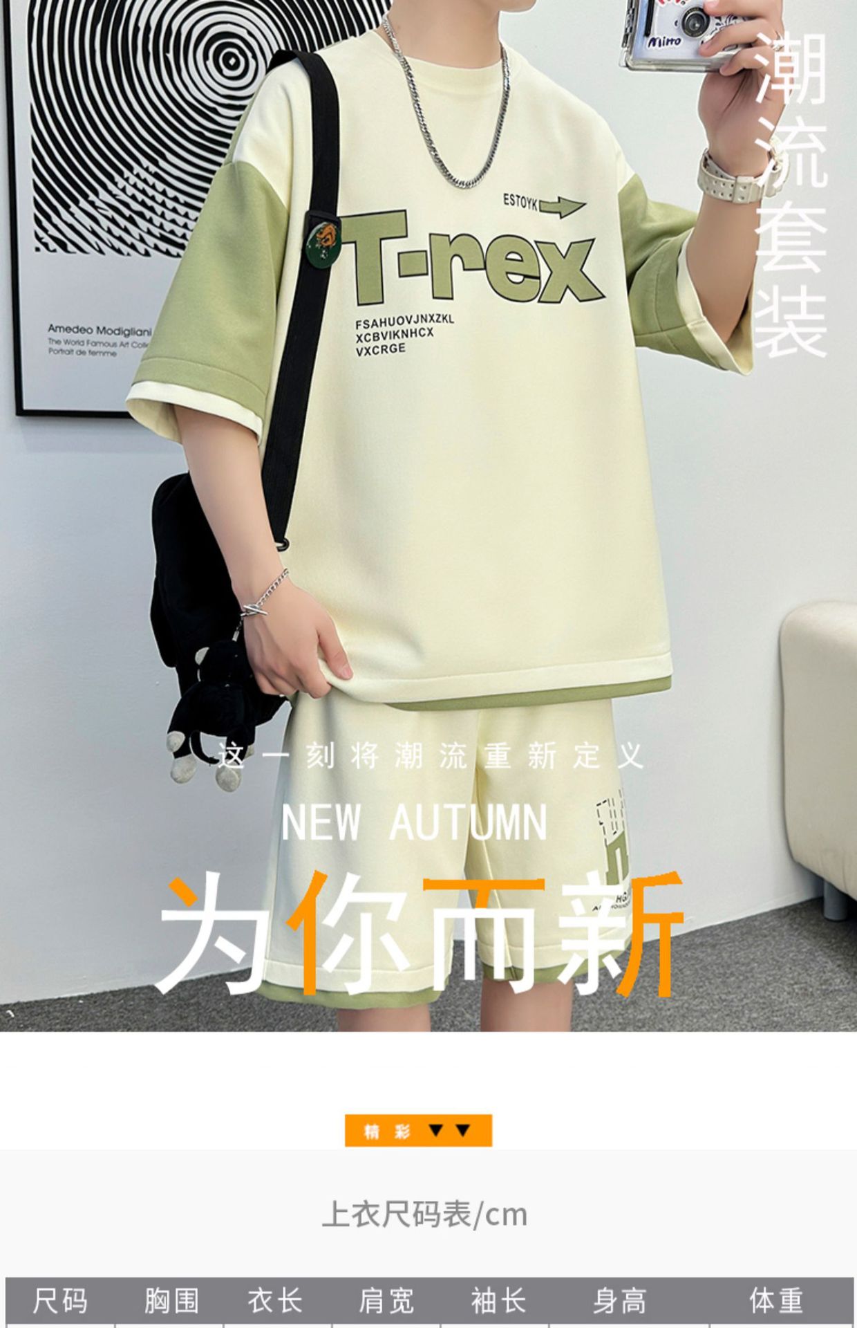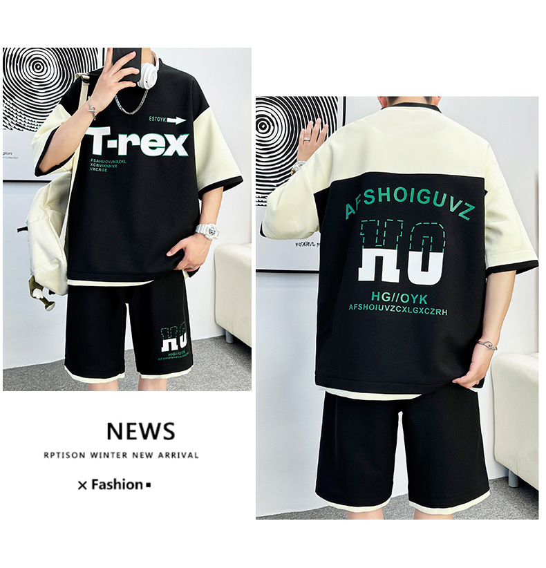 短袖套装男夏季字母冰丝半袖t恤男装休闲运动一套搭配帅气衣服潮