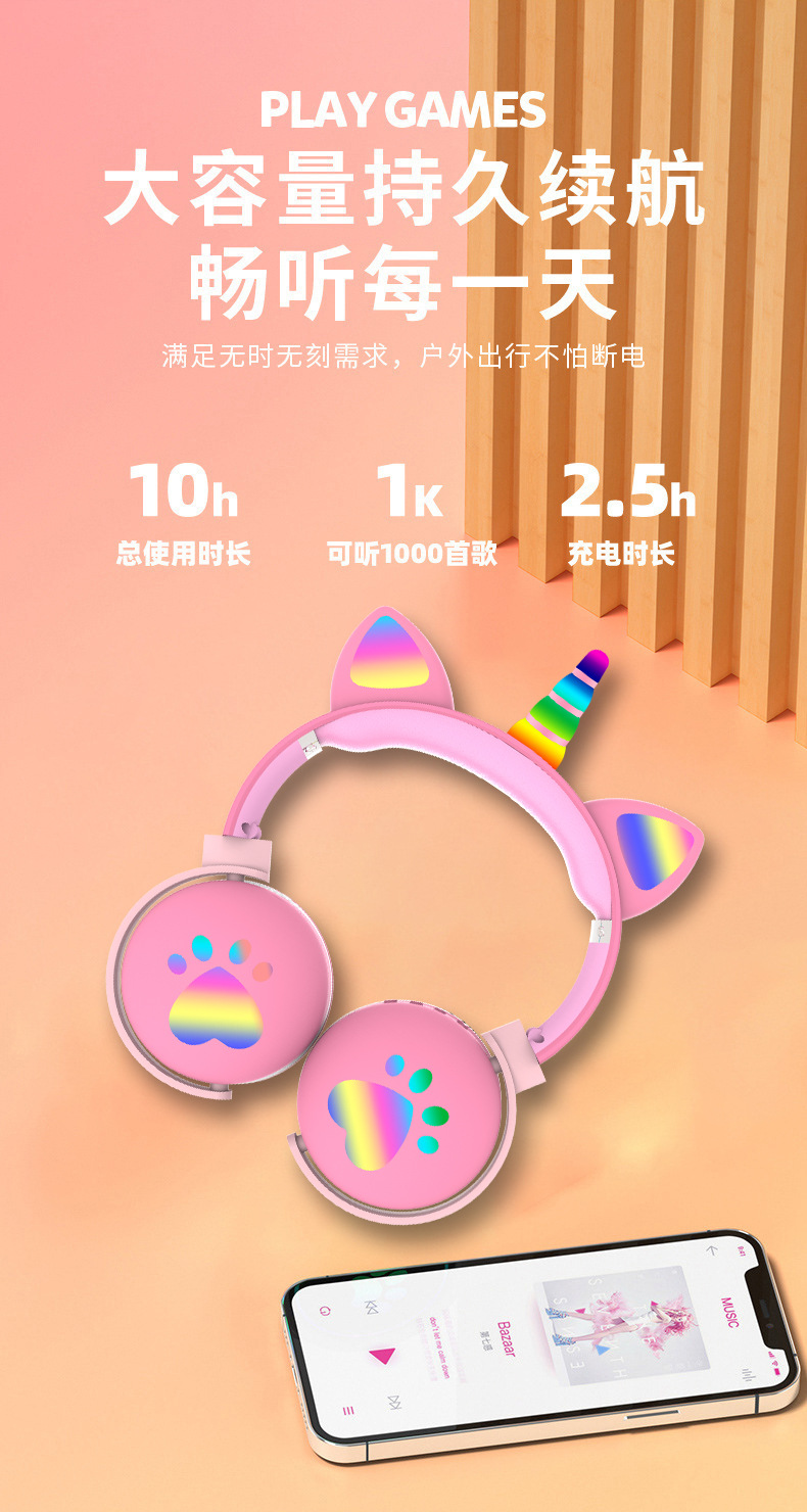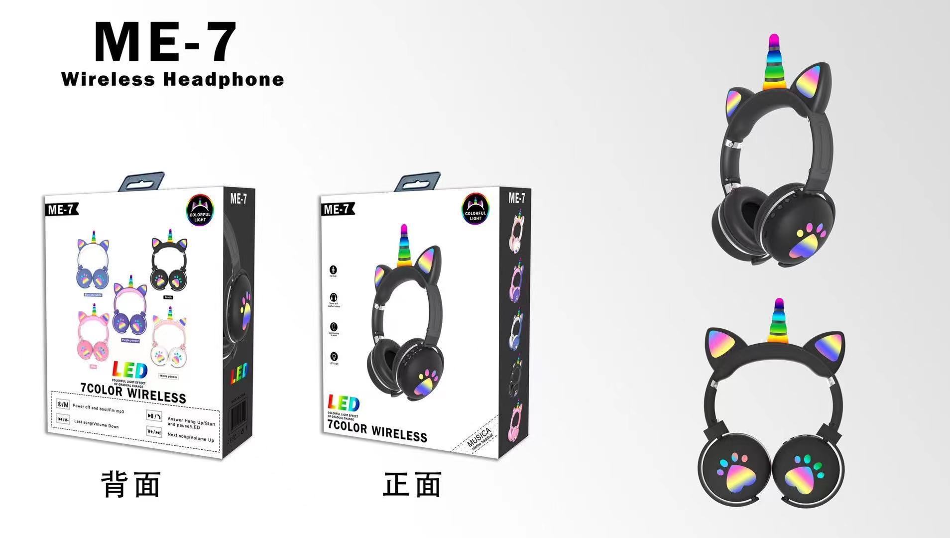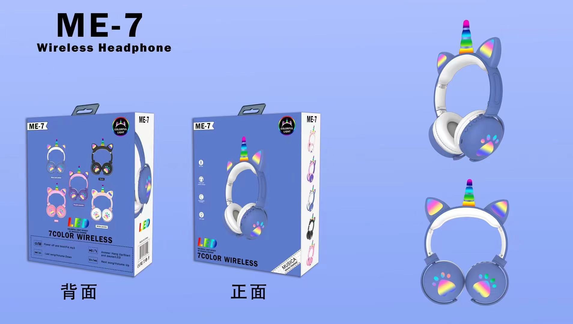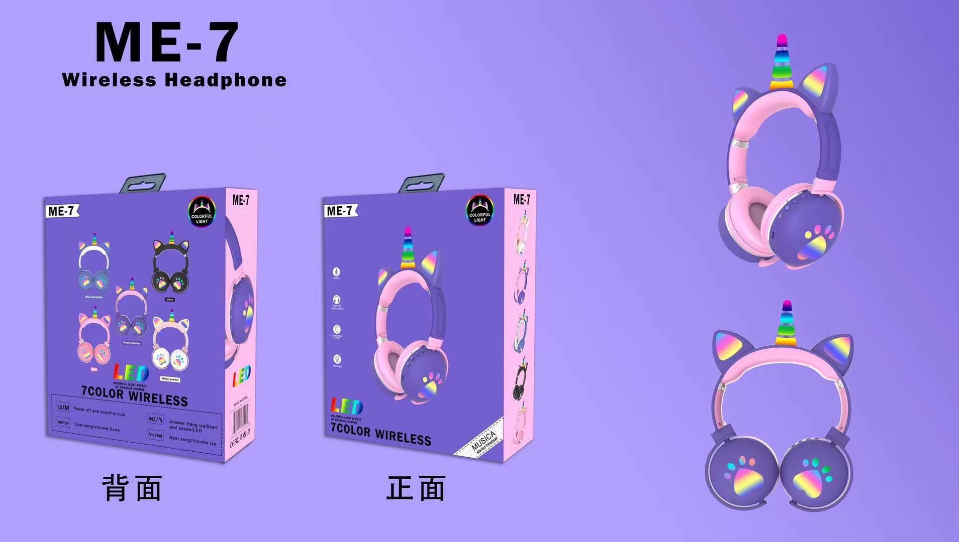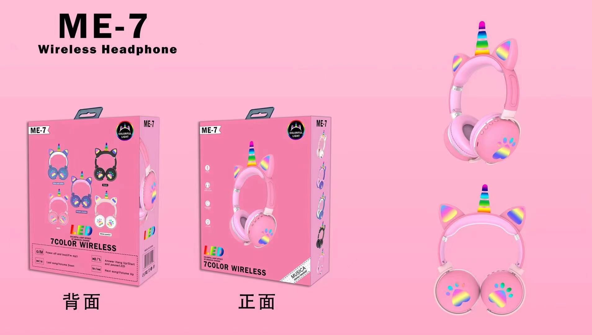 跨境ME-7猫耳朵头戴式无线蓝牙耳机独角兽发光RGB灯重低音耳机