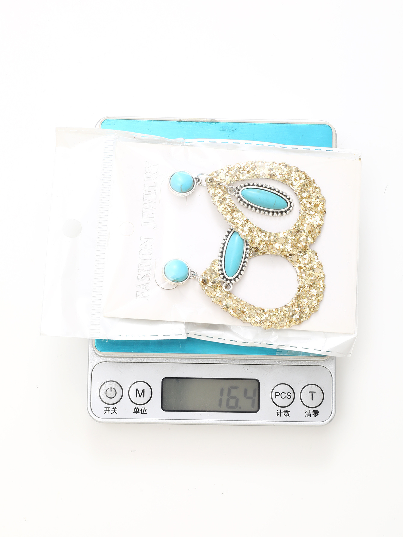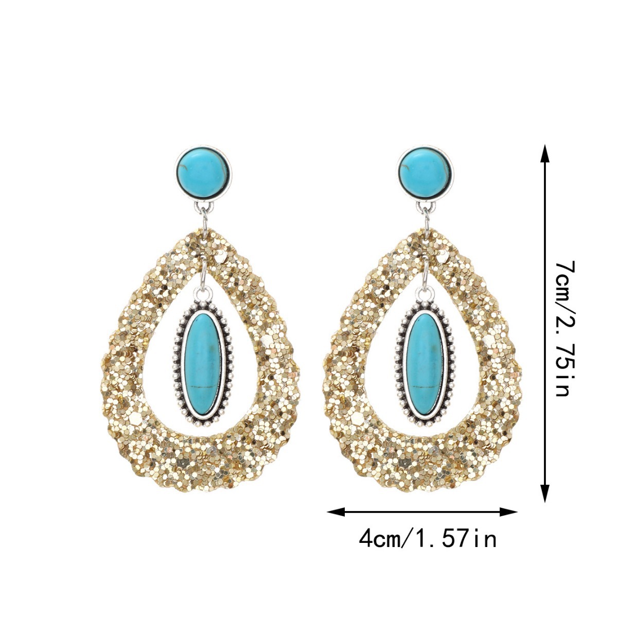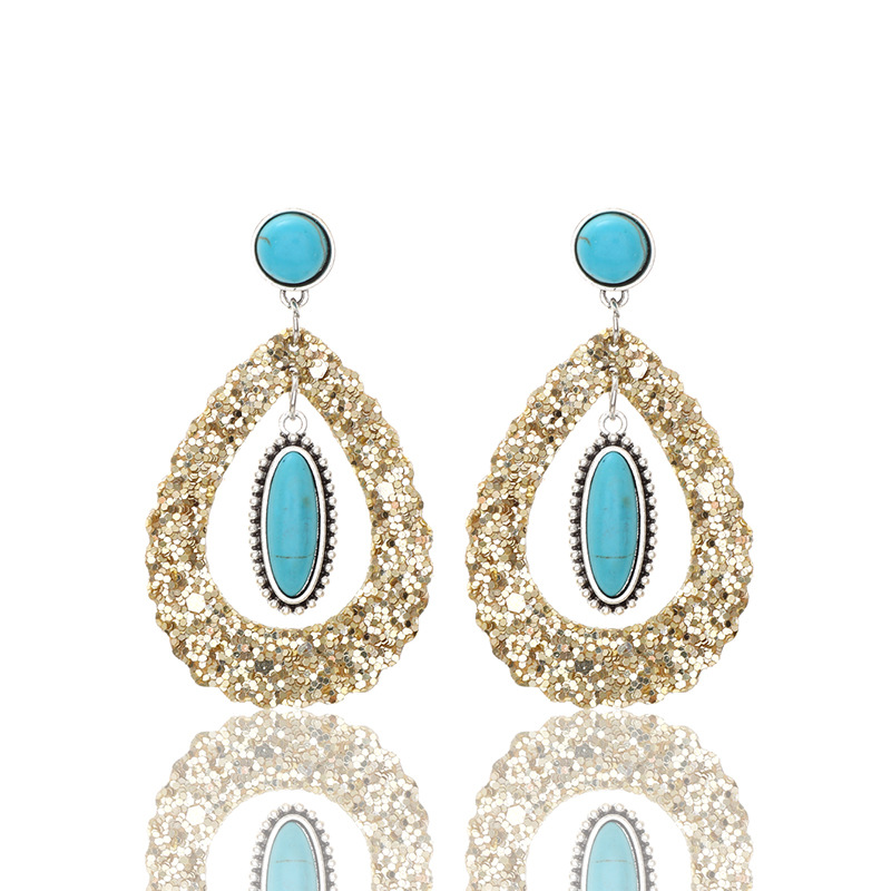 新款格利特风格超闪亮片镂空水滴形天然绿松石皮革耳环时尚耳钉