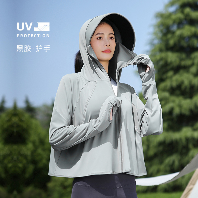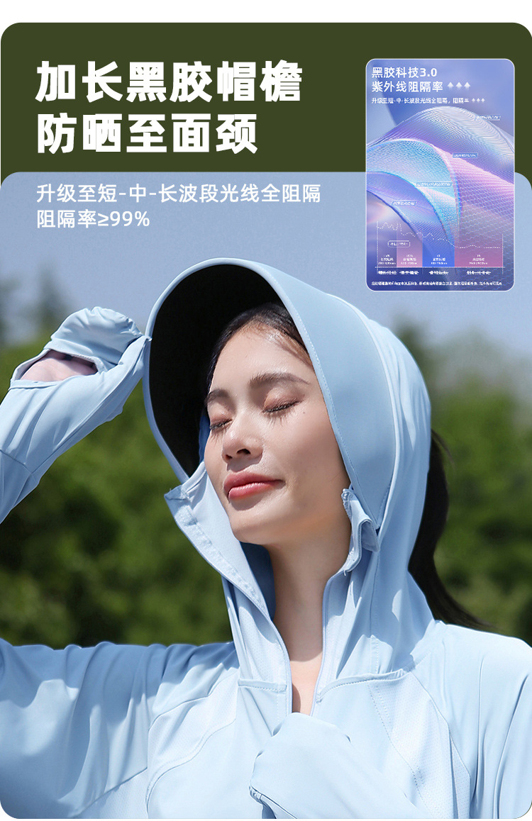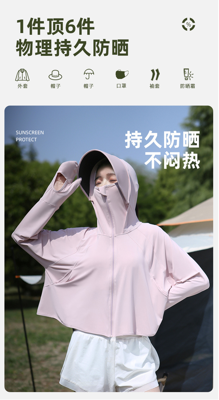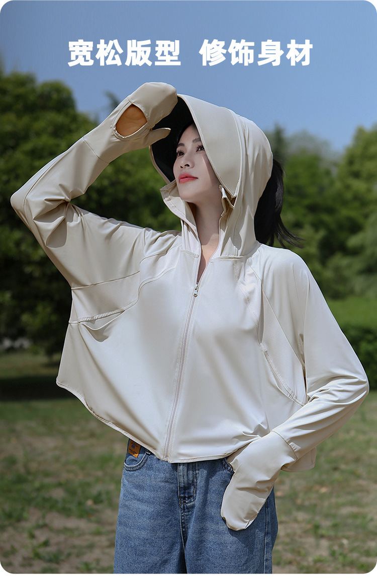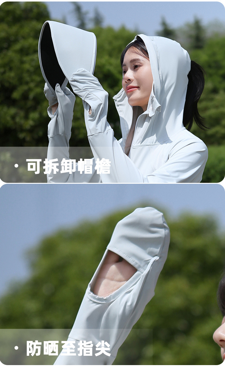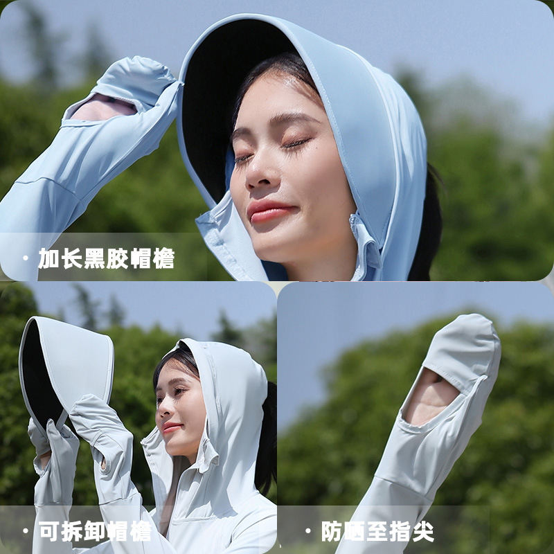 防晒衣女夏季新款黑胶帽檐防紫外线户外骑车透气冰丝护手薄防晒服