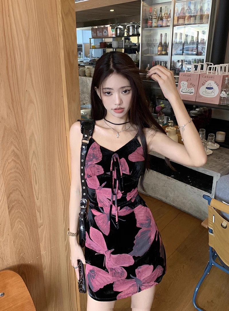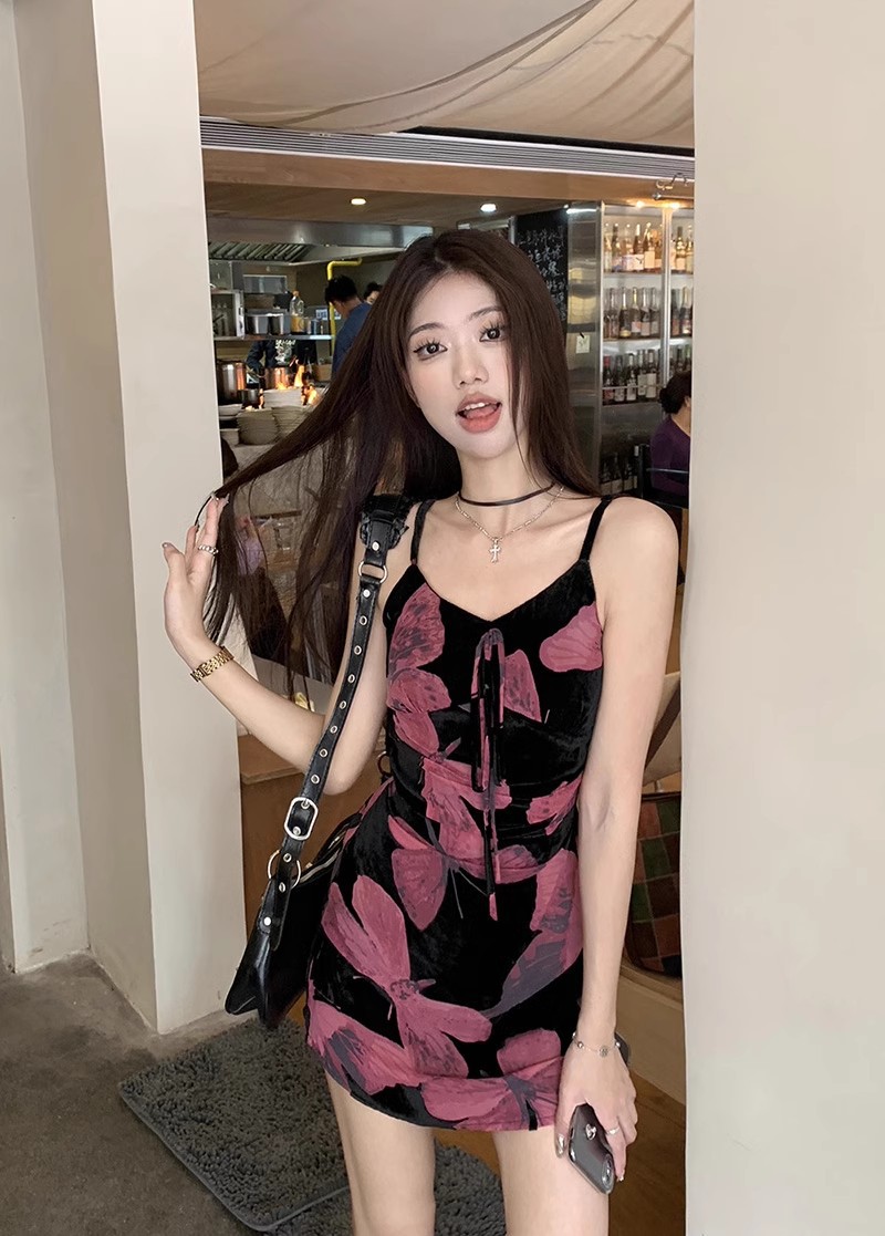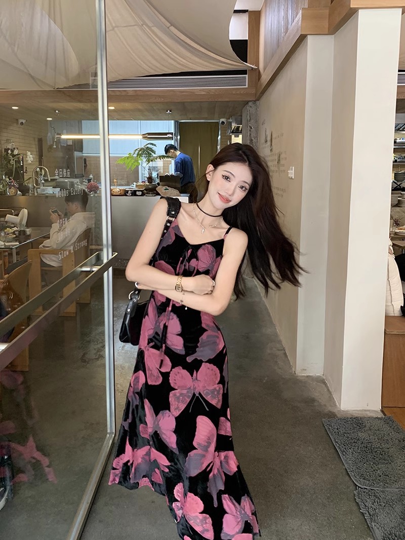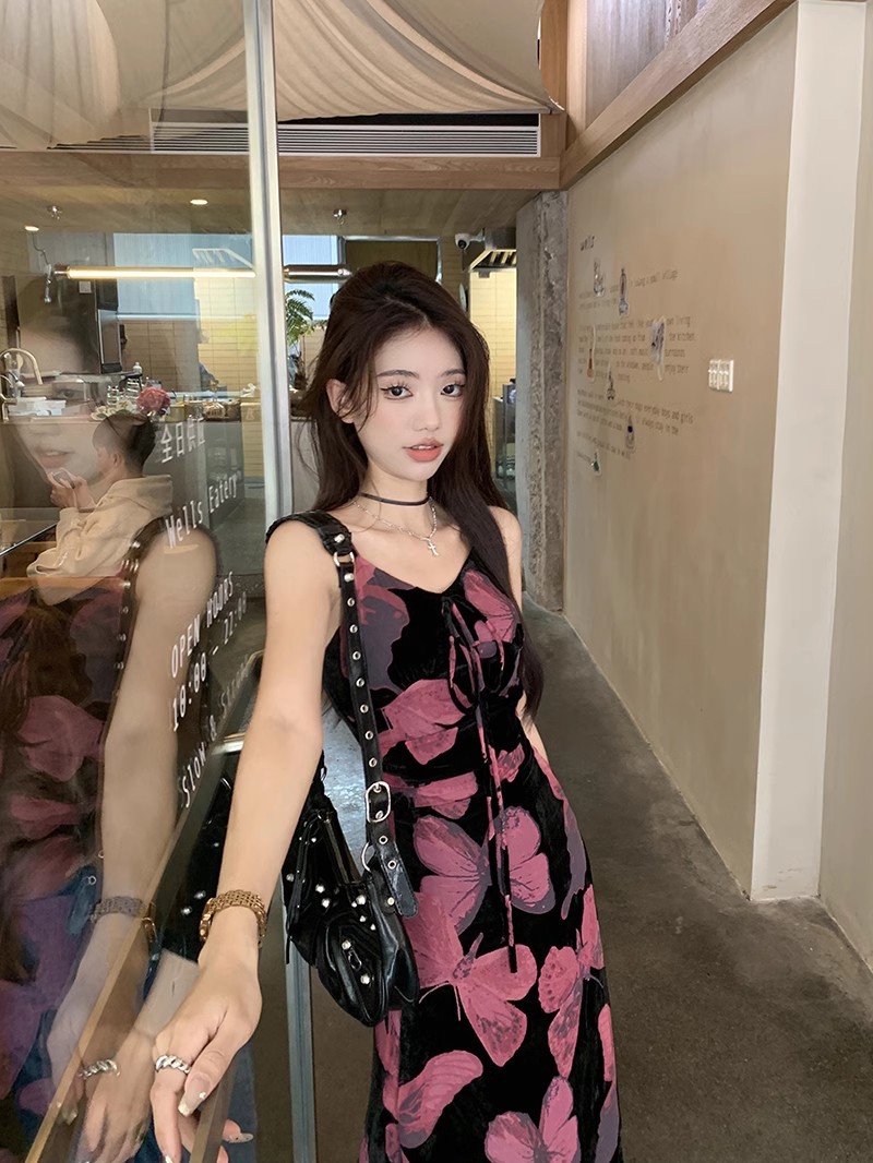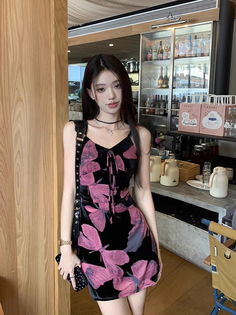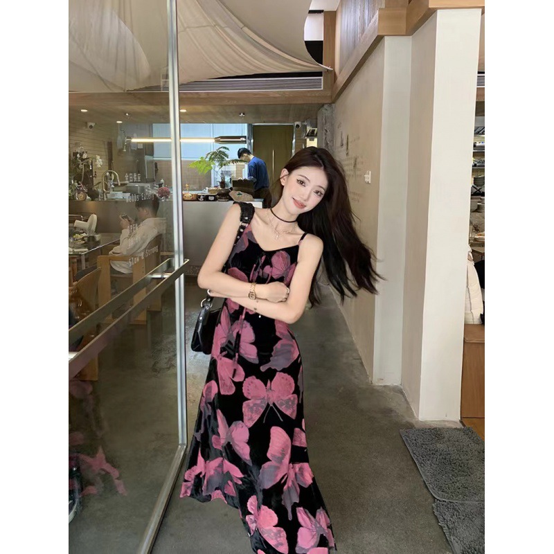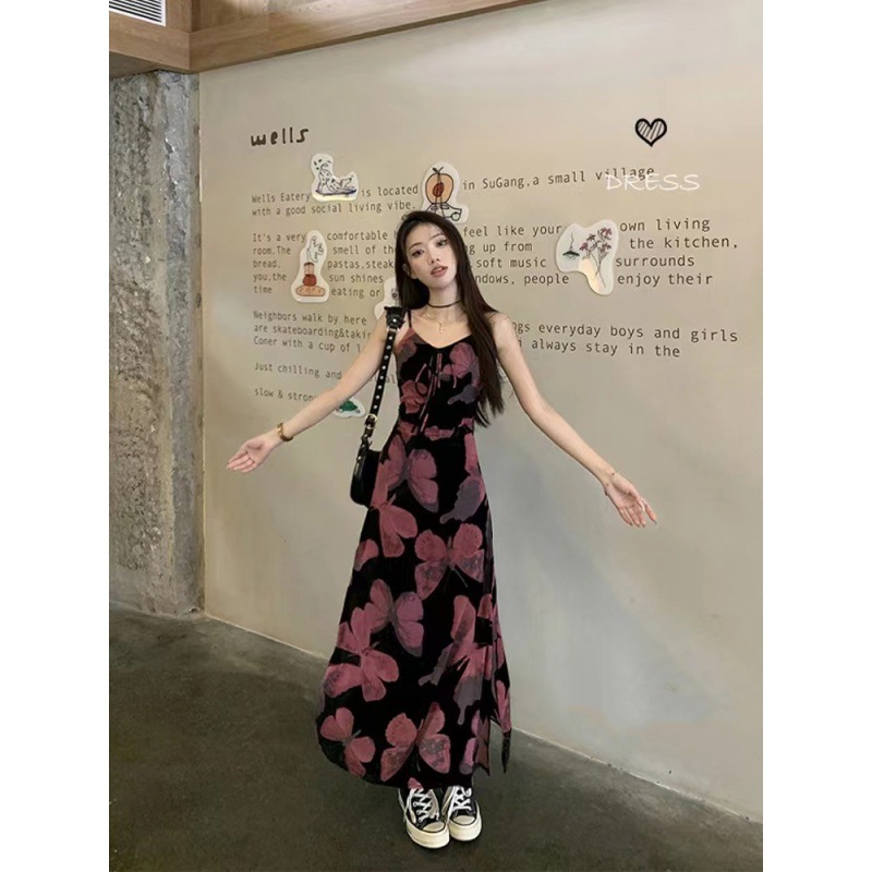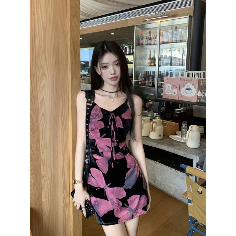 复古辣妹蝴蝶印花吊带连衣裙女夏季2024新款修身收腰气质包臀长裙