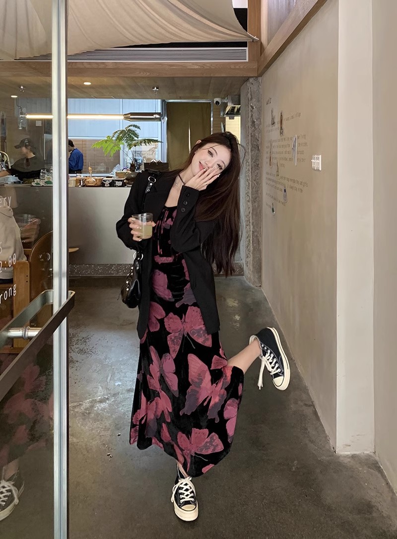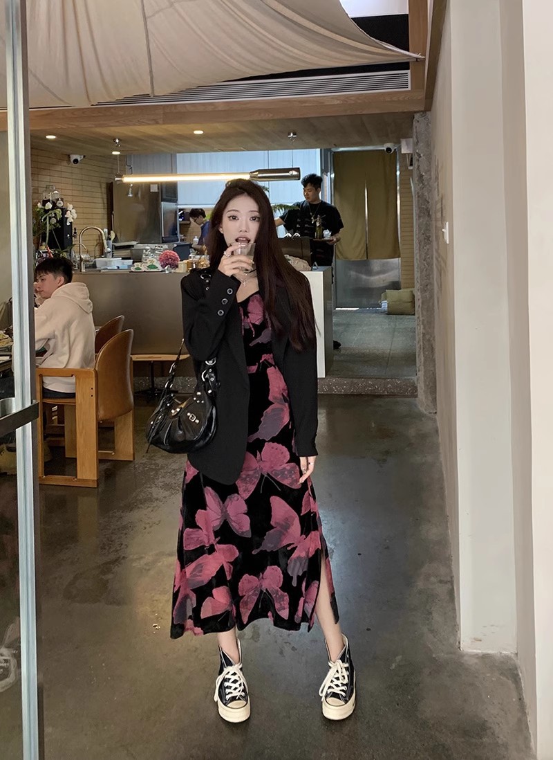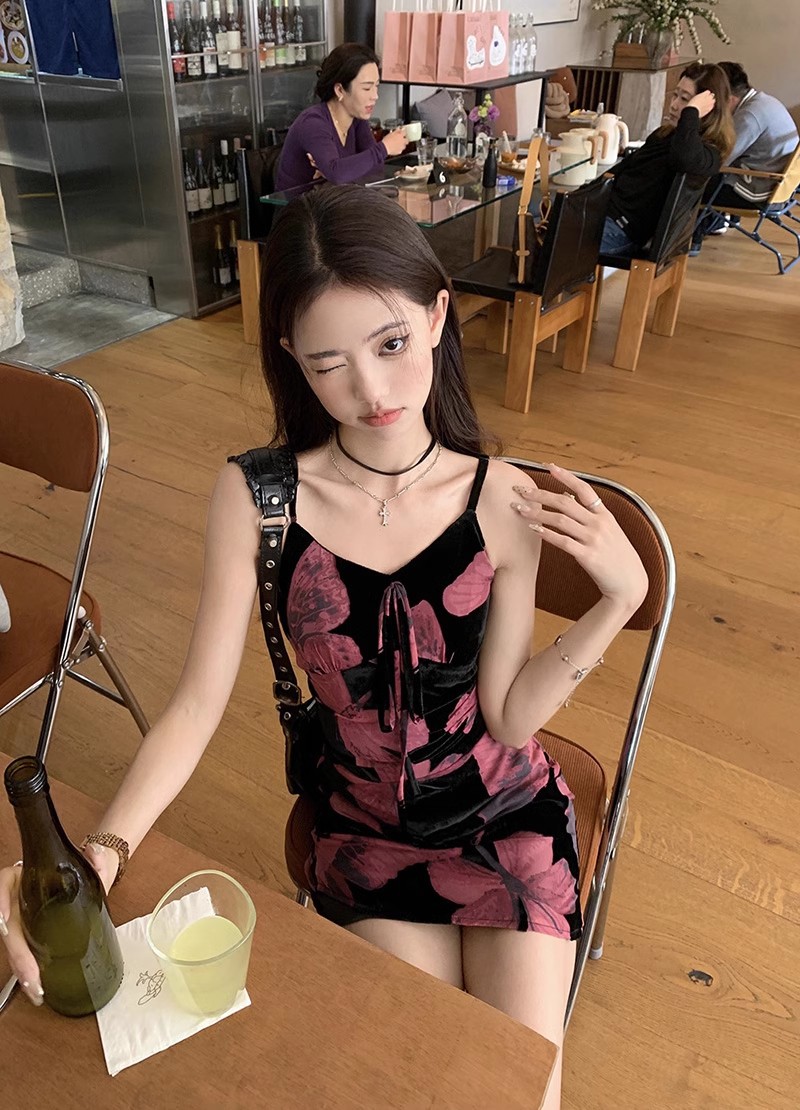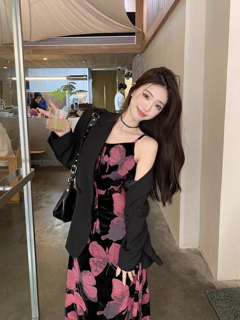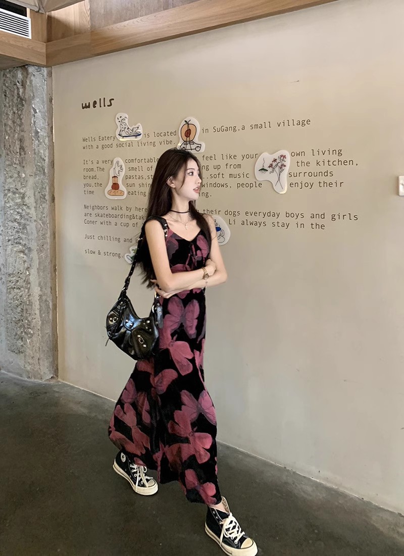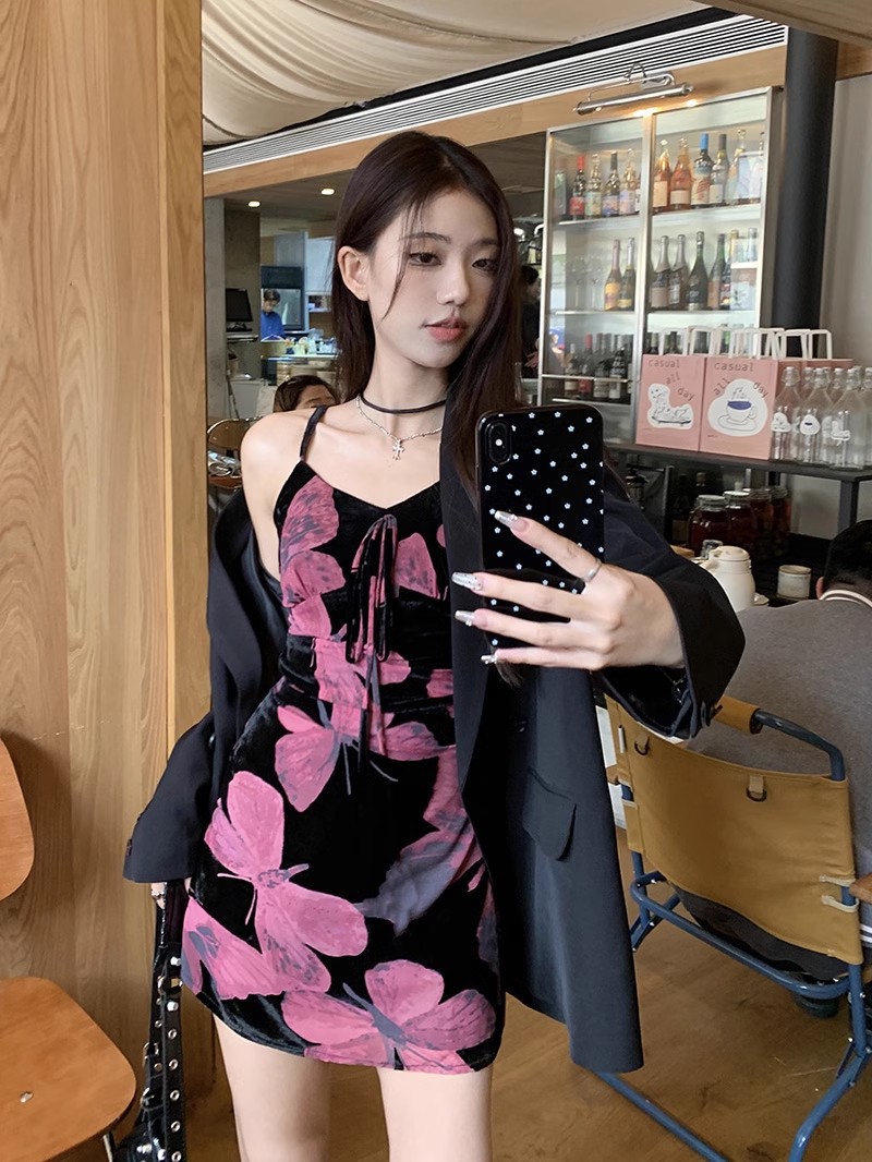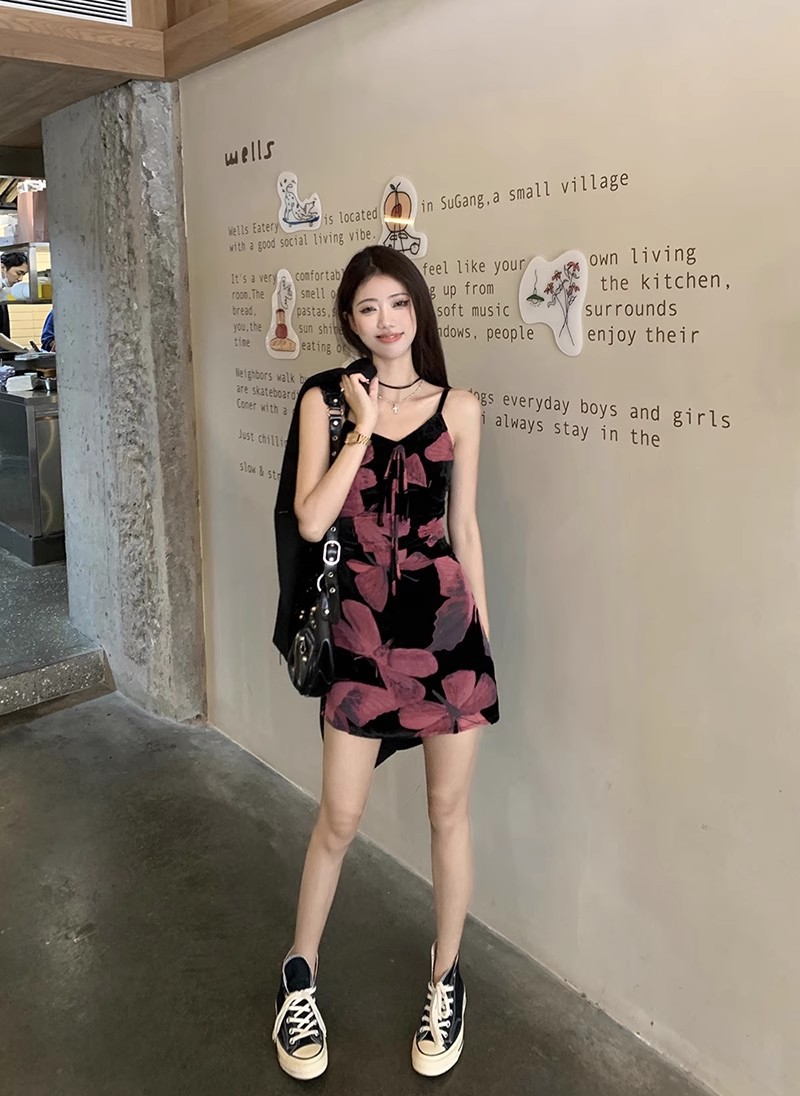 复古辣妹蝴蝶印花吊带连衣裙女夏季2024新款修身收腰气质包臀长裙