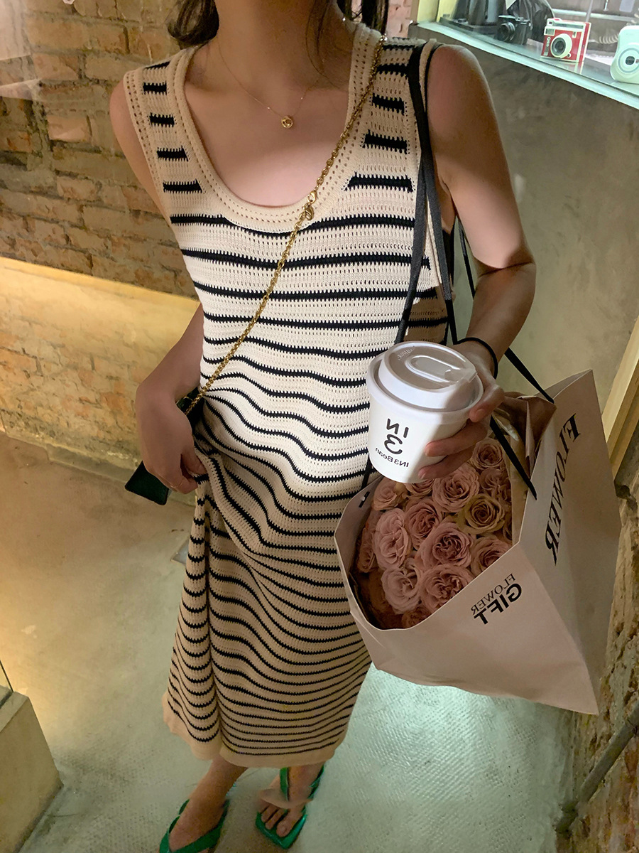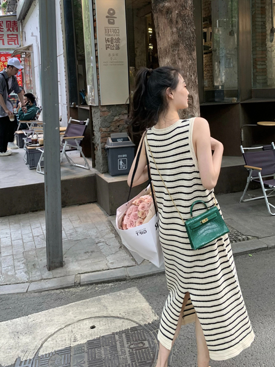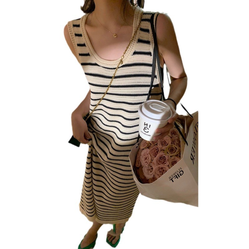 法式宽肩带休闲背心长裙子女夏季薄款冰丝条纹针织无袖吊带连衣裙