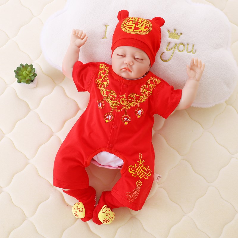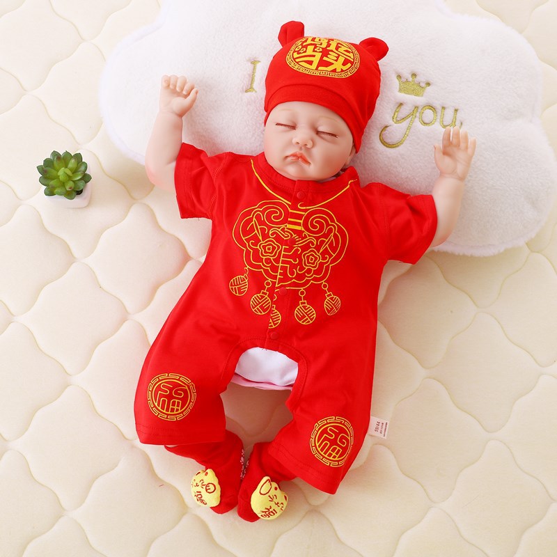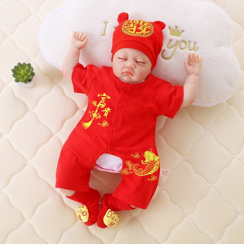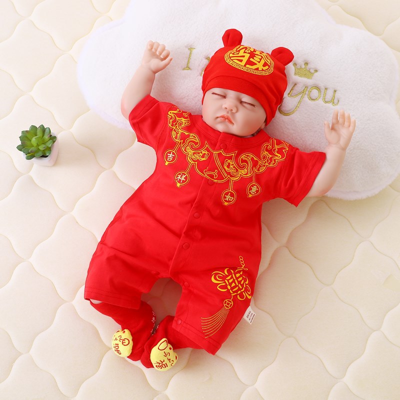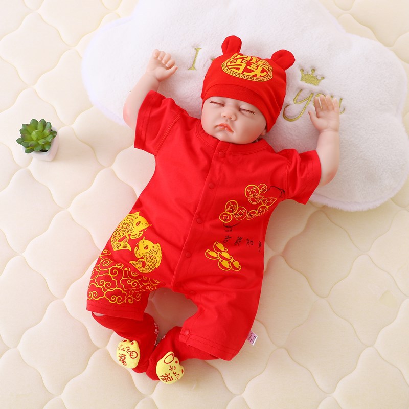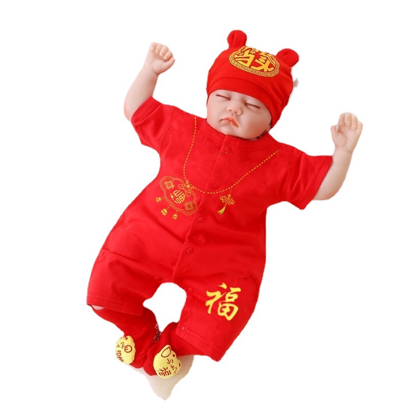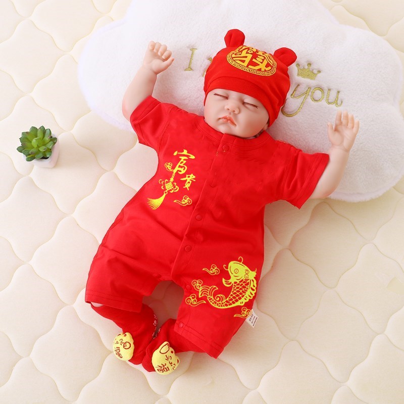婴儿喜庆红色短袖连体衣宝宝百天薄款满月服新生儿大红婴儿衣服