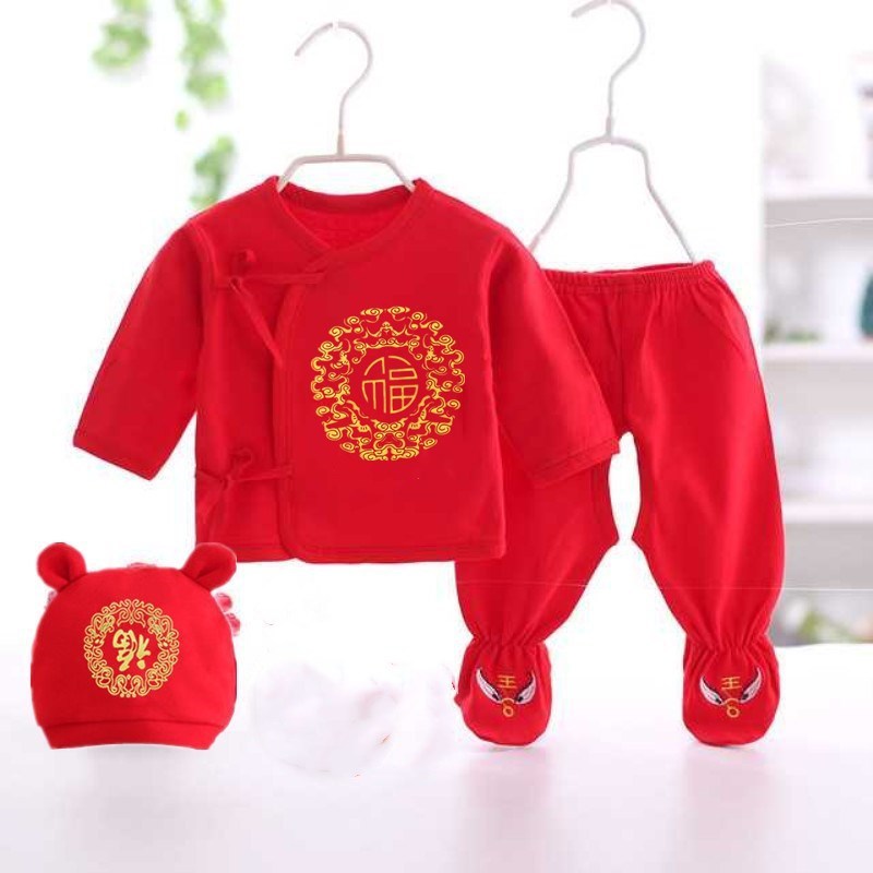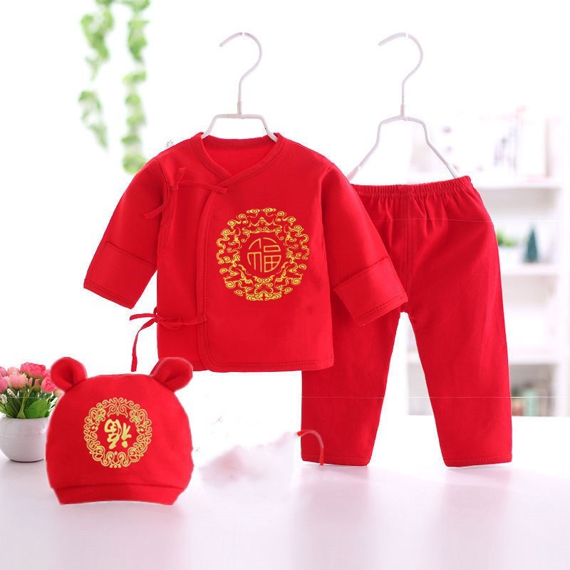 婴儿红色系带三件套满月百天喜庆服幼儿衣服红色帽子宝宝服饰