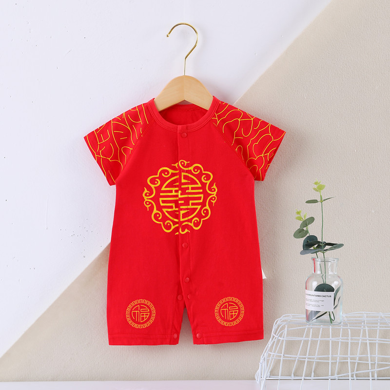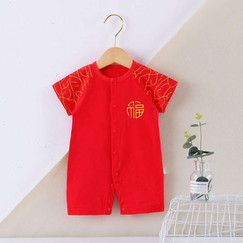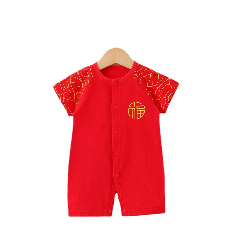 2023夏季新款婴儿超萌夏季短袖无骨连体宝宝新生儿喜庆红色衣服