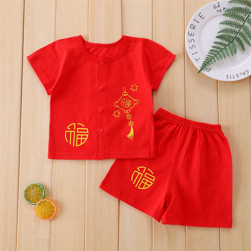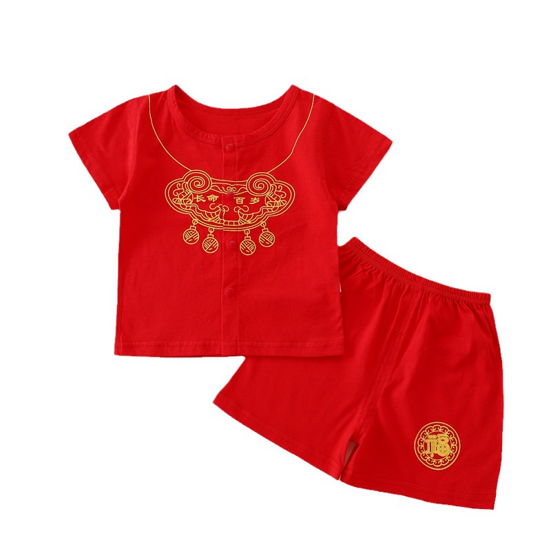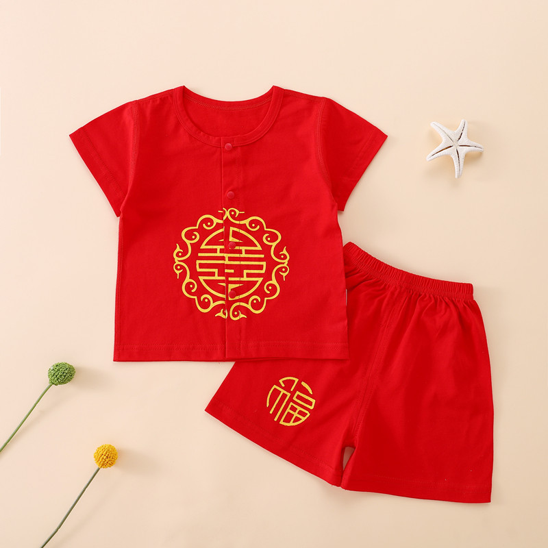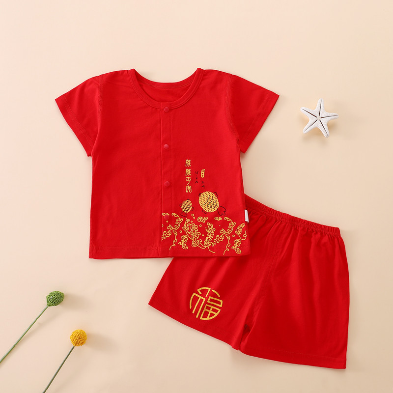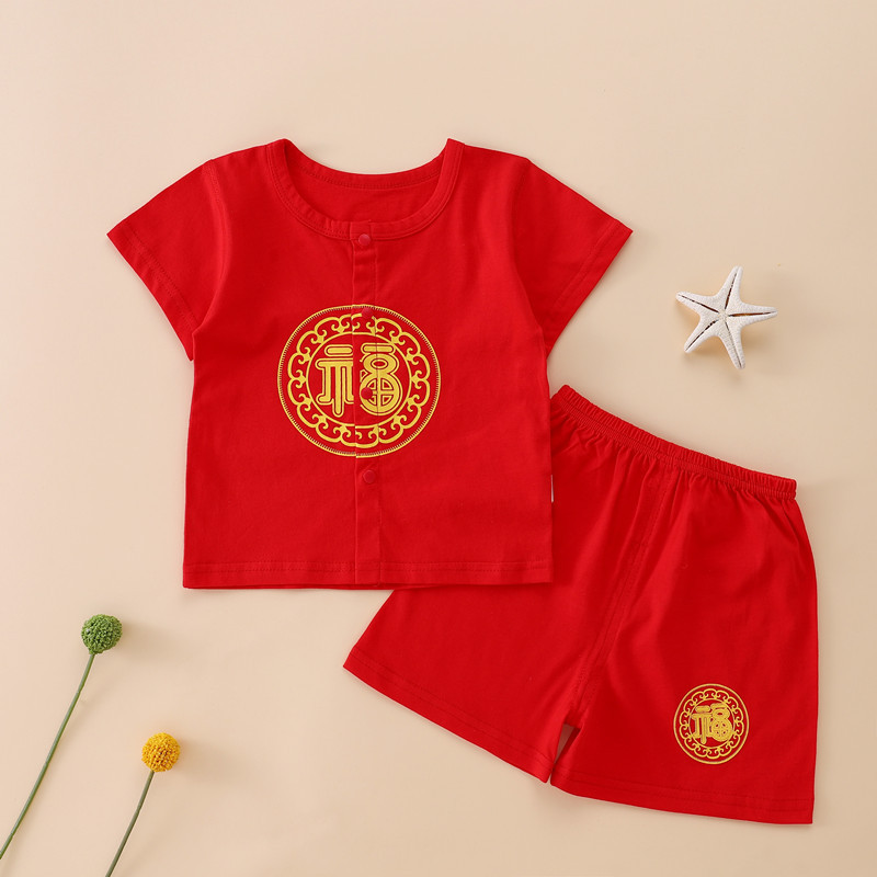 2023年新款宝宝短袖套装夏季薄款婴儿服无骨红色喜庆抓周服百天服
