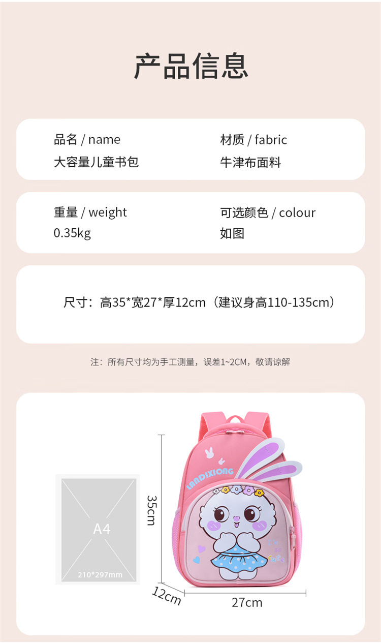 新款幼儿园可爱兔子书包大班中班小班卡通趣味男女小孩轻便双肩包