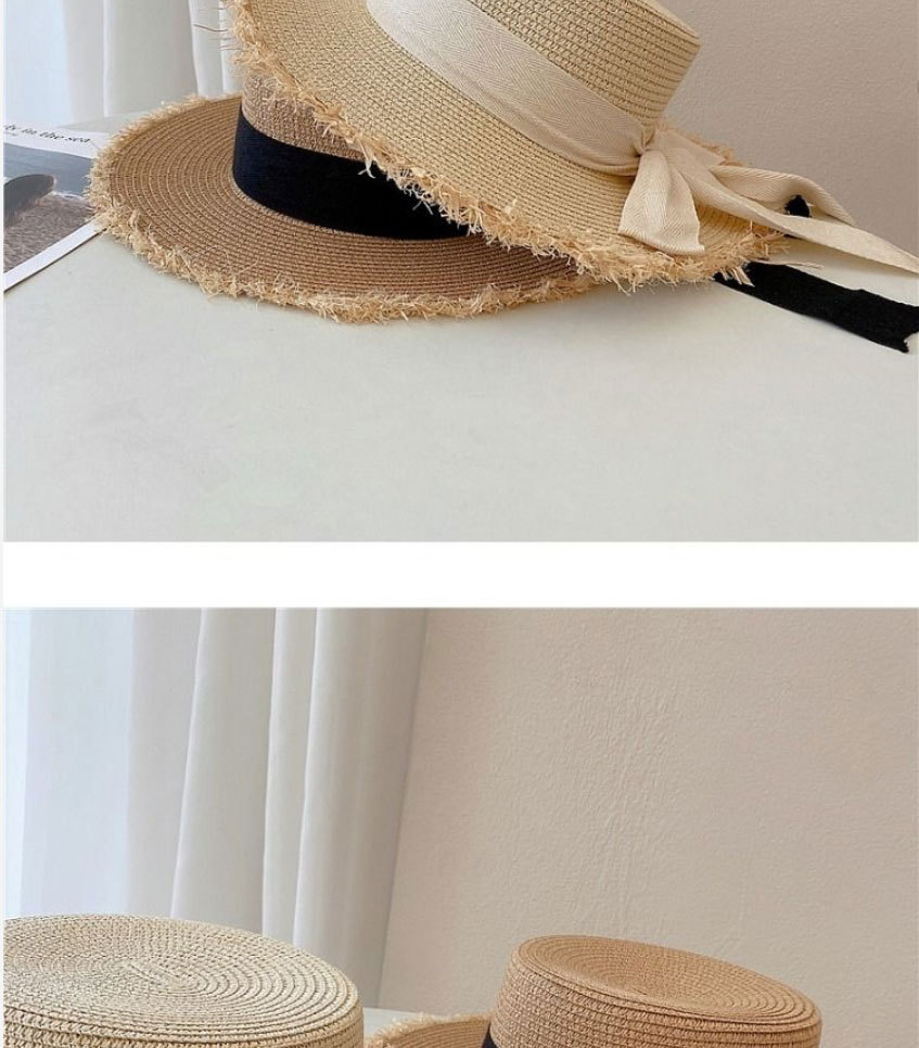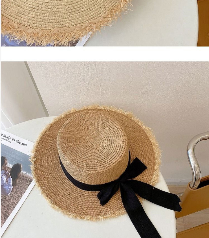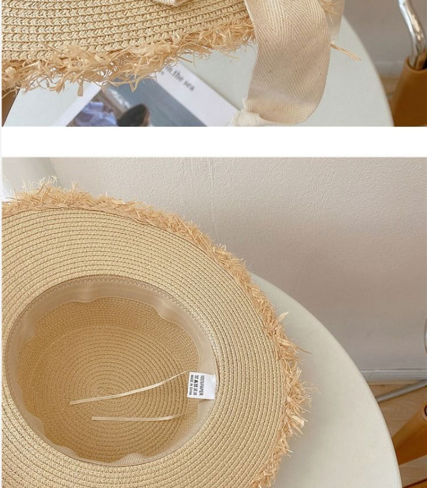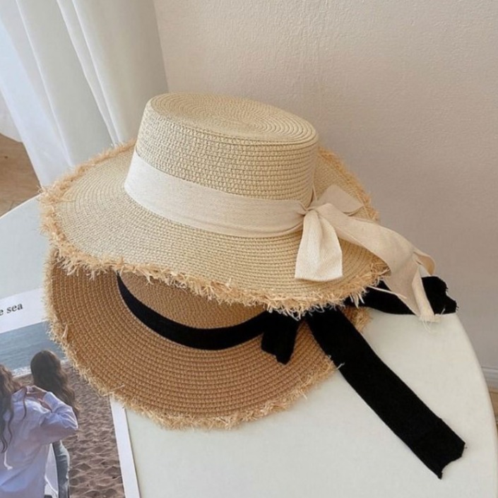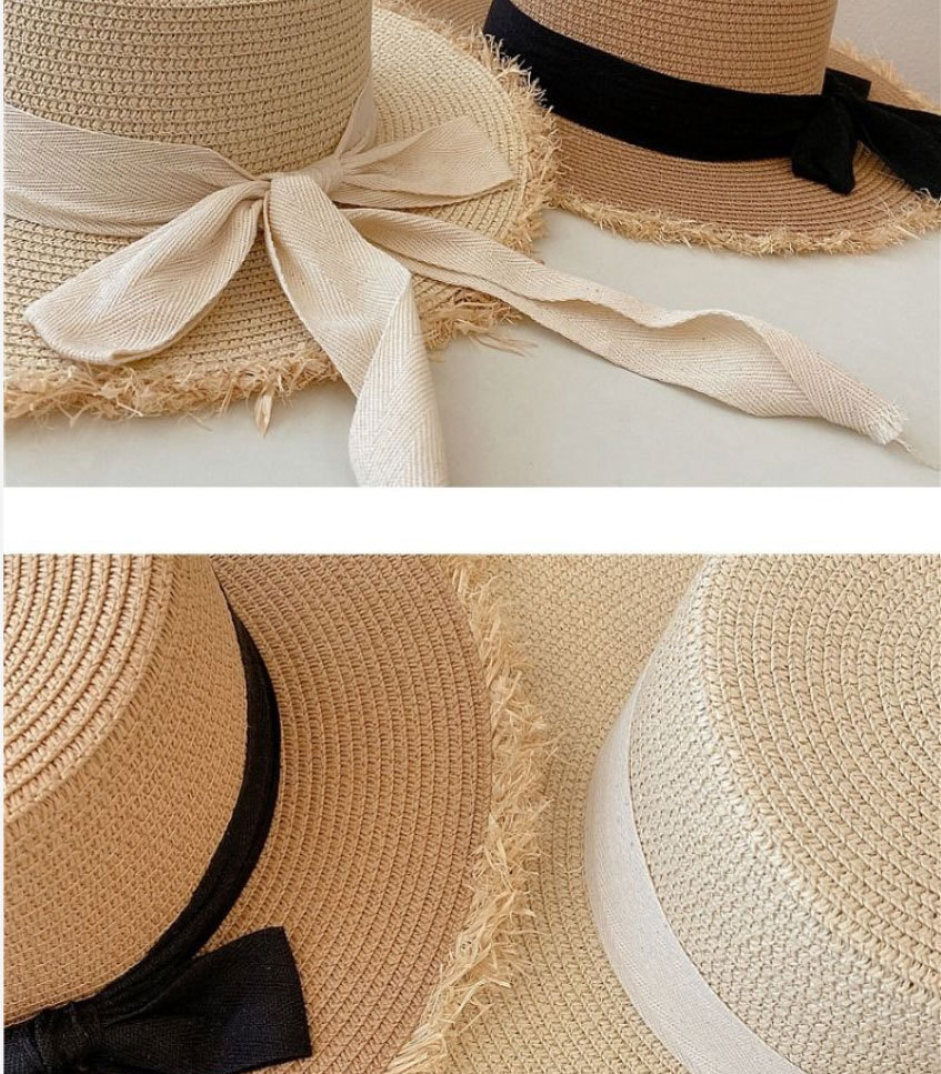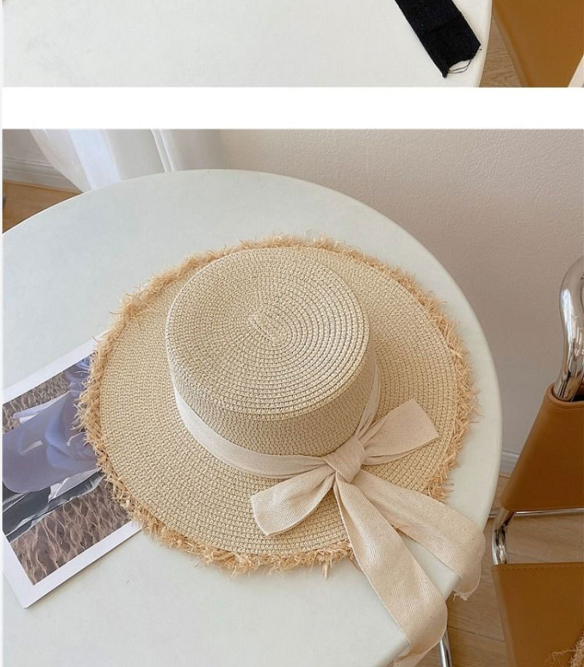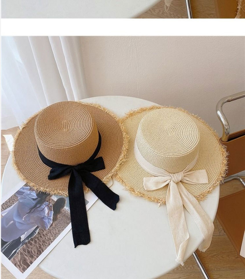 蝴蝶结草编帽子平顶毛边草帽编织女大帽檐夏季度假沙滩遮阳防晒帽