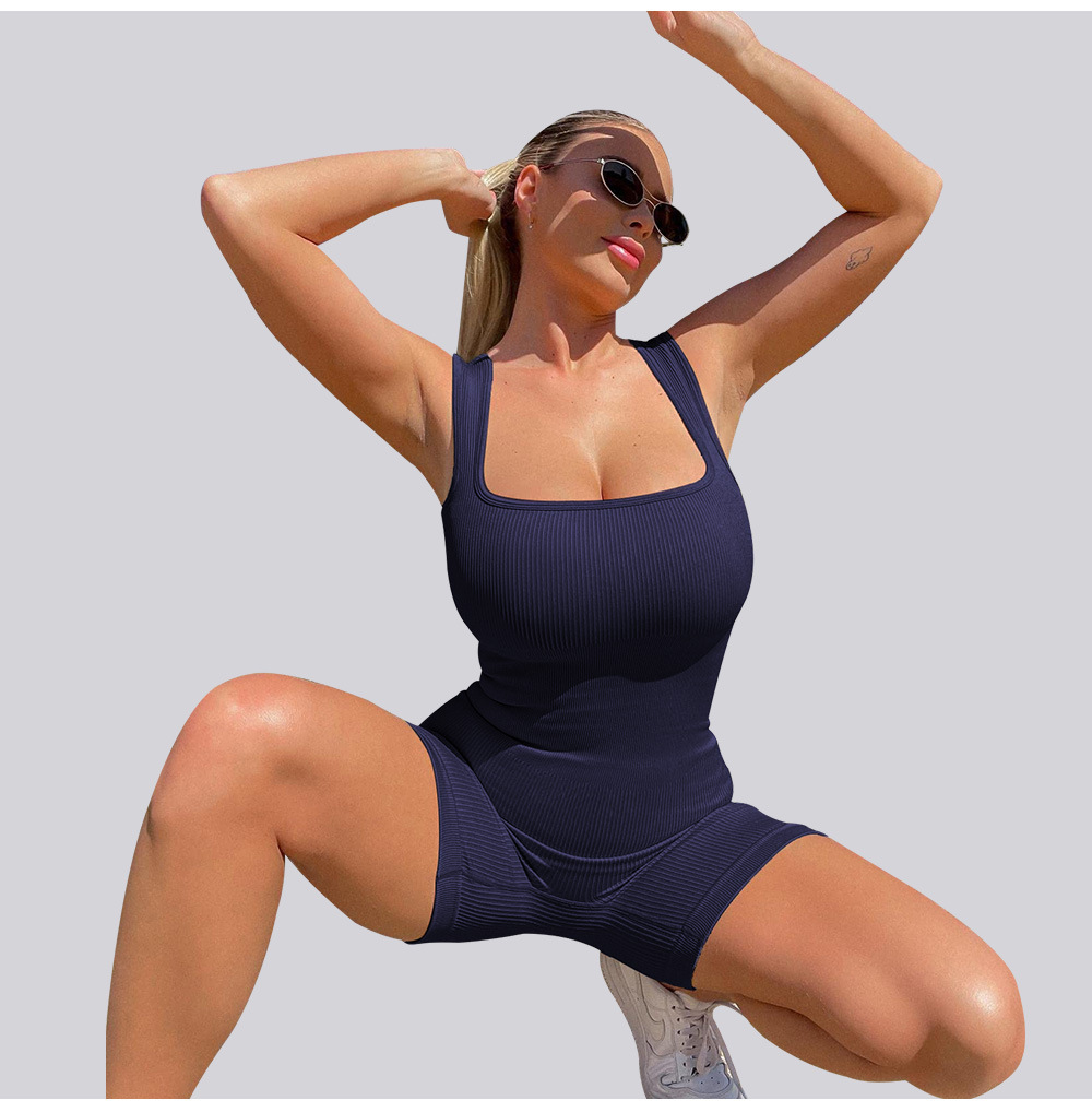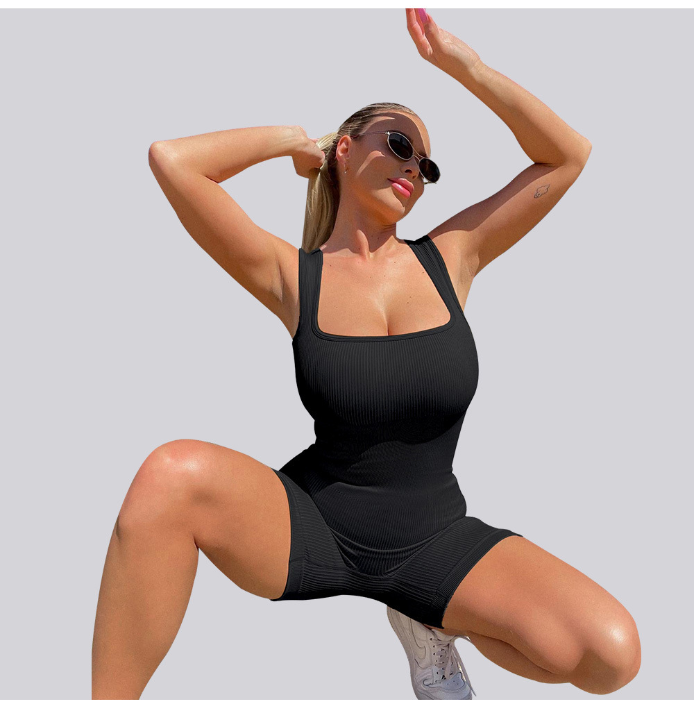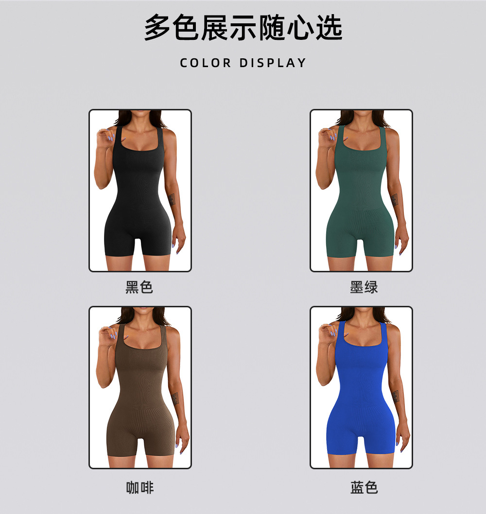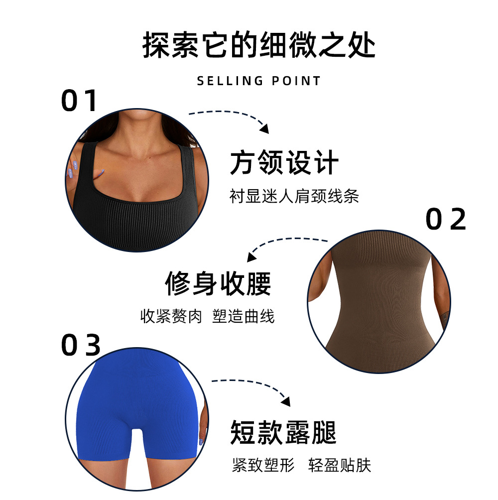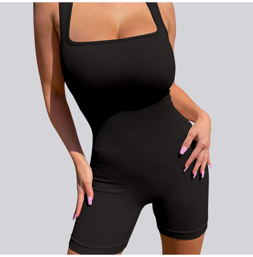 欧美跨境亚马逊OQQ短裤款连体衣可拆卸胸垫螺纹紧身健身服