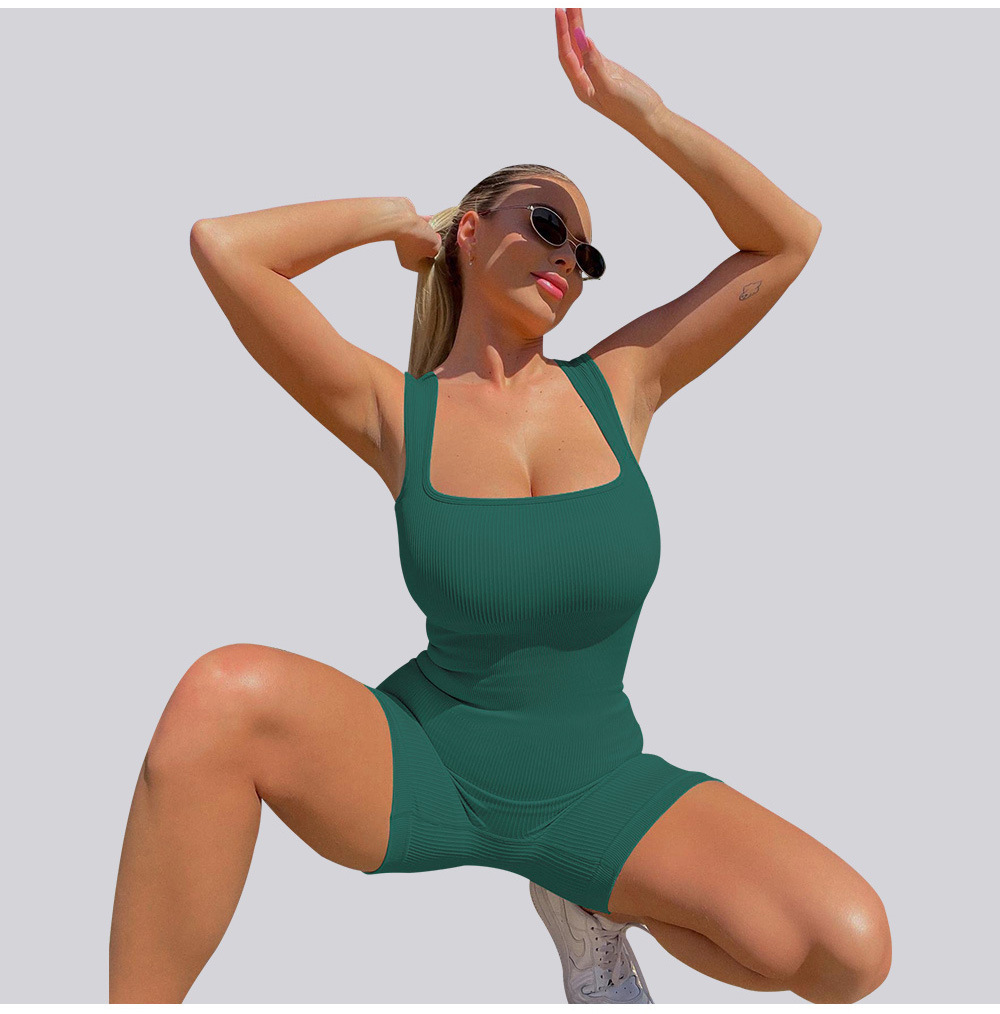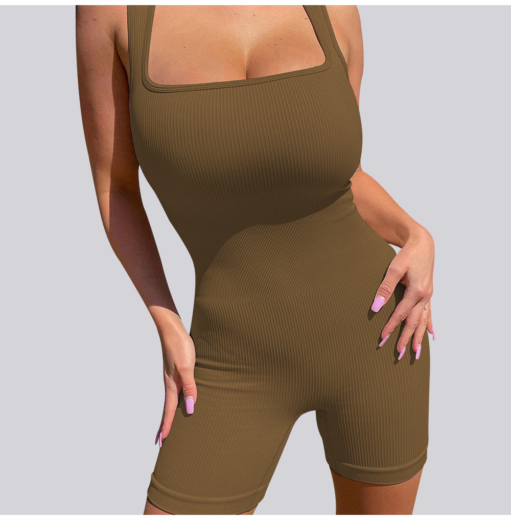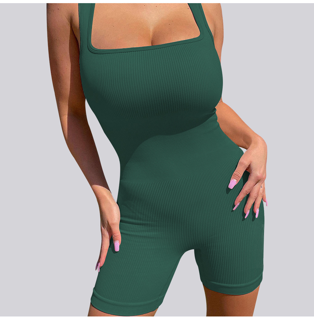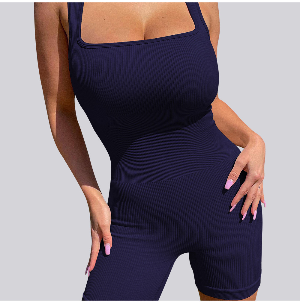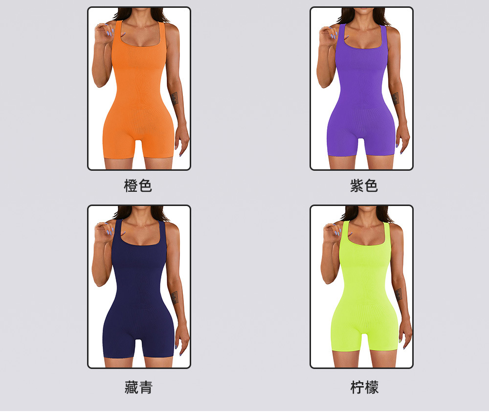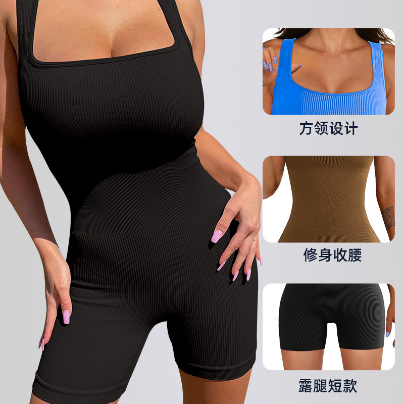 欧美跨境亚马逊OQQ短裤款连体衣可拆卸胸垫螺纹紧身健身服