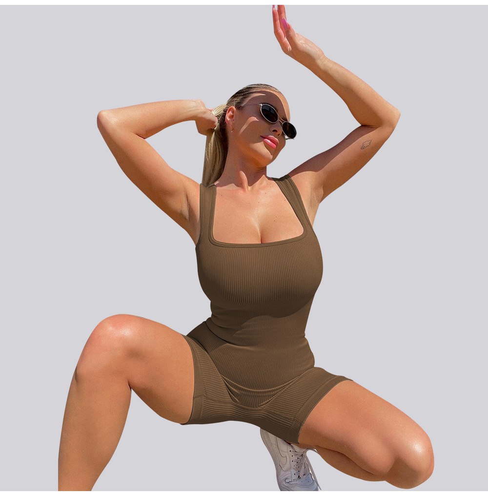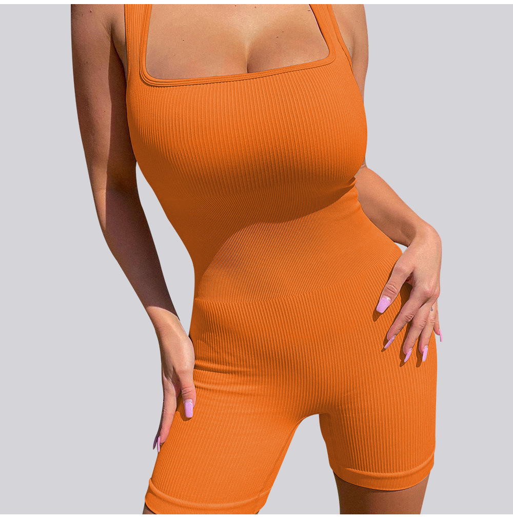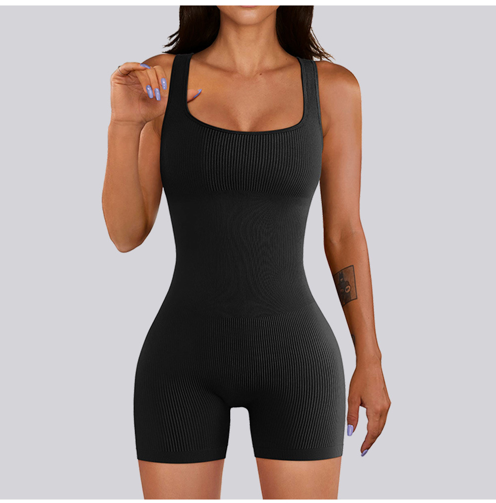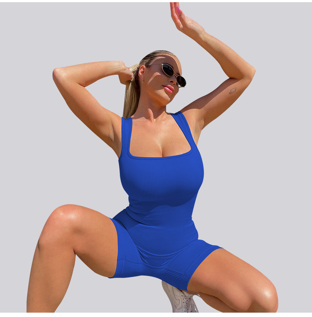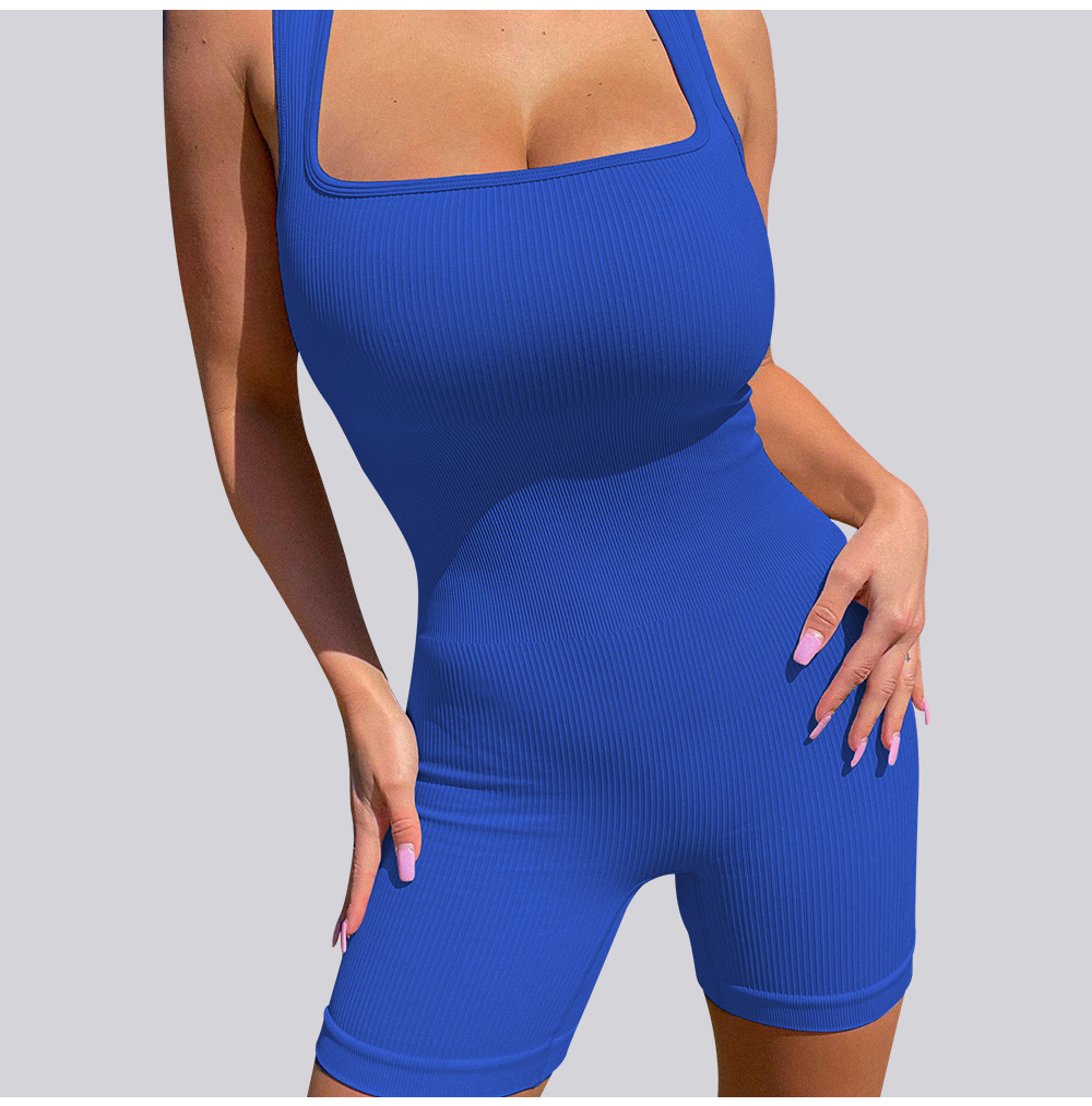 欧美跨境亚马逊OQQ短裤款连体衣可拆卸胸垫螺纹紧身健身服