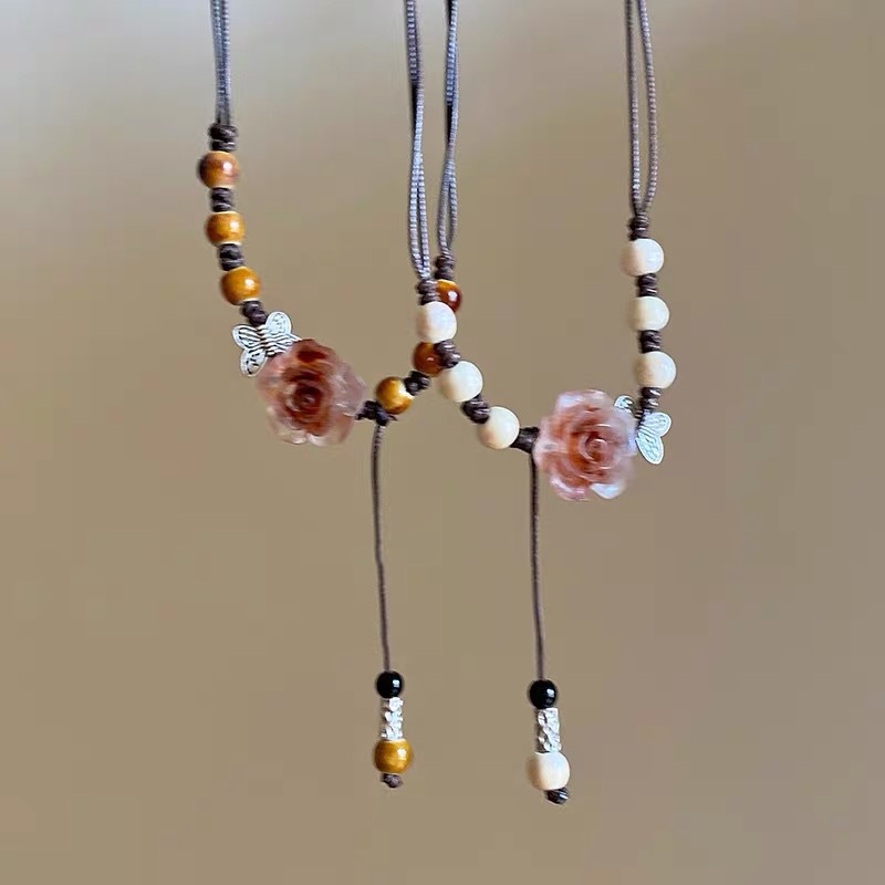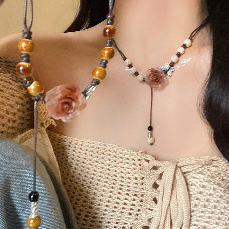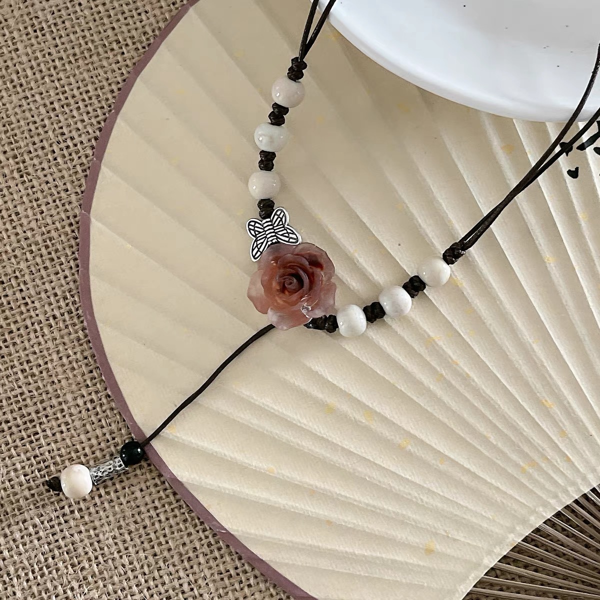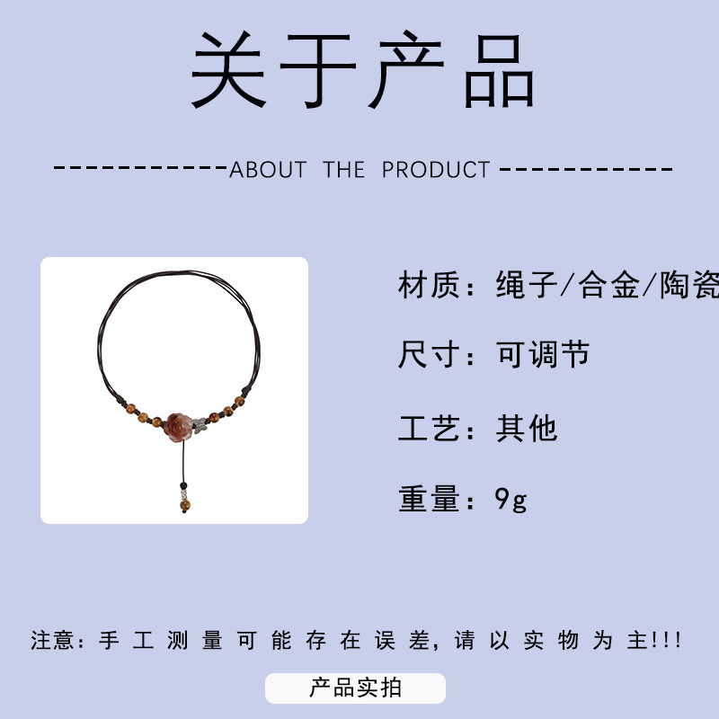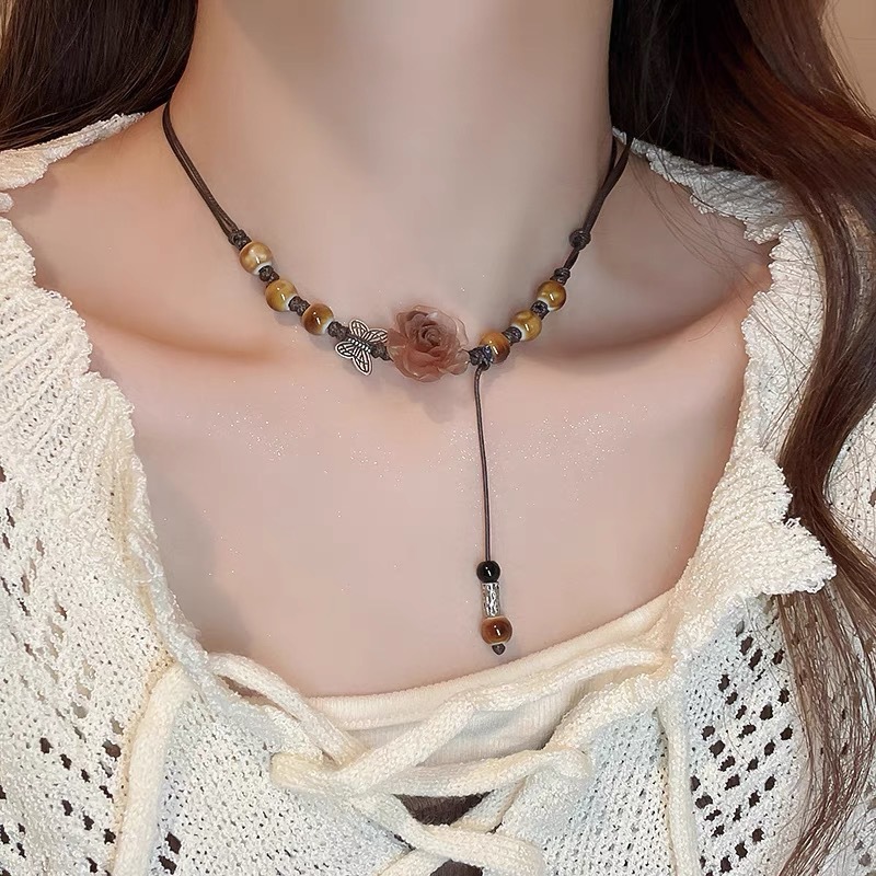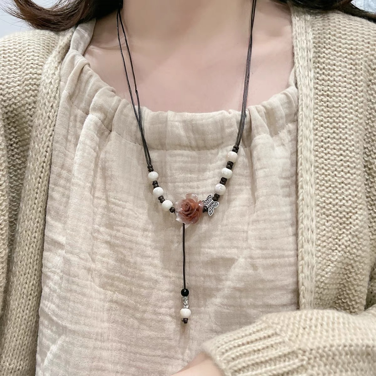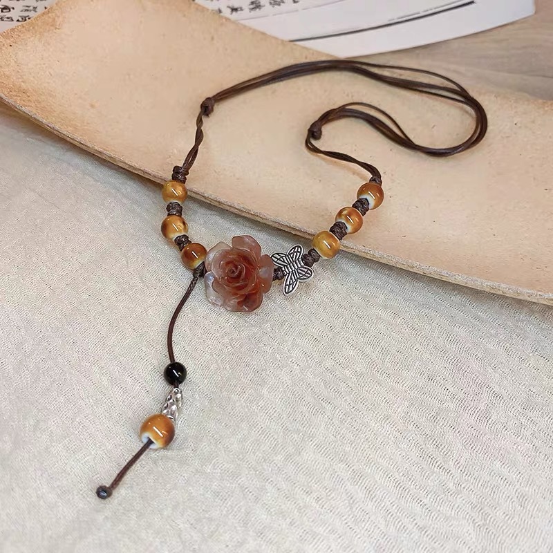 新中式复古山茶花朵陶瓷蝴蝶串珠项链女民族风小众时尚百搭锁骨链