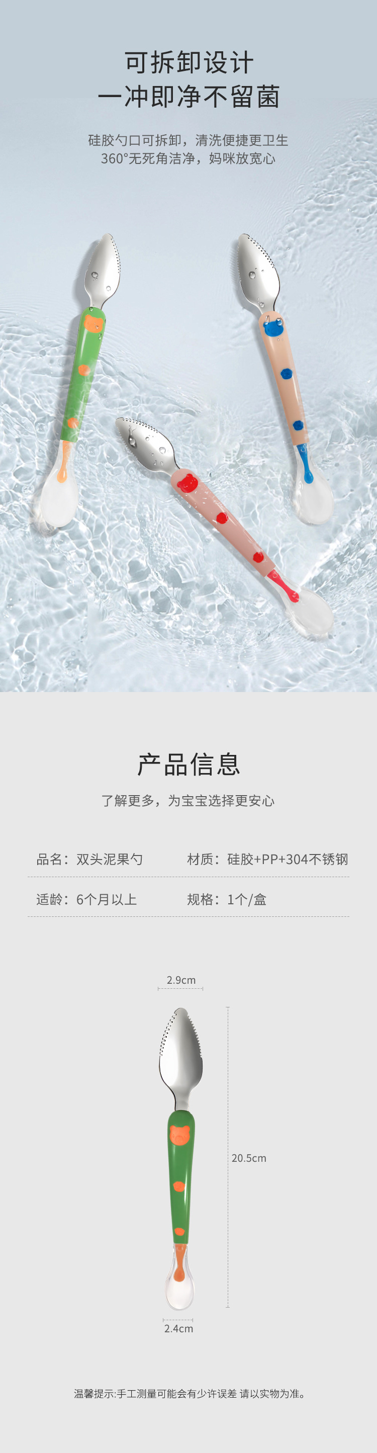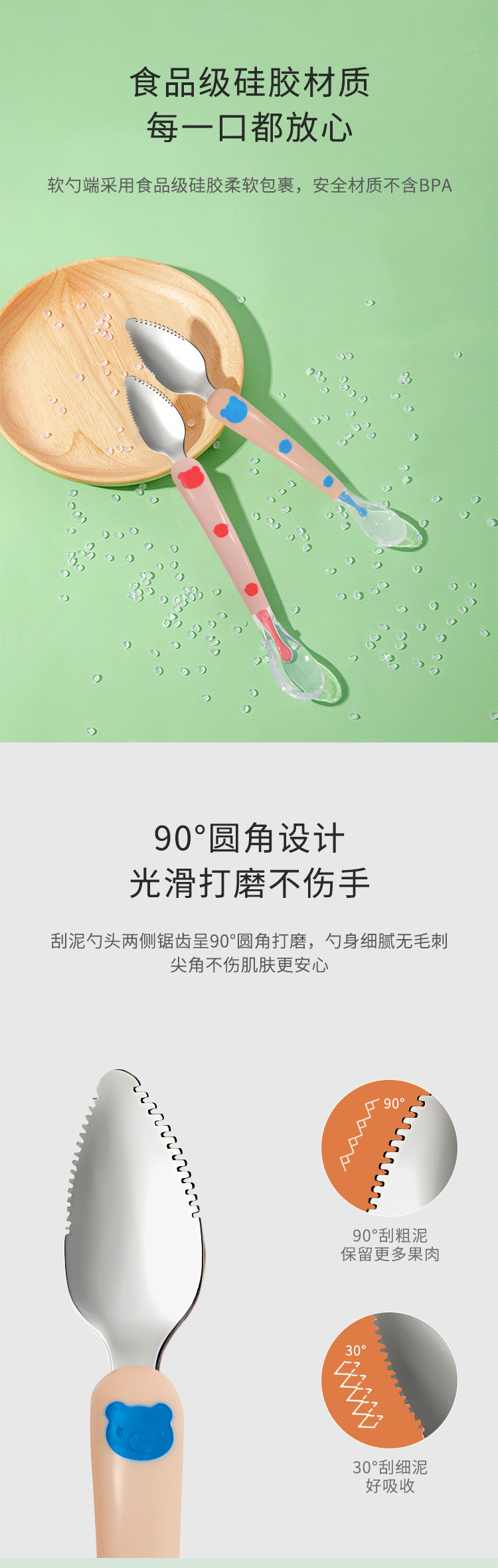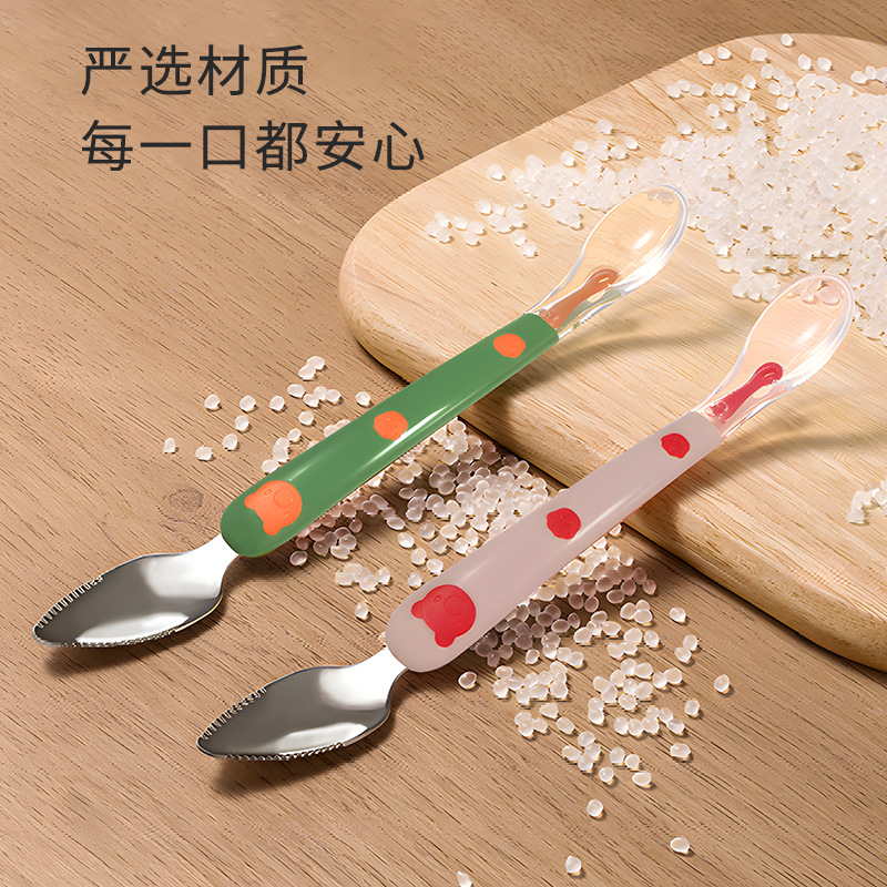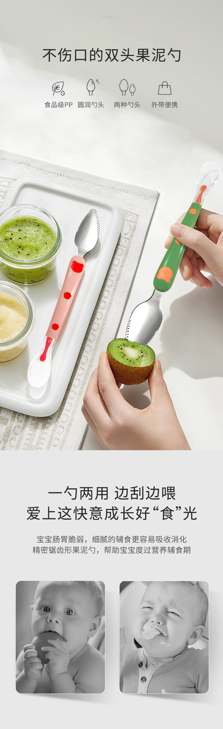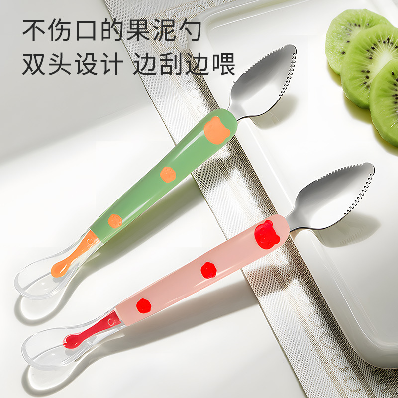 婴儿水果刮泥勺子宝宝勺不锈钢双头食品级水果辅食硅胶儿童餐具批