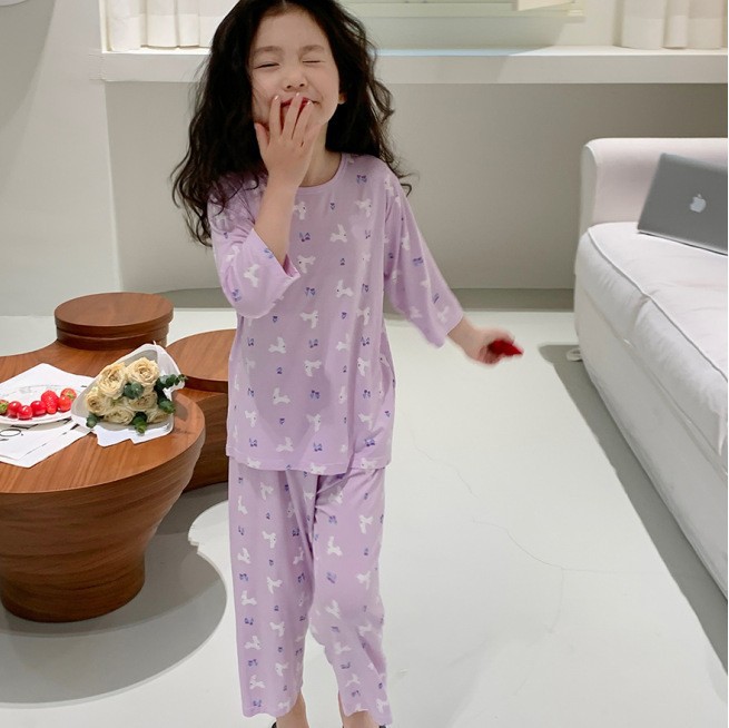 儿童睡衣夏季薄款雅赛尔男孩七分袖花边宝宝空调服女童家居服套装