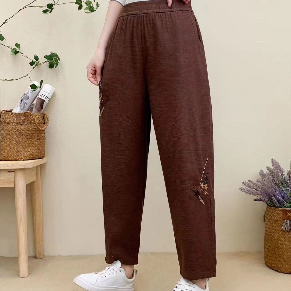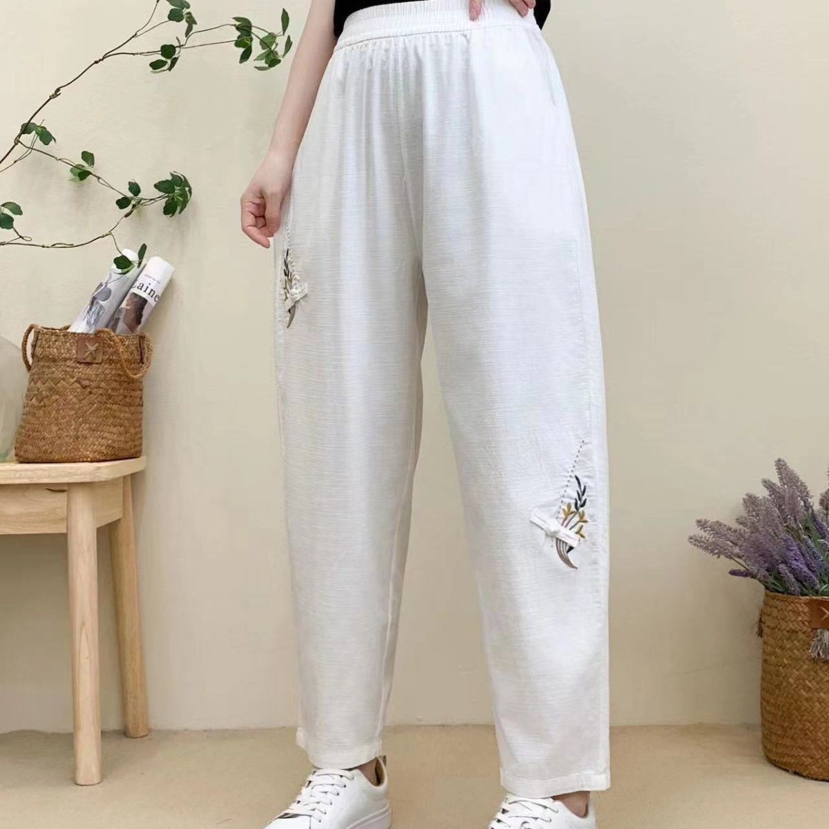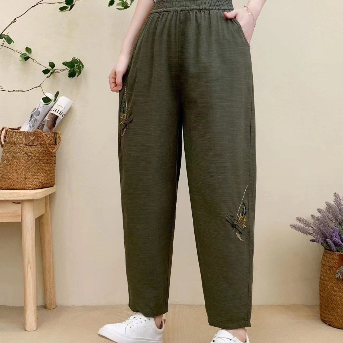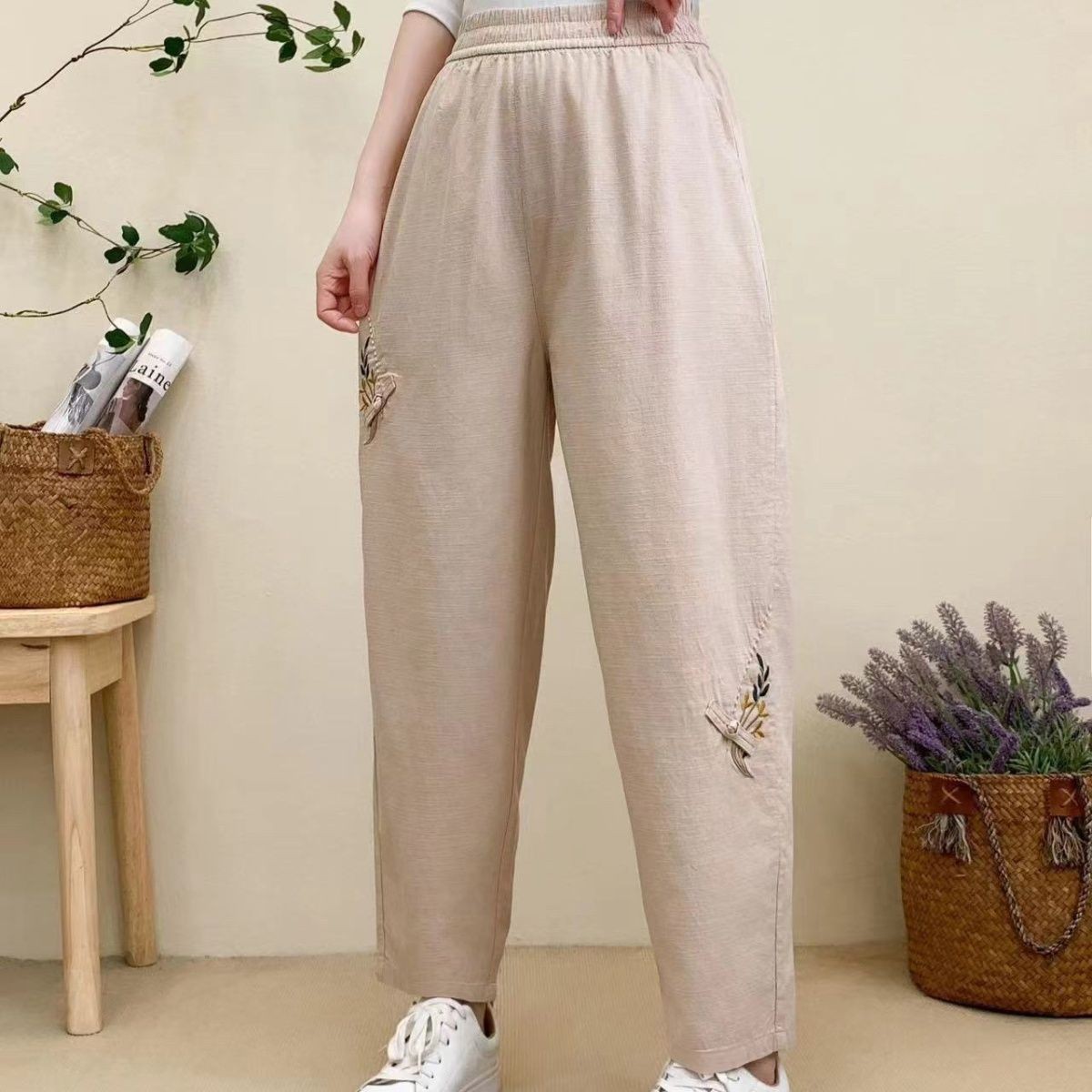 绣花夏季新款竹节麻九分裤薄款宽松大码女裤妈妈松紧腰弹力高腰裤