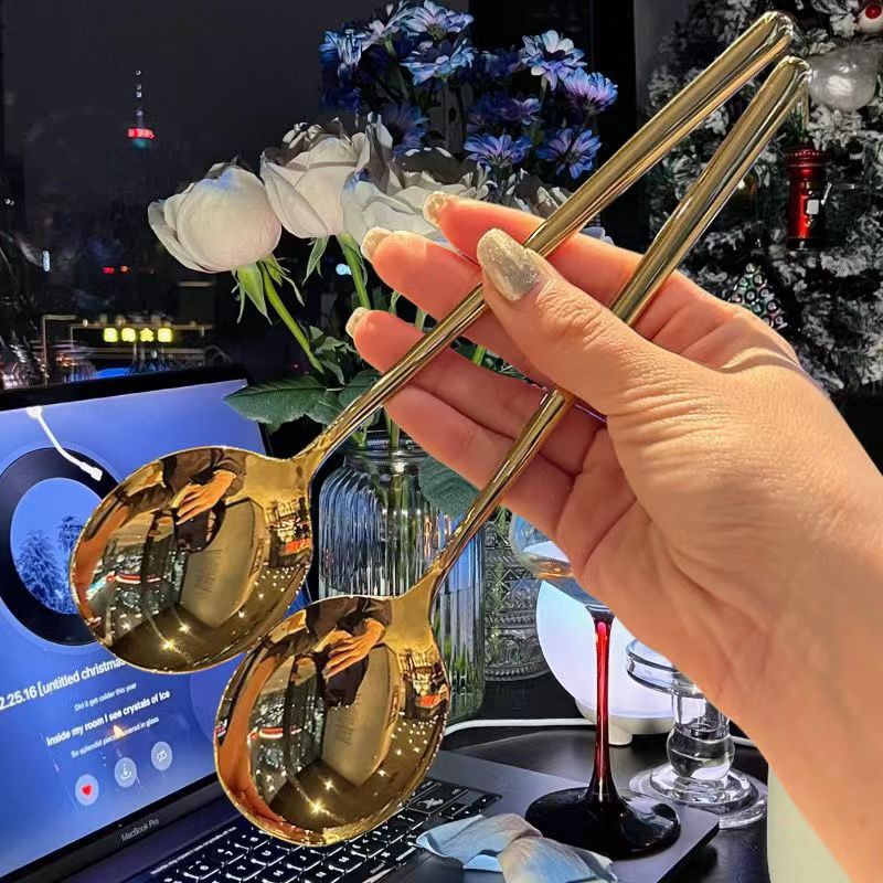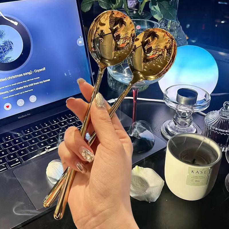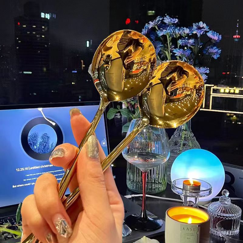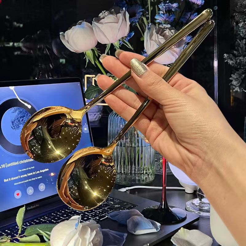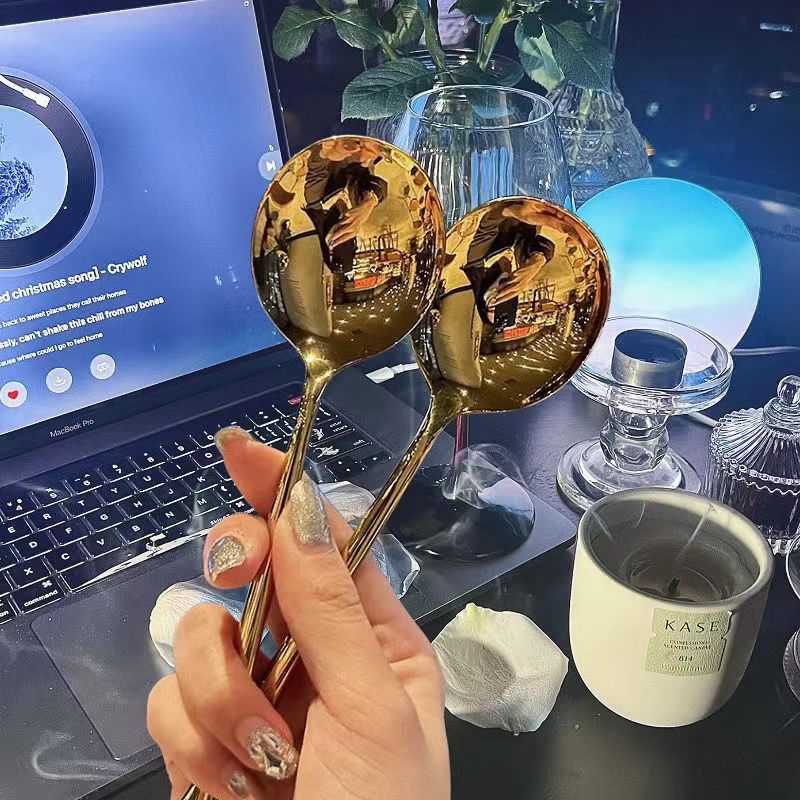 不锈钢勺子韩式圆勺家用长款喝汤勺网红ins高颜值圆头勺金色汤匙