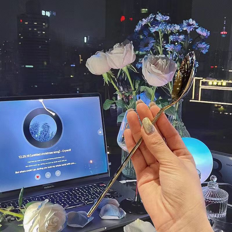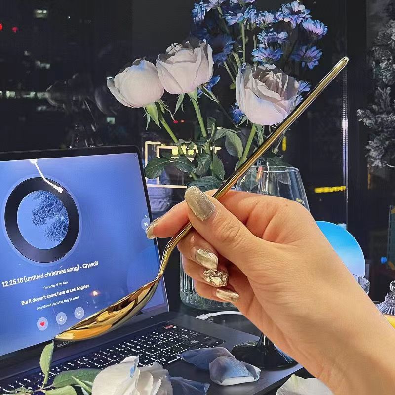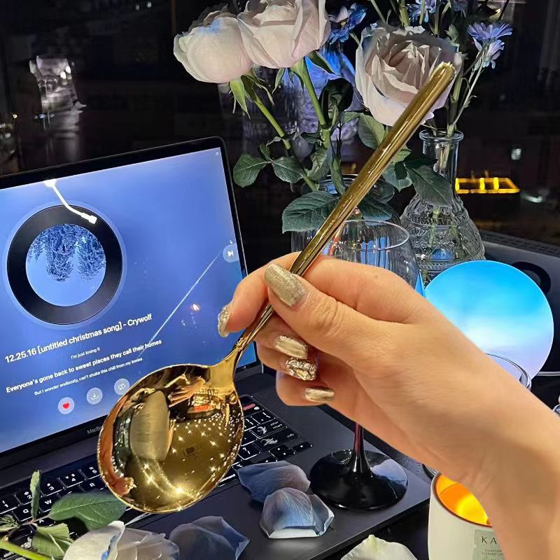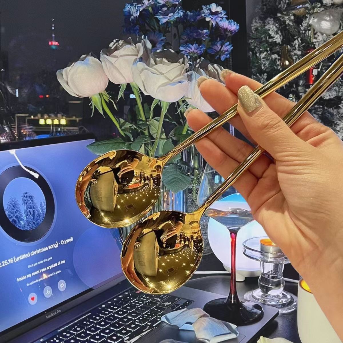 不锈钢勺子韩式圆勺家用长款喝汤勺网红ins高颜值圆头勺金色汤匙