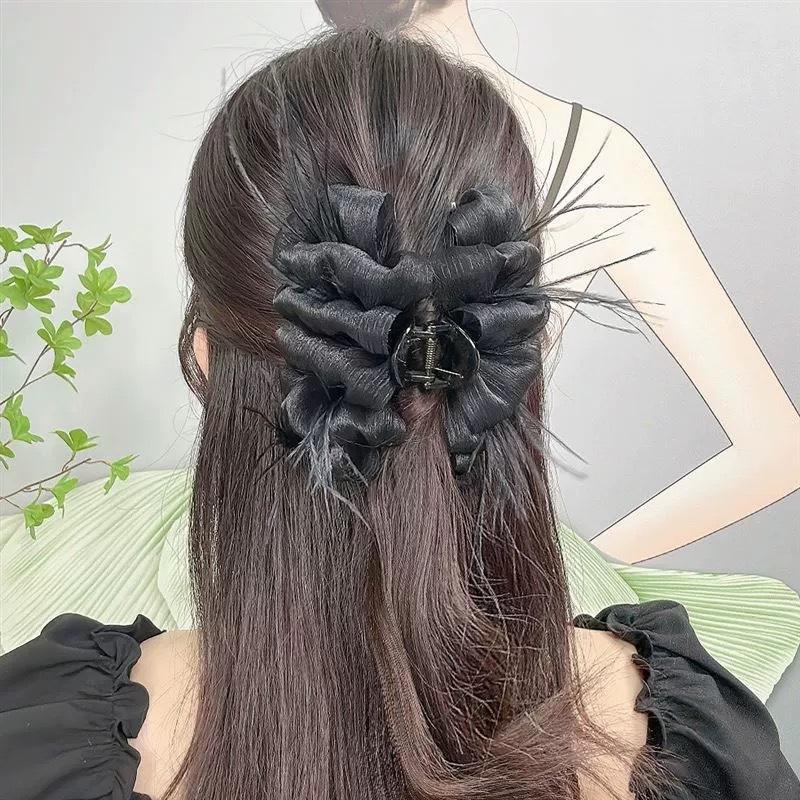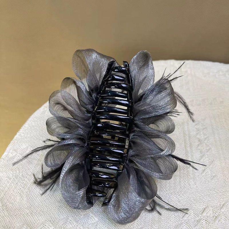 气质云朵泡泡网纱抓夹女发卡感盘发大抓夹羽毛黑色夹头饰发夹头饰