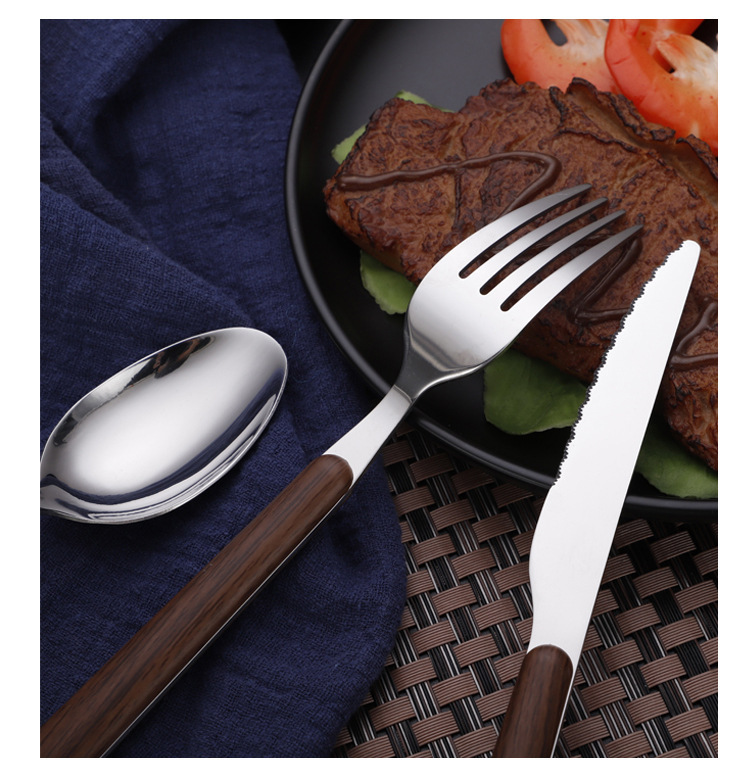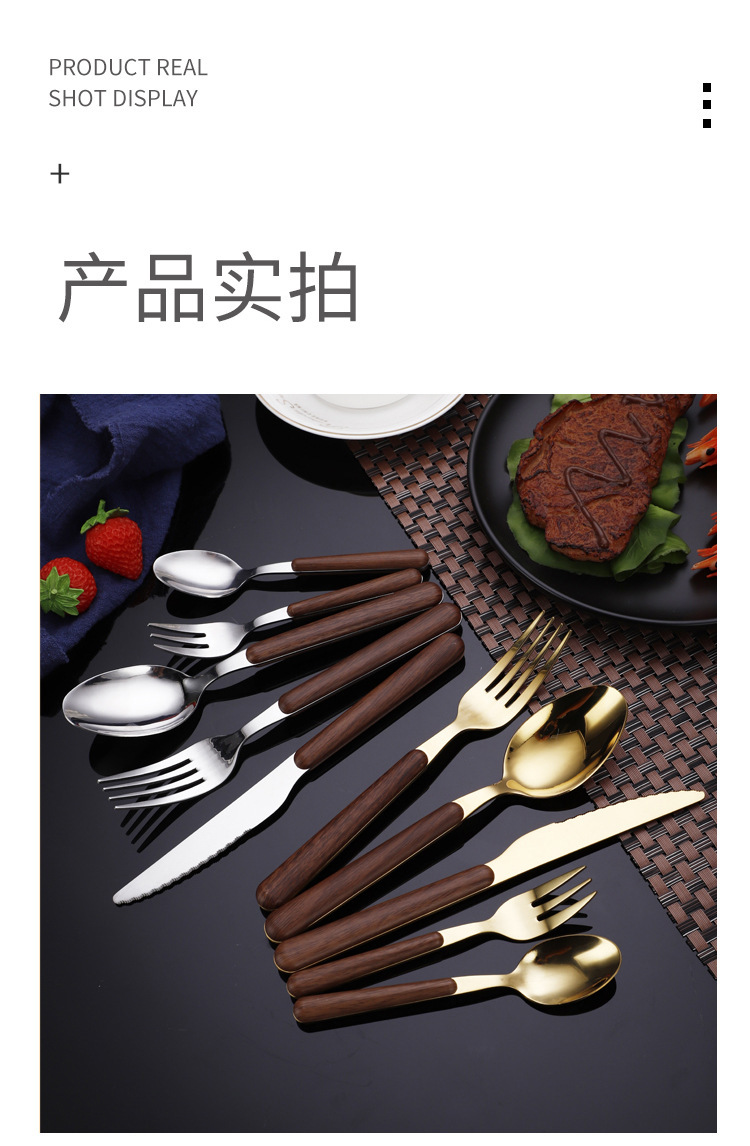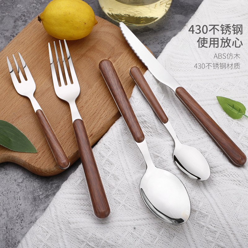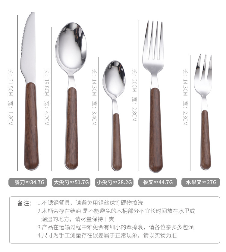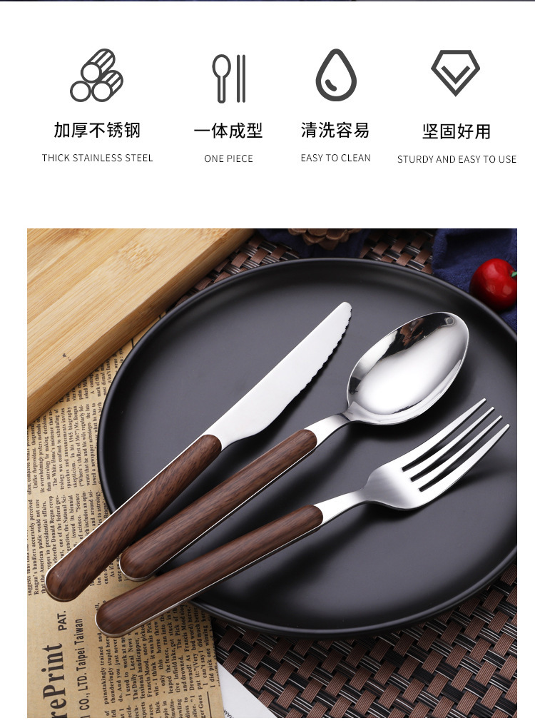 便携风夹柄不锈钢餐具牛排全套刀叉勺甜品品质仿木勺子叉子高颜值