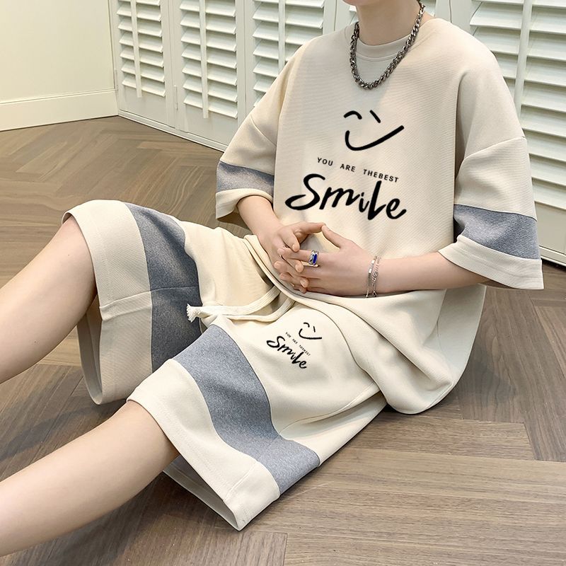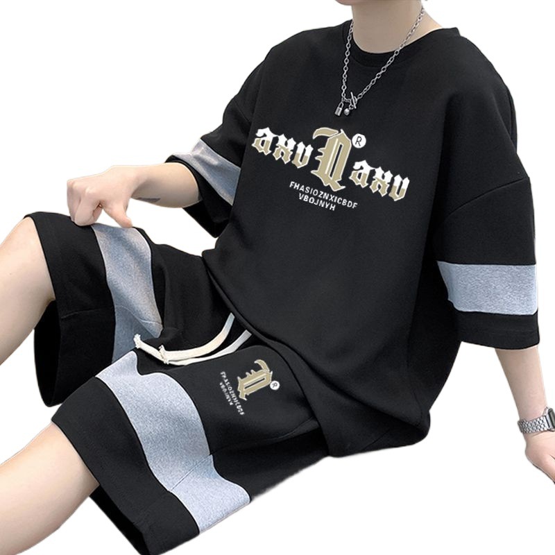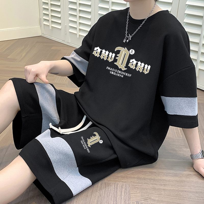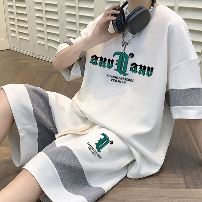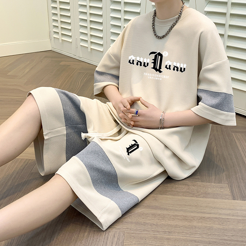 2024夏爆款时尚华夫格套装男T恤短袖短裤冰丝胖子休闲运动两件套