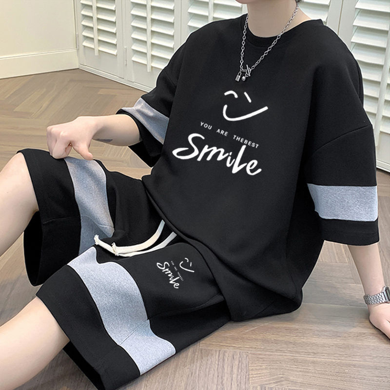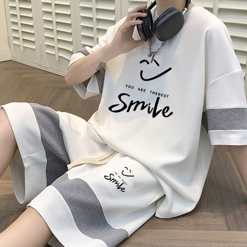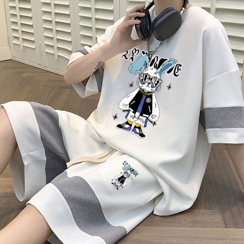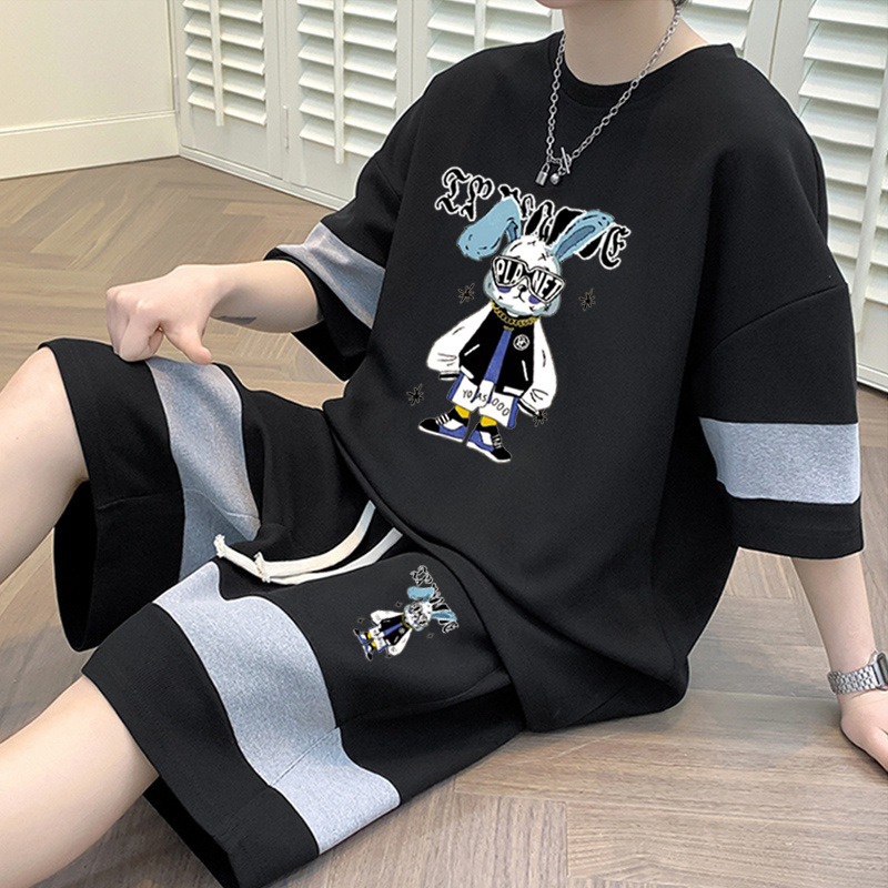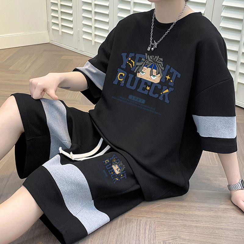 2024夏爆款时尚华夫格套装男T恤短袖短裤冰丝胖子休闲运动两件套