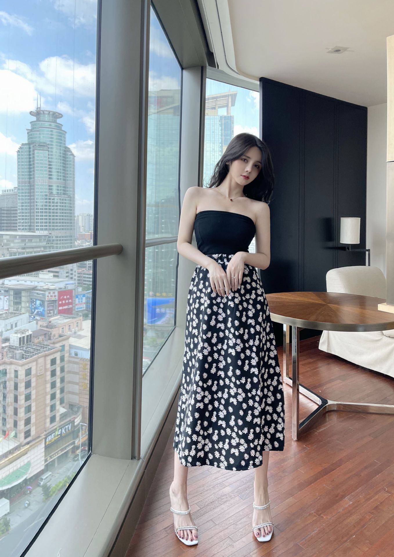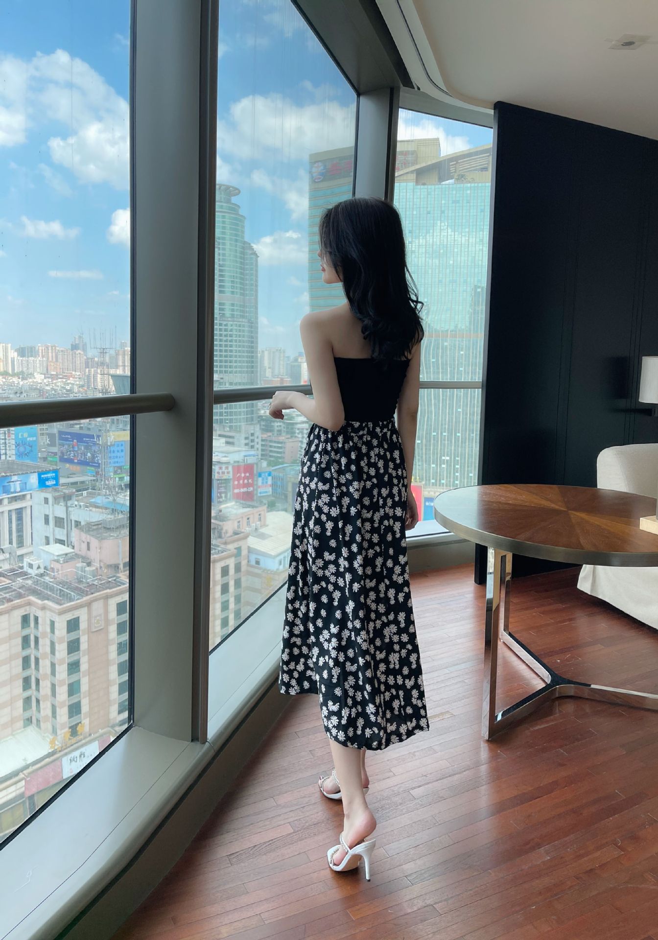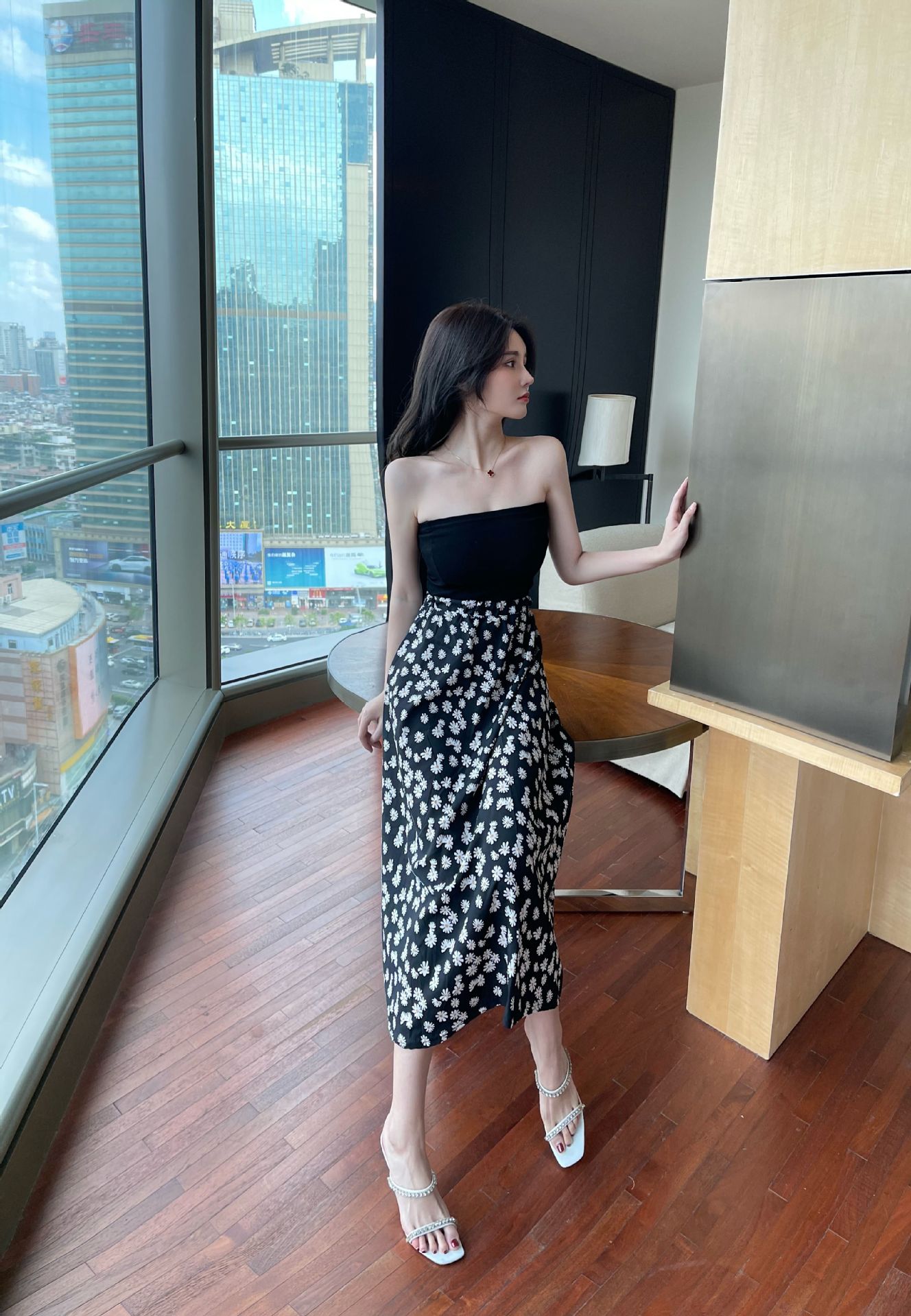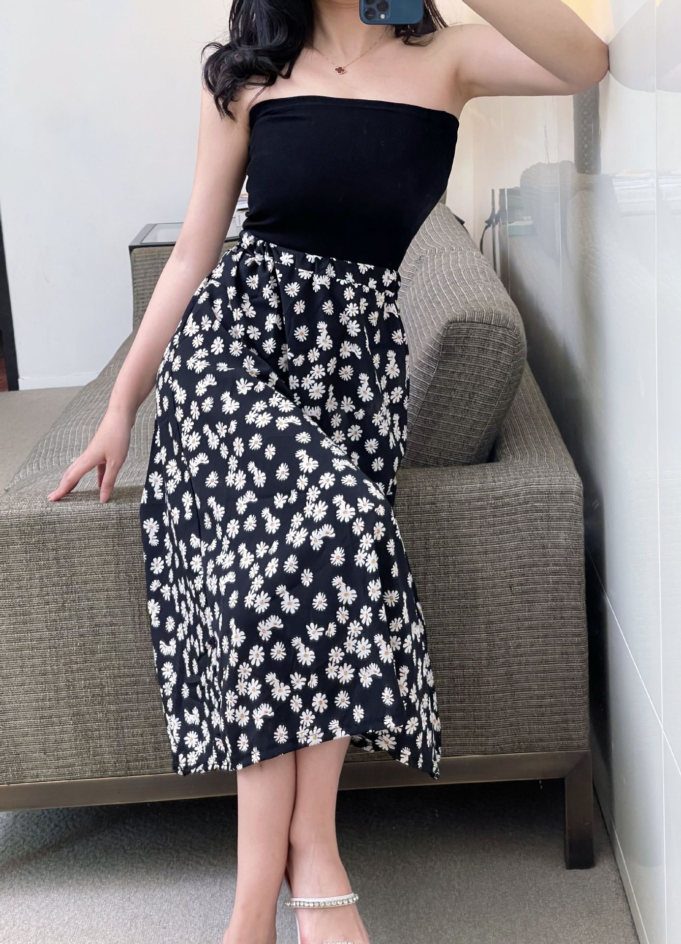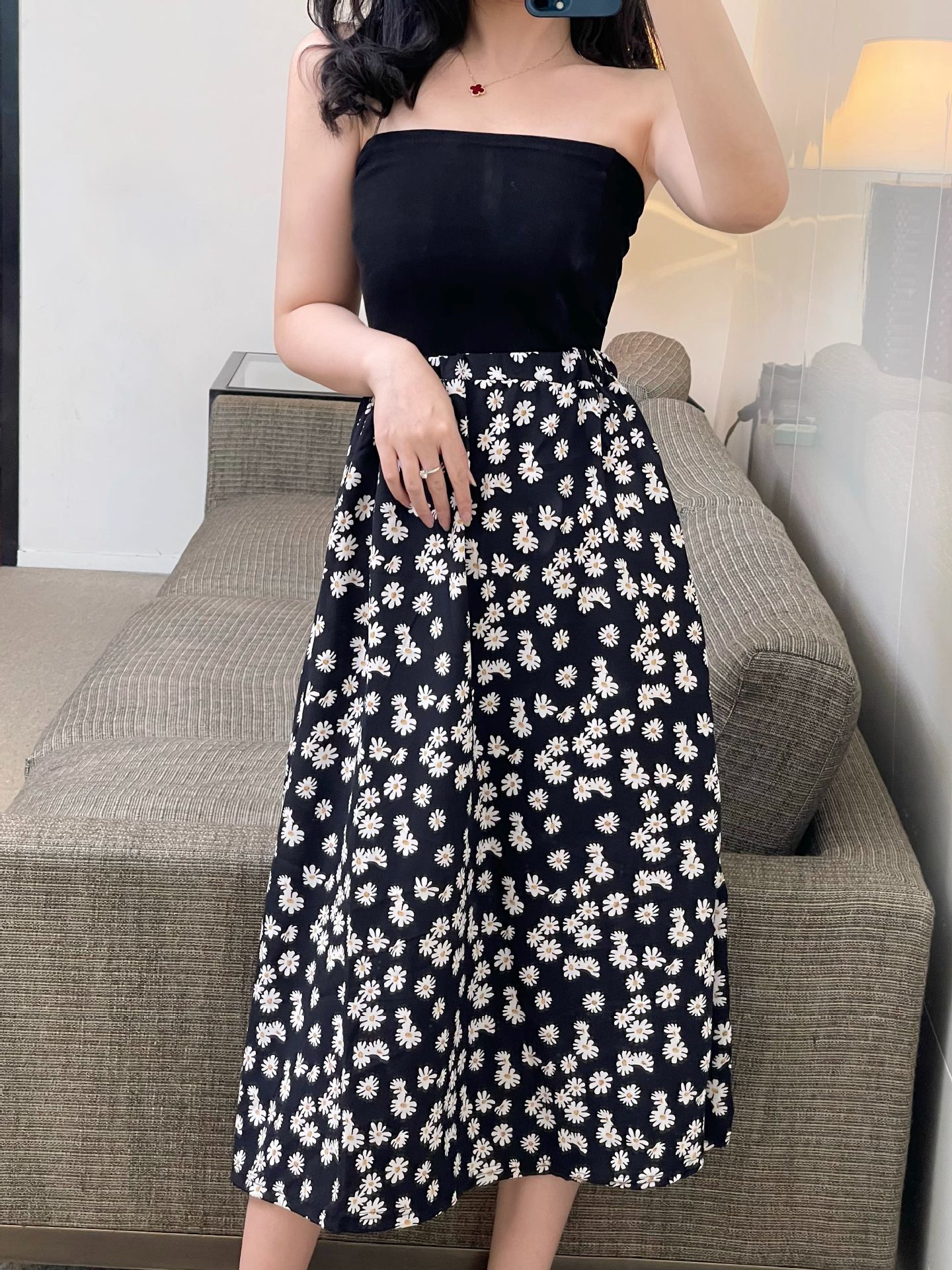 现货复古小皱菊印花半身裙高腰显瘦中长款百搭A字裙