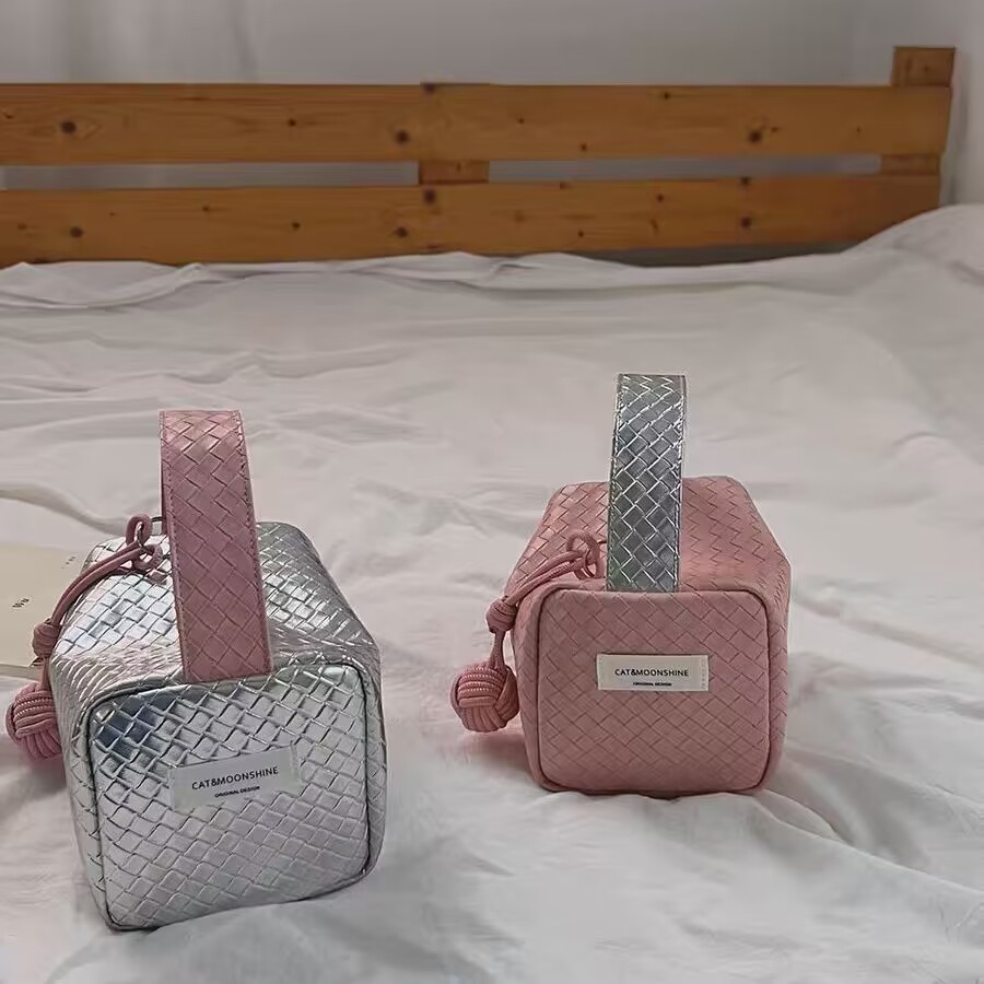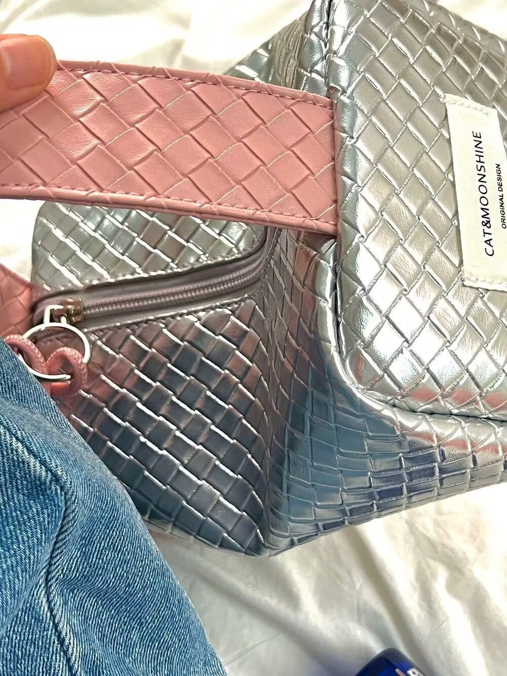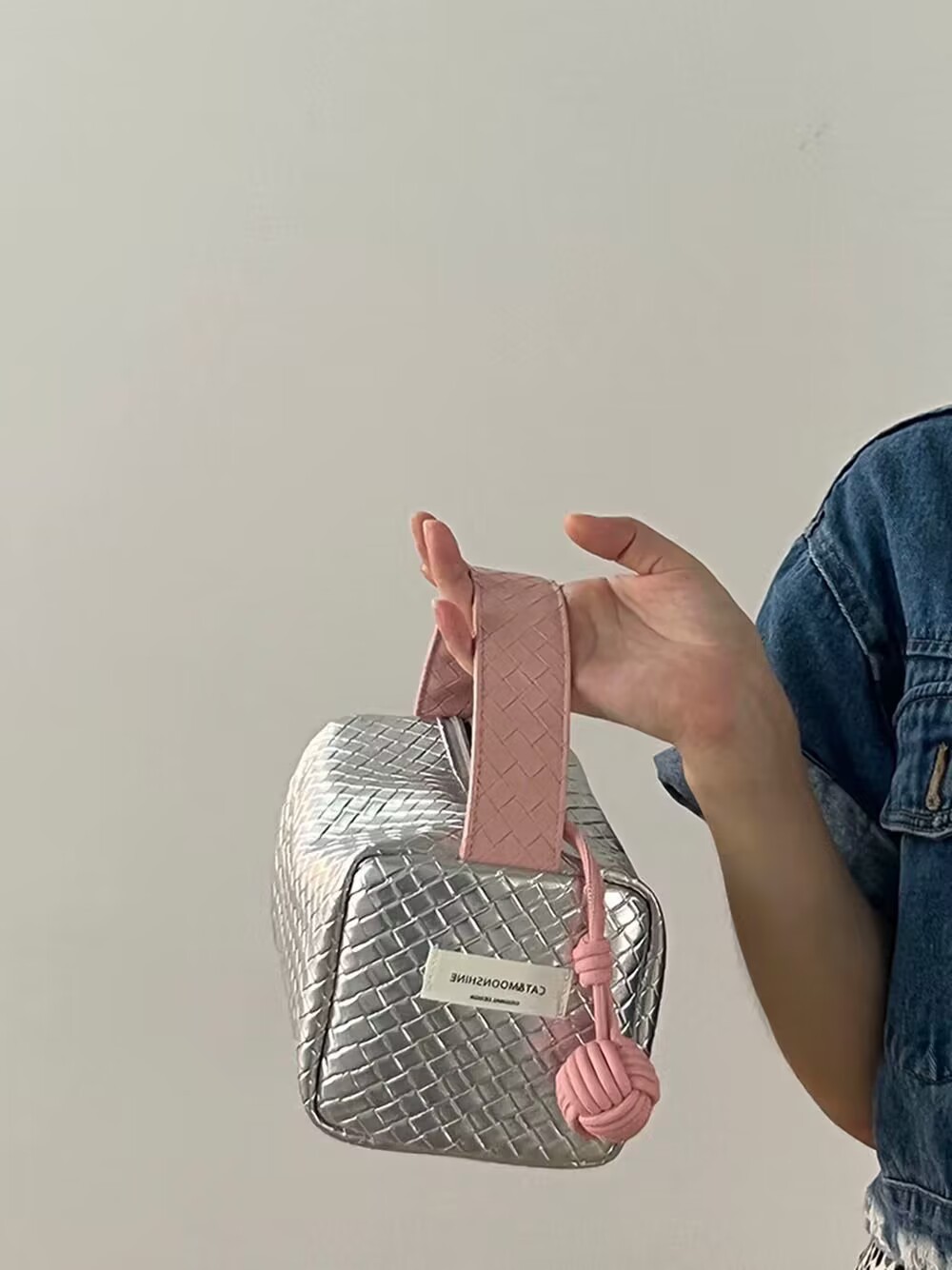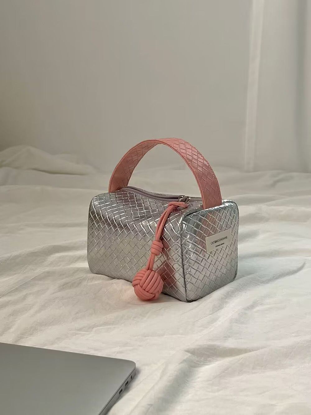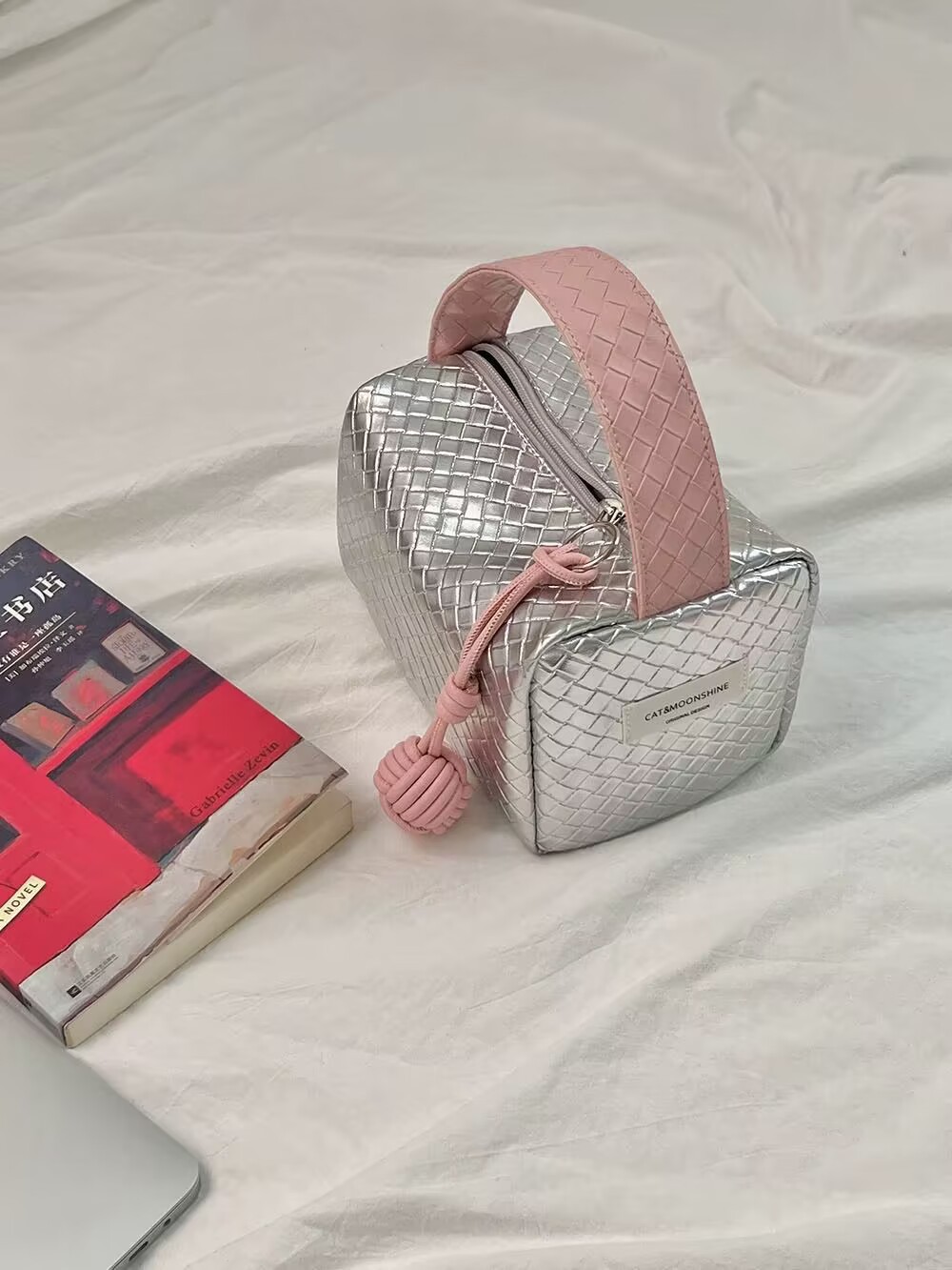 化妆包收纳包银粉拼色编织纹时尚百搭高颜值化妆包便携式手拧包