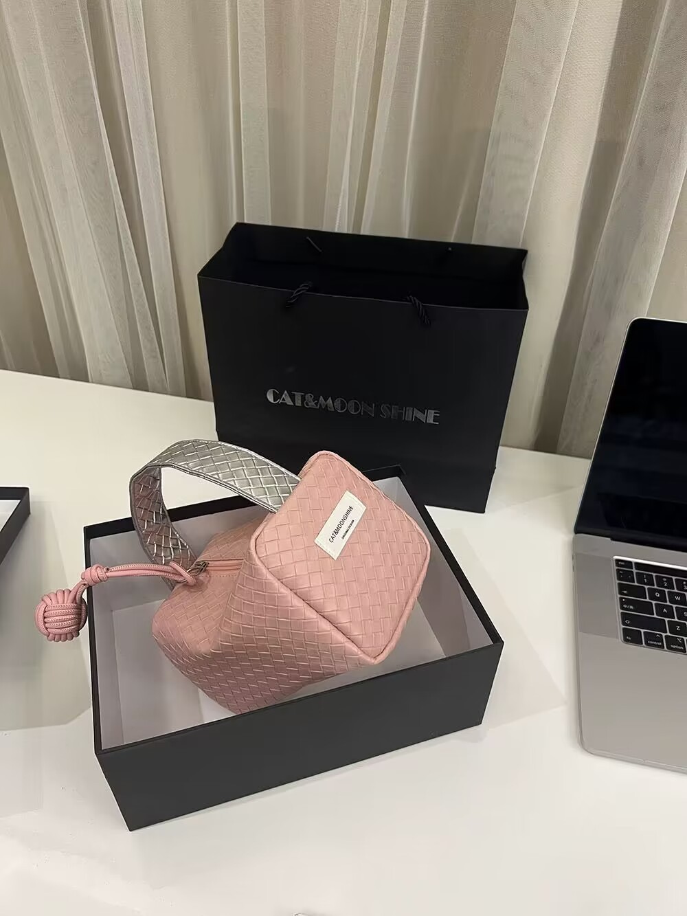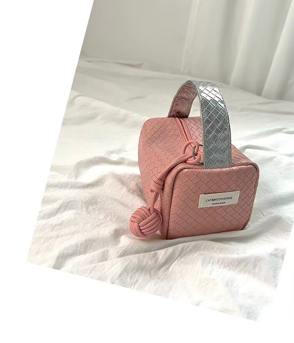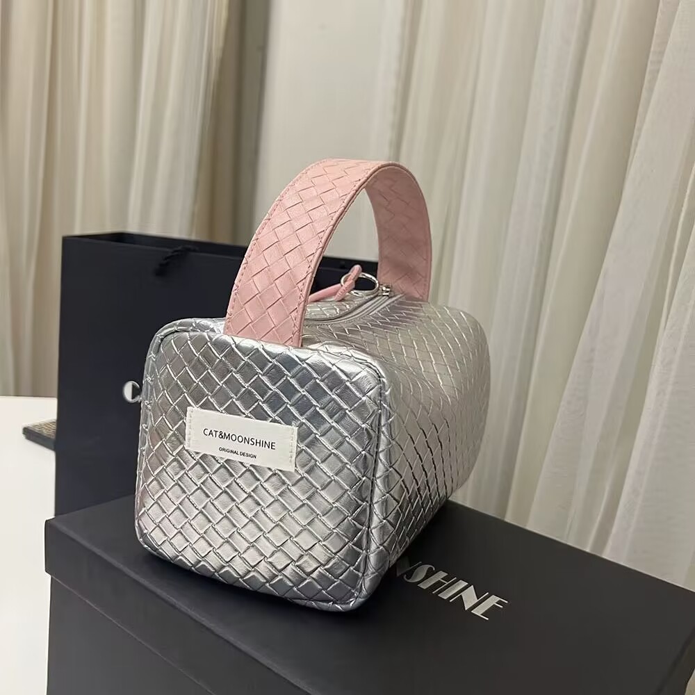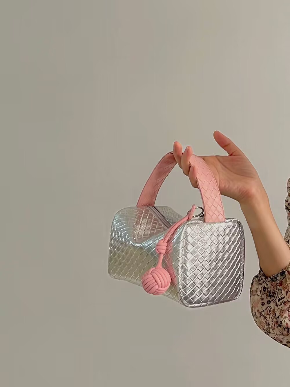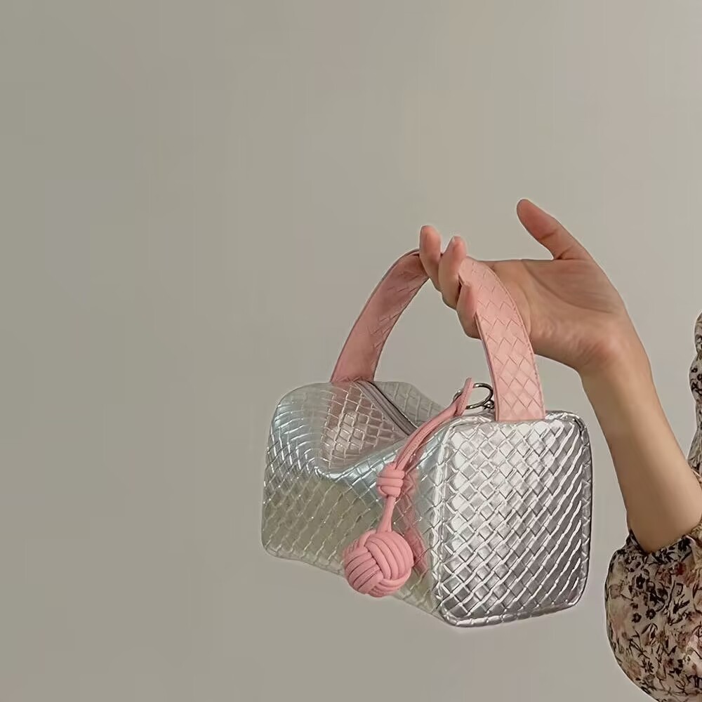 化妆包收纳包银粉拼色编织纹时尚百搭高颜值化妆包便携式手拧包