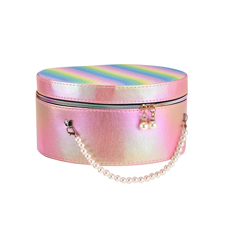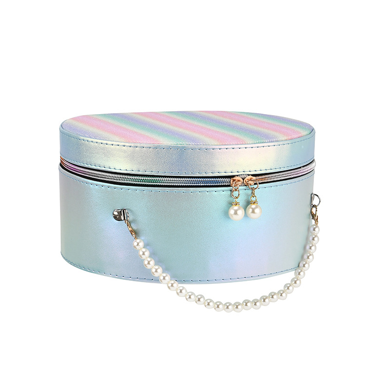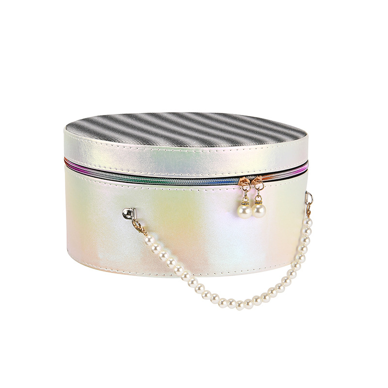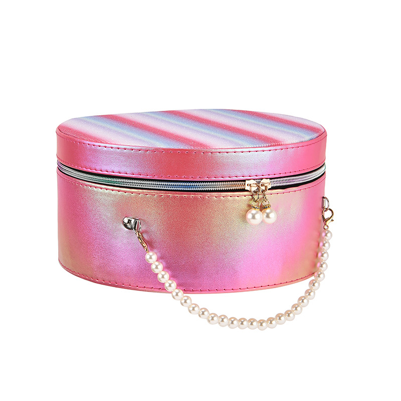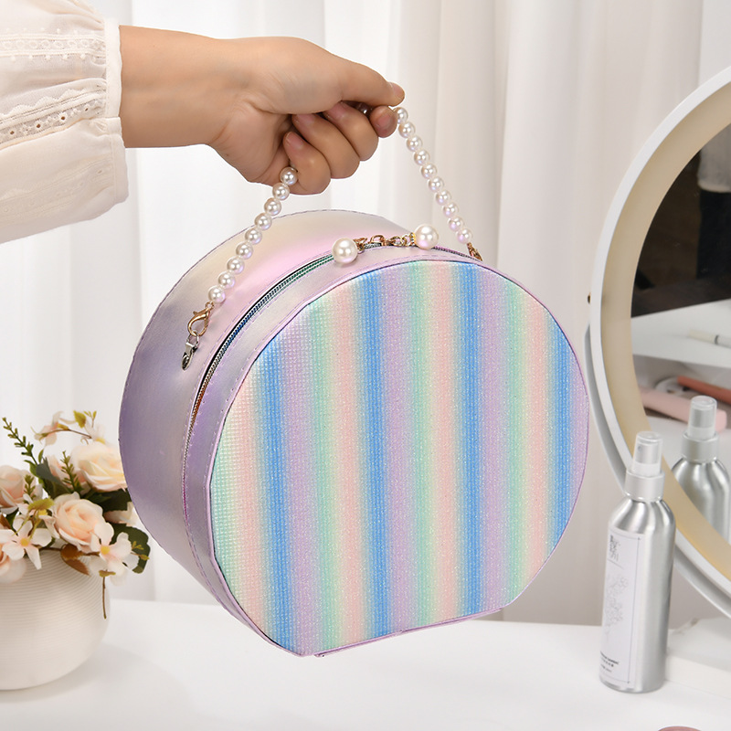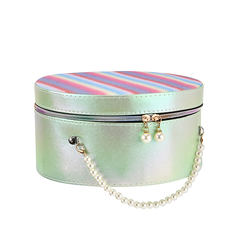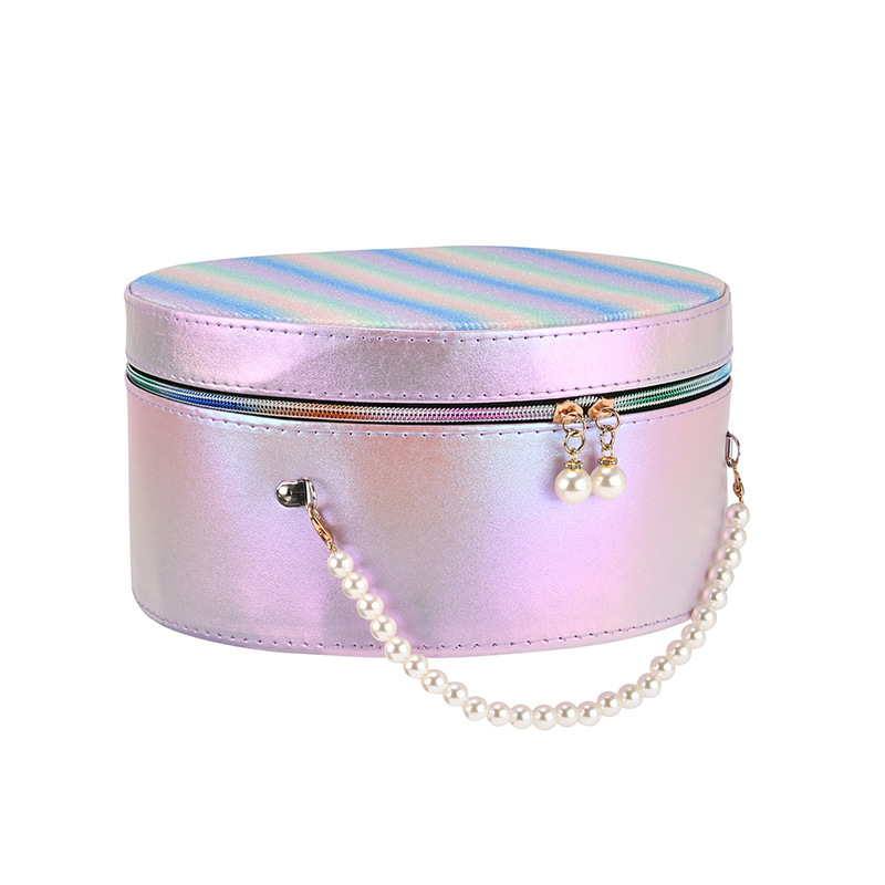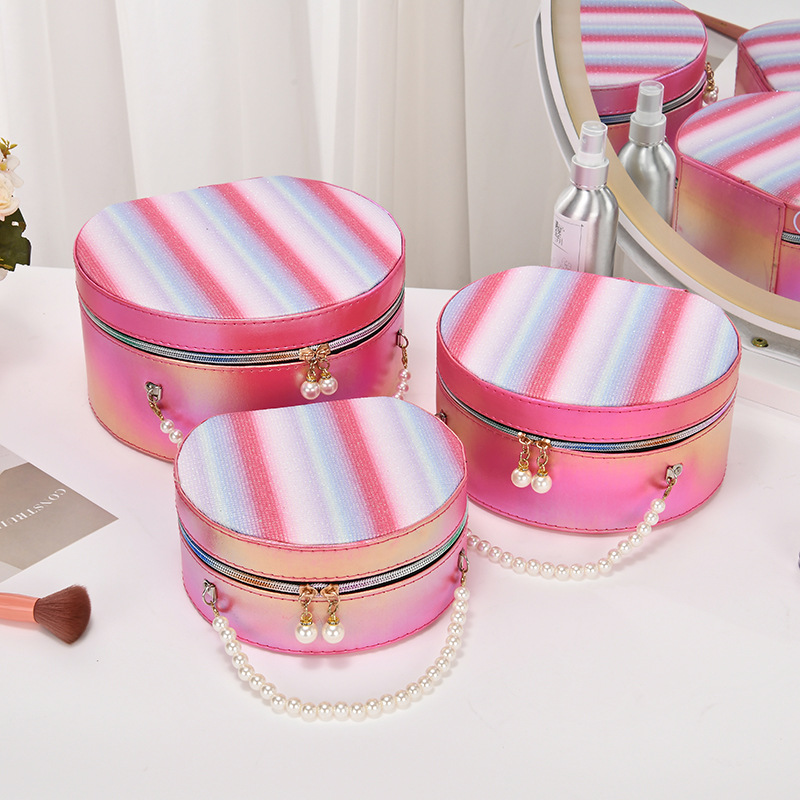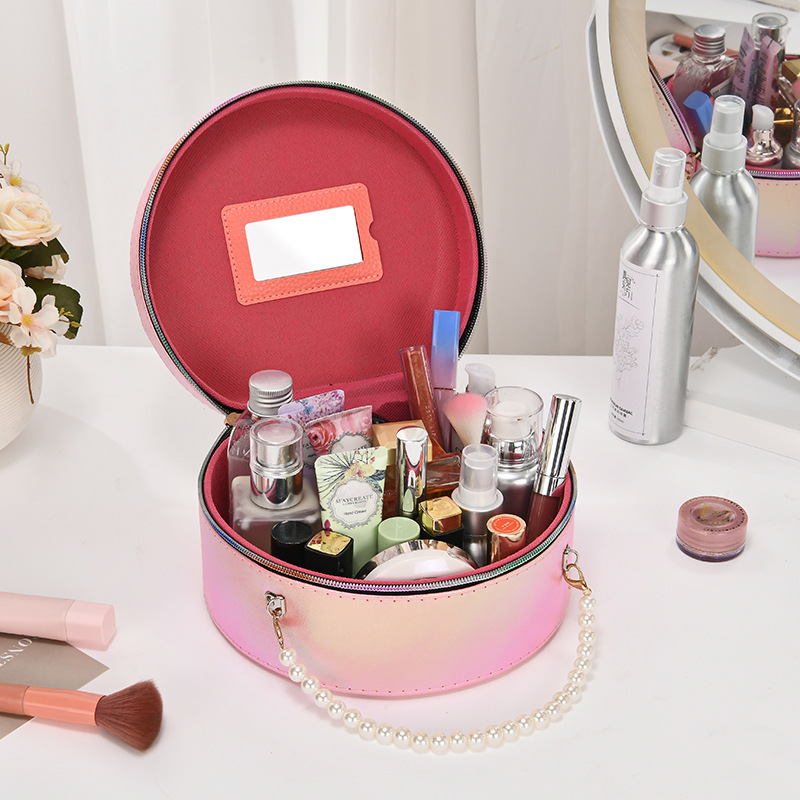化妆包大容量圆形三件套风高颜值带镜子多功能收纳携带珍珠手提